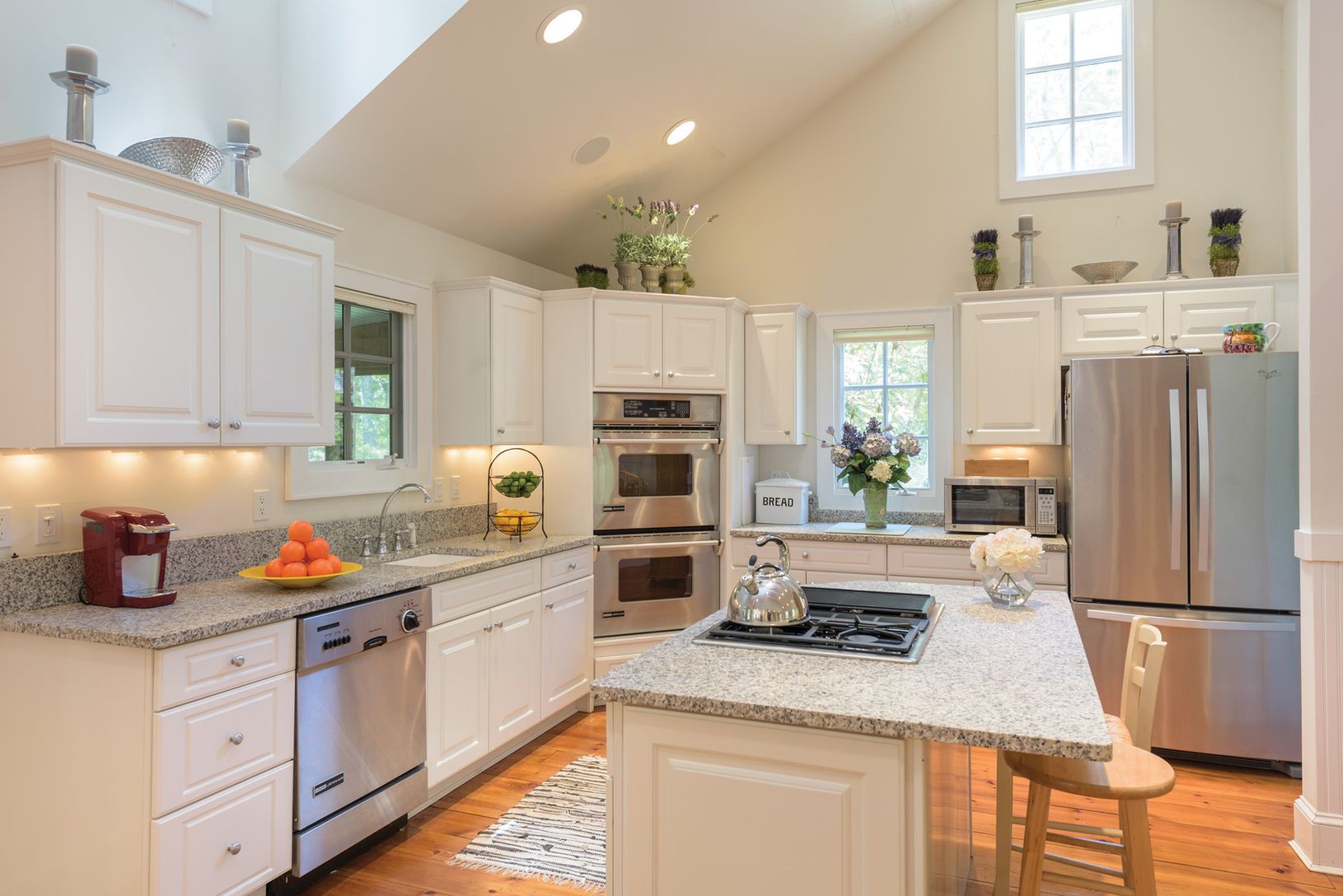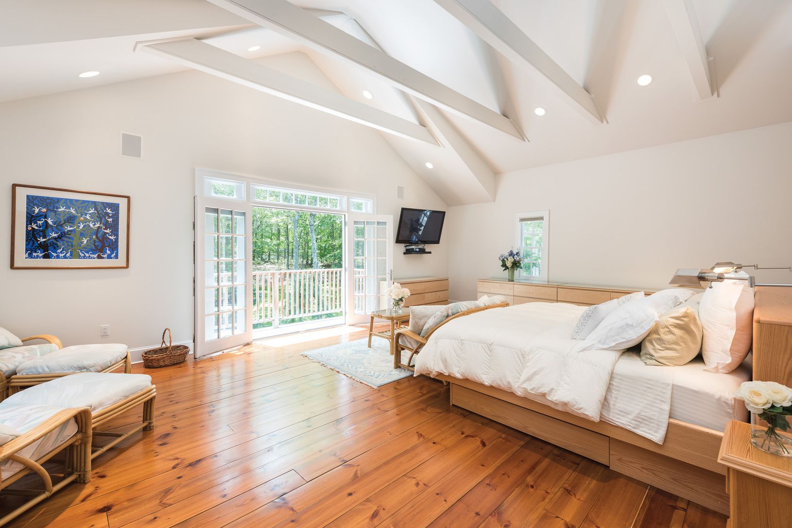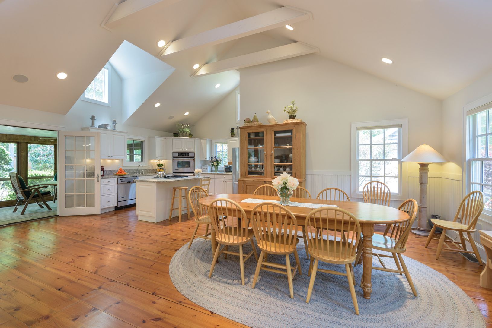 Situated on 2.2+/- acres on a deep flag lot, this light-filled four to five-bedroom, four bath home has large, airy rooms, a nice flow through the living areas and pristine wide plank floors throughout. Enter the foyer to open living room with fireplace, formal dining and eat-in chef's kitchen featuring granite countertops, stainless steel appliances and island with high end gas range, with a breakfast area on the adjacent screened-in porch re