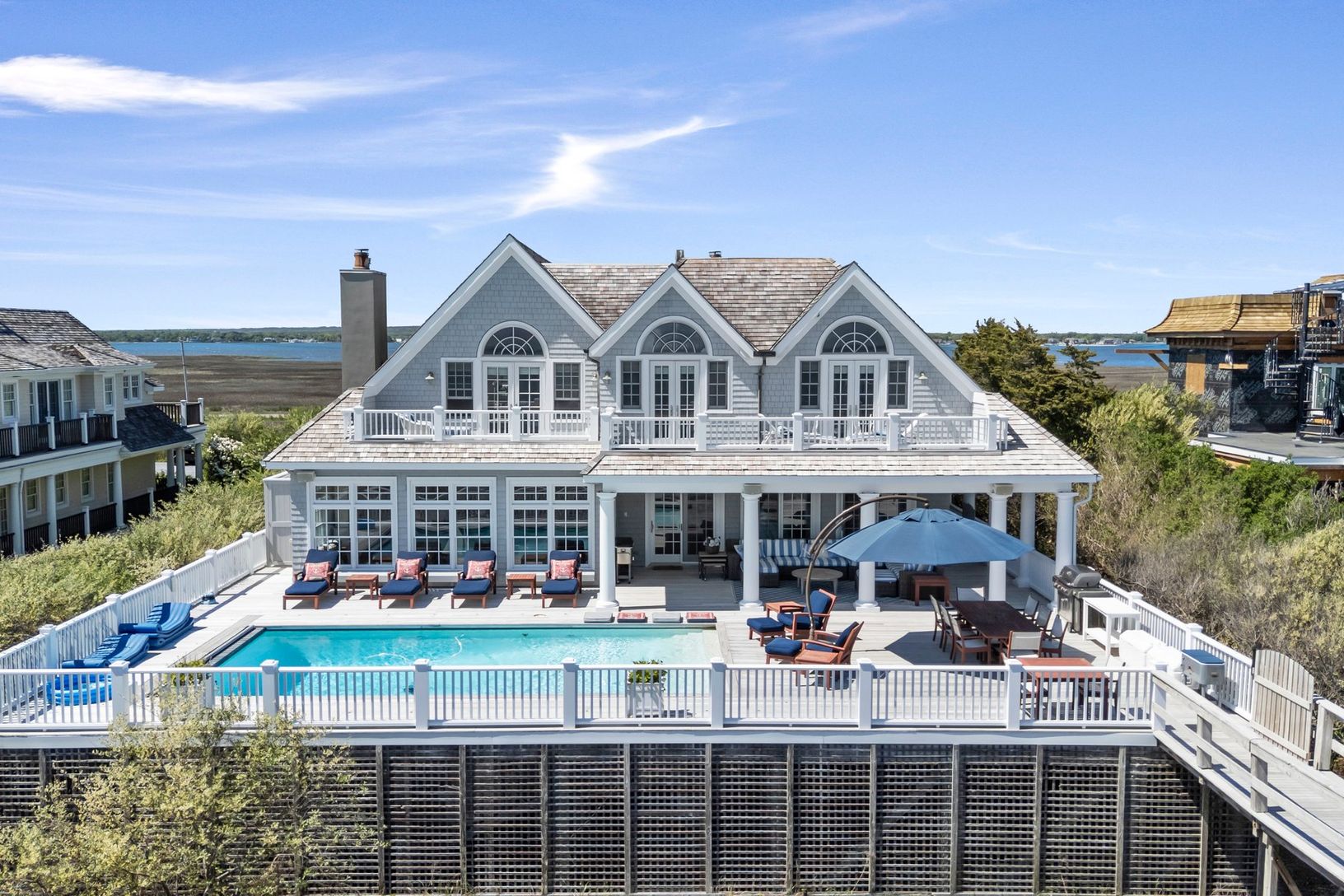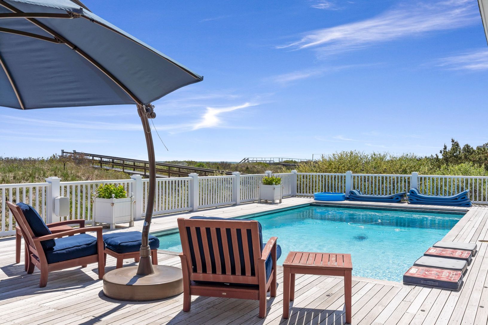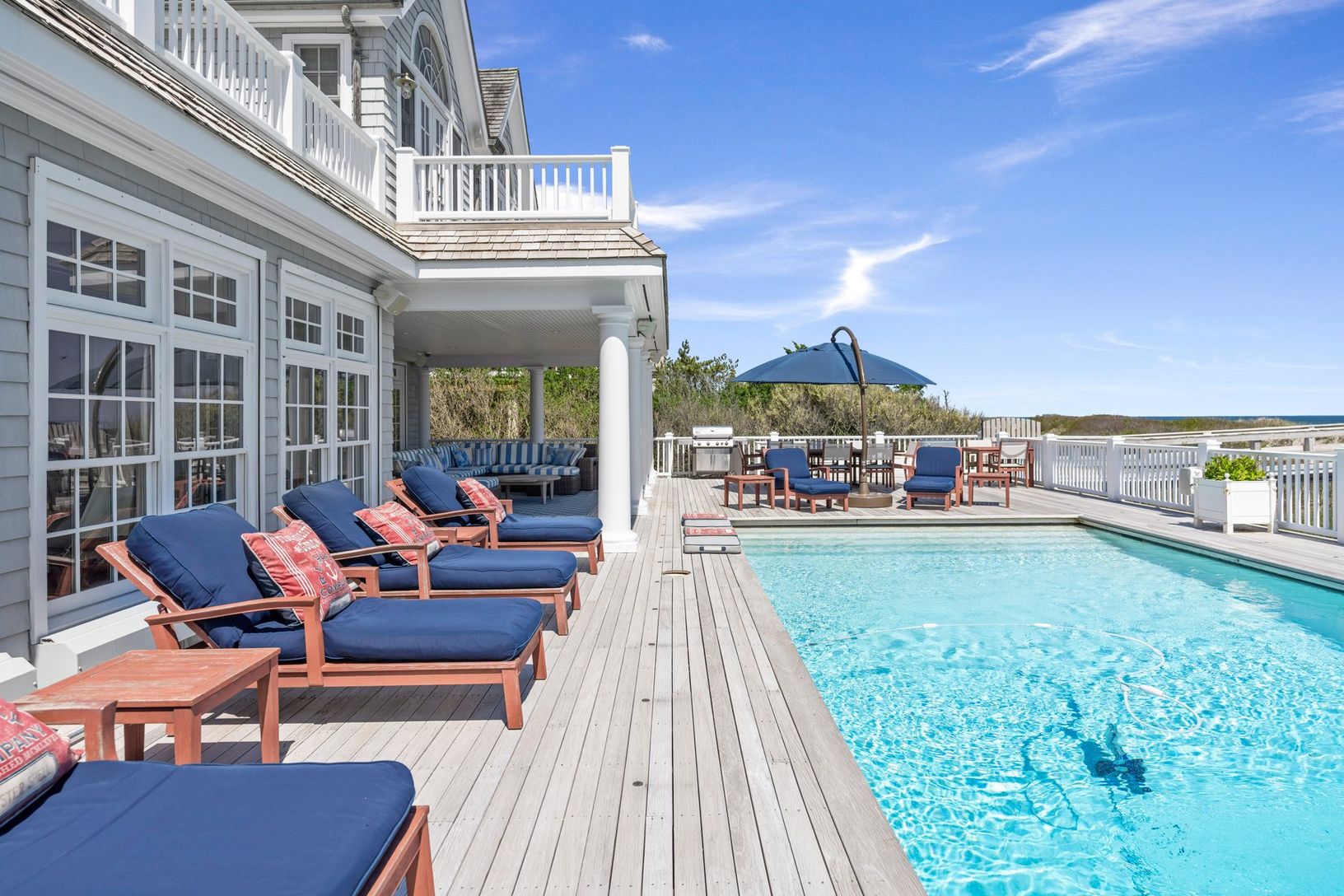 The open and inviting floor plan includes a sunlit great room, a gourmet kitchen, and seamless access to expansive outdoor spaces. The gunite pool and one of the most spacious dune decks o