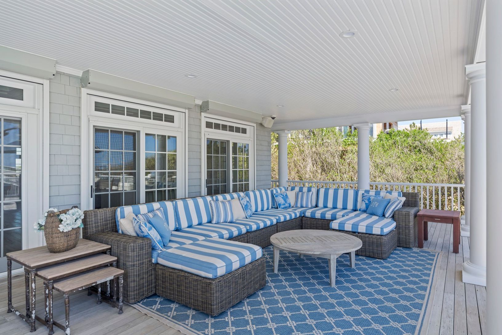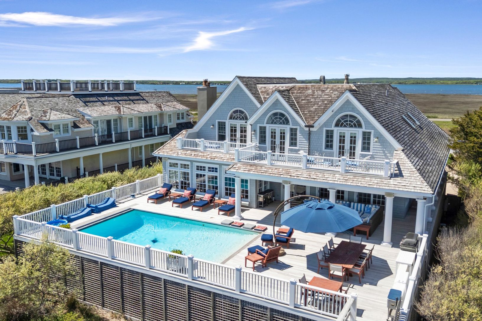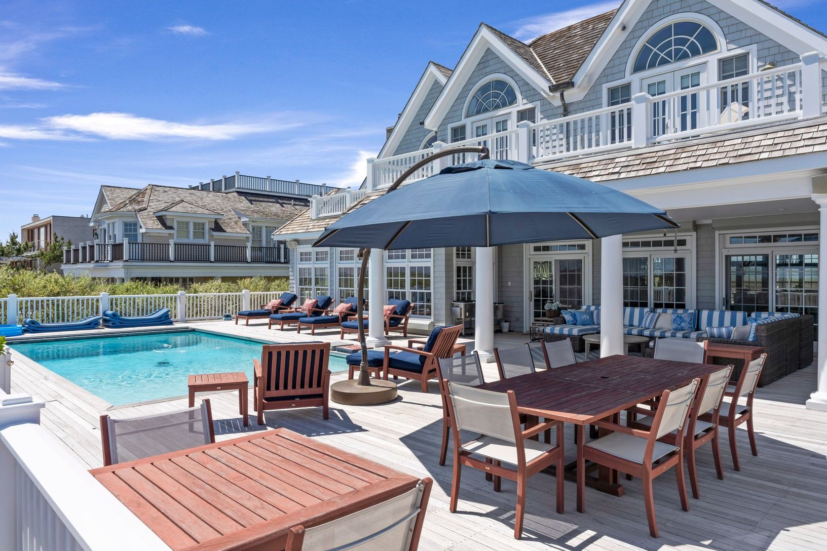 The open and inviting floor plan includes a sunlit great room, a gourmet kitchen, and seamless access to expansive outdoor spaces. The gunite pool and one of the most spacious dune decks o