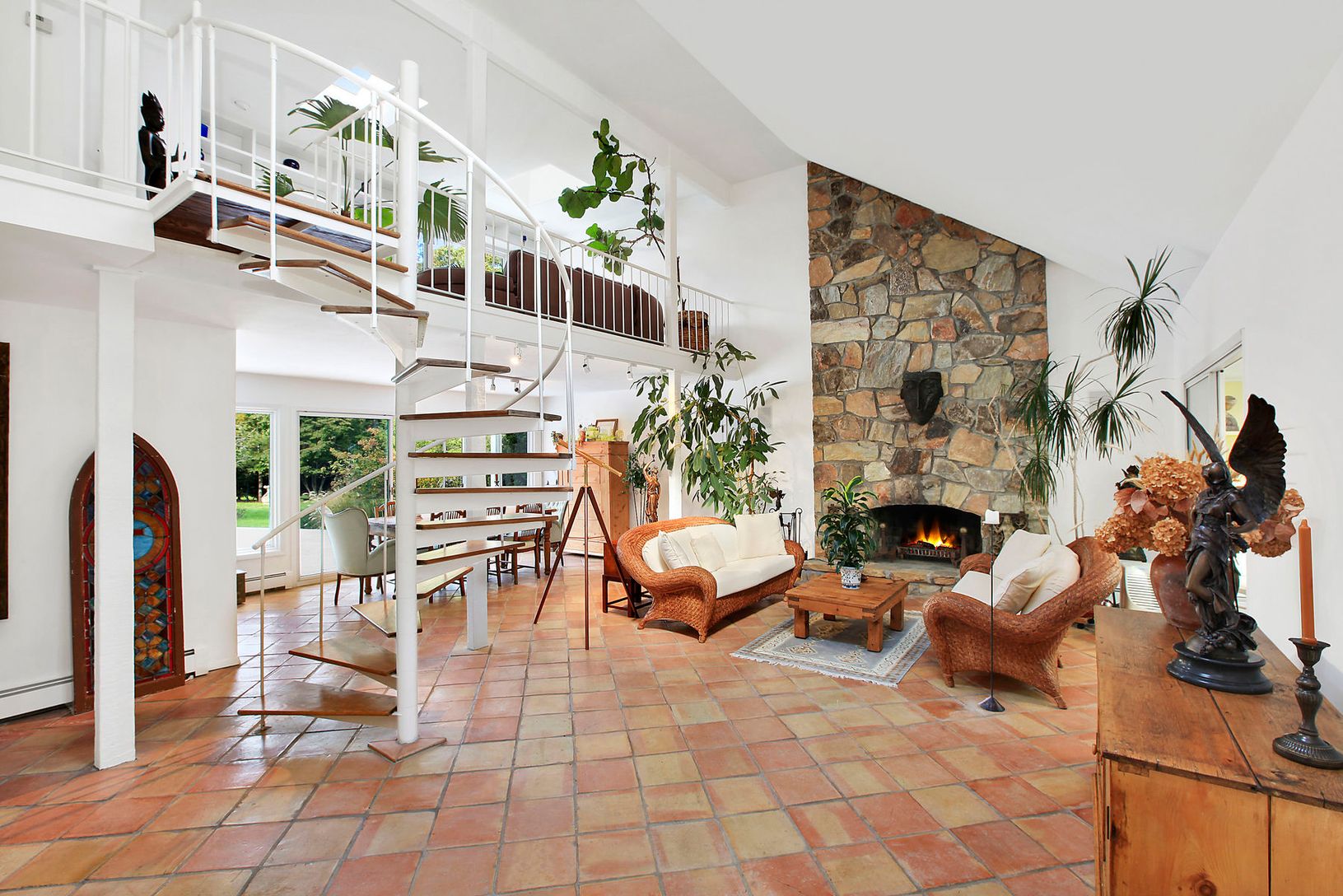 This Zen-like and light-filled 3 bedroom, 2 bath contemporary is in exceptional condition and offers an open floor plan with elegant, clean lines. On the first floor you'll find a floor-to-ceiling stone fireplace in the living room, a sunny solarium/greenhouse, dining room, country kitchen with Mexican tile floors, 2 guest bedrooms, one bath and laundry area. Take the spiral staircase to the cozy upstairs den/reading room and the spacious mast