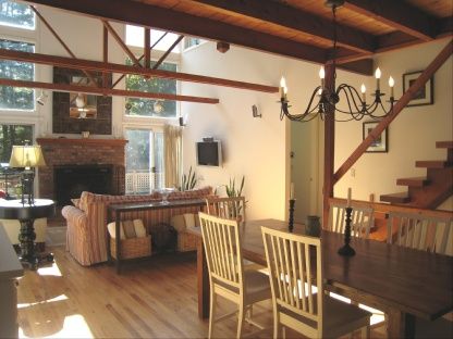 Located in the Settlers Landing area of the Northwest Woods. This three bedroom, two bath contemporary barn features a loft like great room with dramatic beams, lots of sun and charming ambiance. In addition there is a second story lofted area for additional living, den, or office space. A generous sized deck overlooks the full size pool and adds to the relaxing atmosphere. A finished basement provides extra room for entertaining. A must see