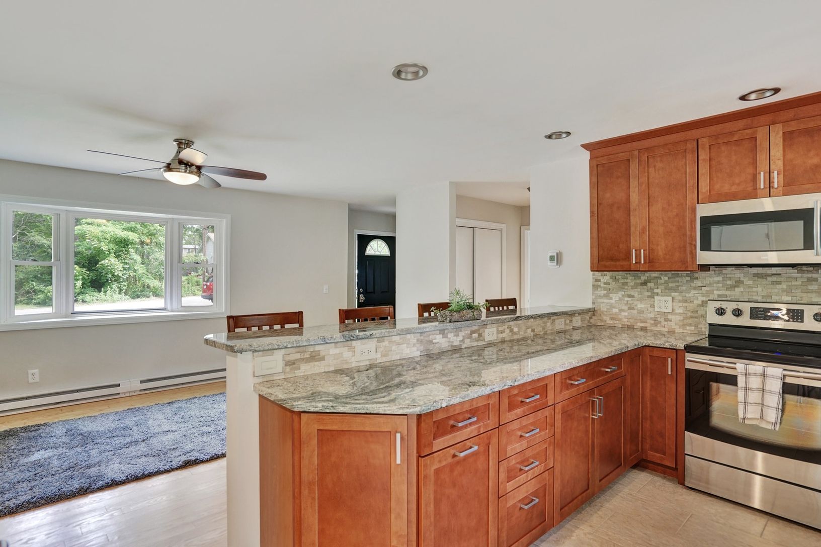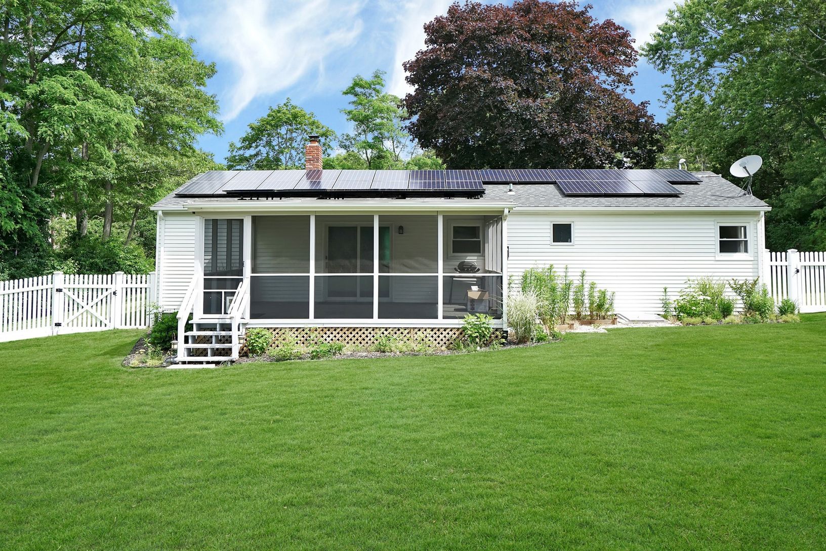 with electric bills of $13 a month. Half acre ranch, newly renovated. Open kitchen/dining room area. Granite kitchen with Cherry wood cabinets, SS appliances, brick fireplace, full bath, separate laundry room, wood floors, large enclosed screened porch. Absolute showplace.