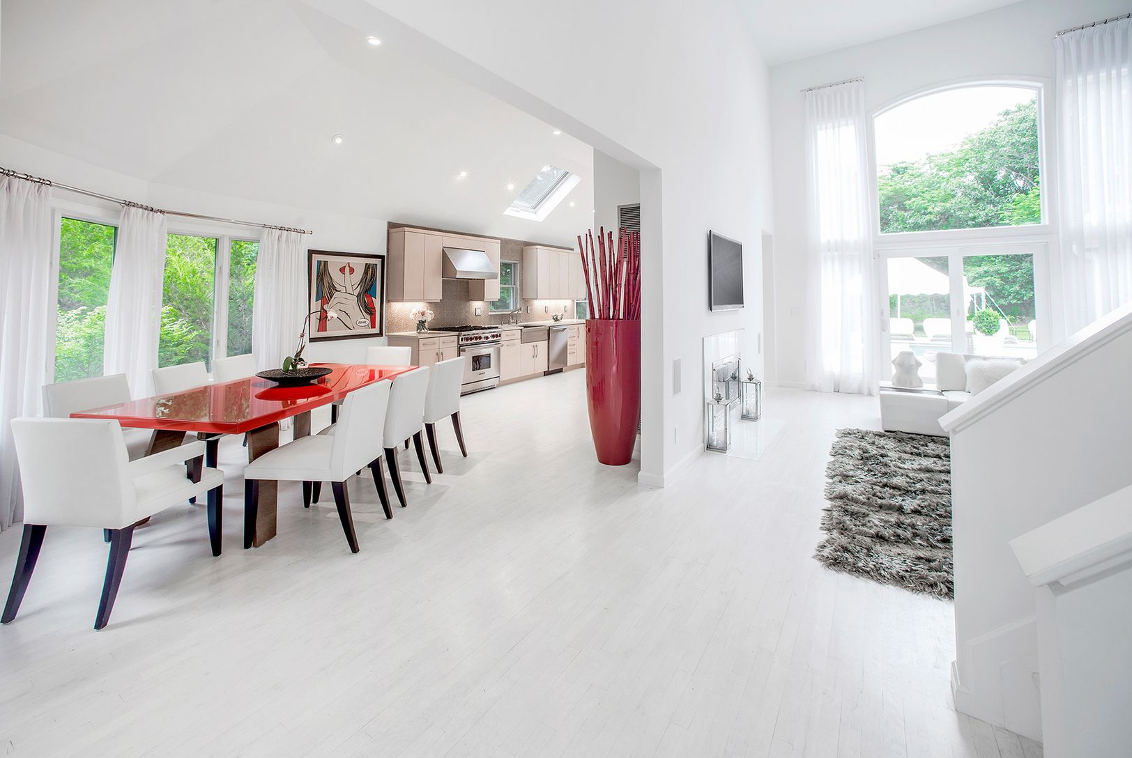 Renovated to perfection, this designer home is sited on very private lot backing a reserve in Bridgehampton. The interior spaces are polished to the highest standards. Bright floor-to-ceiling windows illuminate the double-height living room which flows into the professional-grade kitchen and spacious dining room. Top of the line appliances include Sub-Zero refrigerator, Wolf stove, Miele dishwasher, and wine cooler. The postmodern home offers