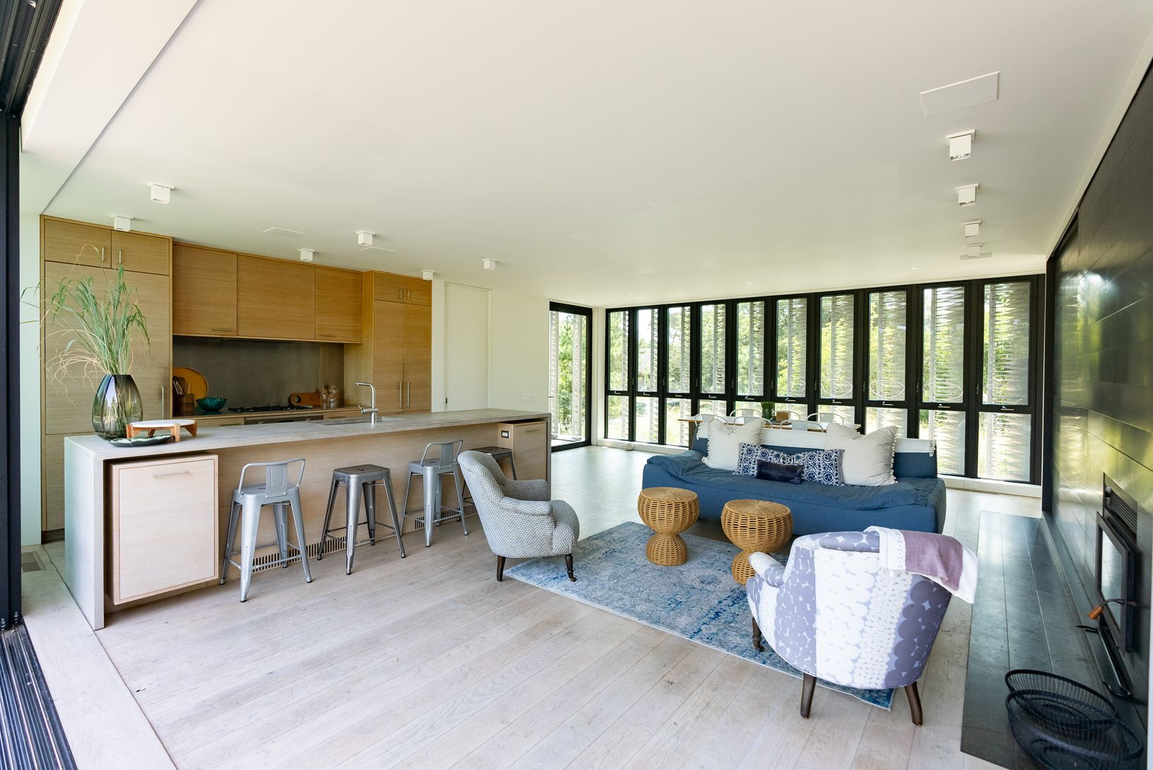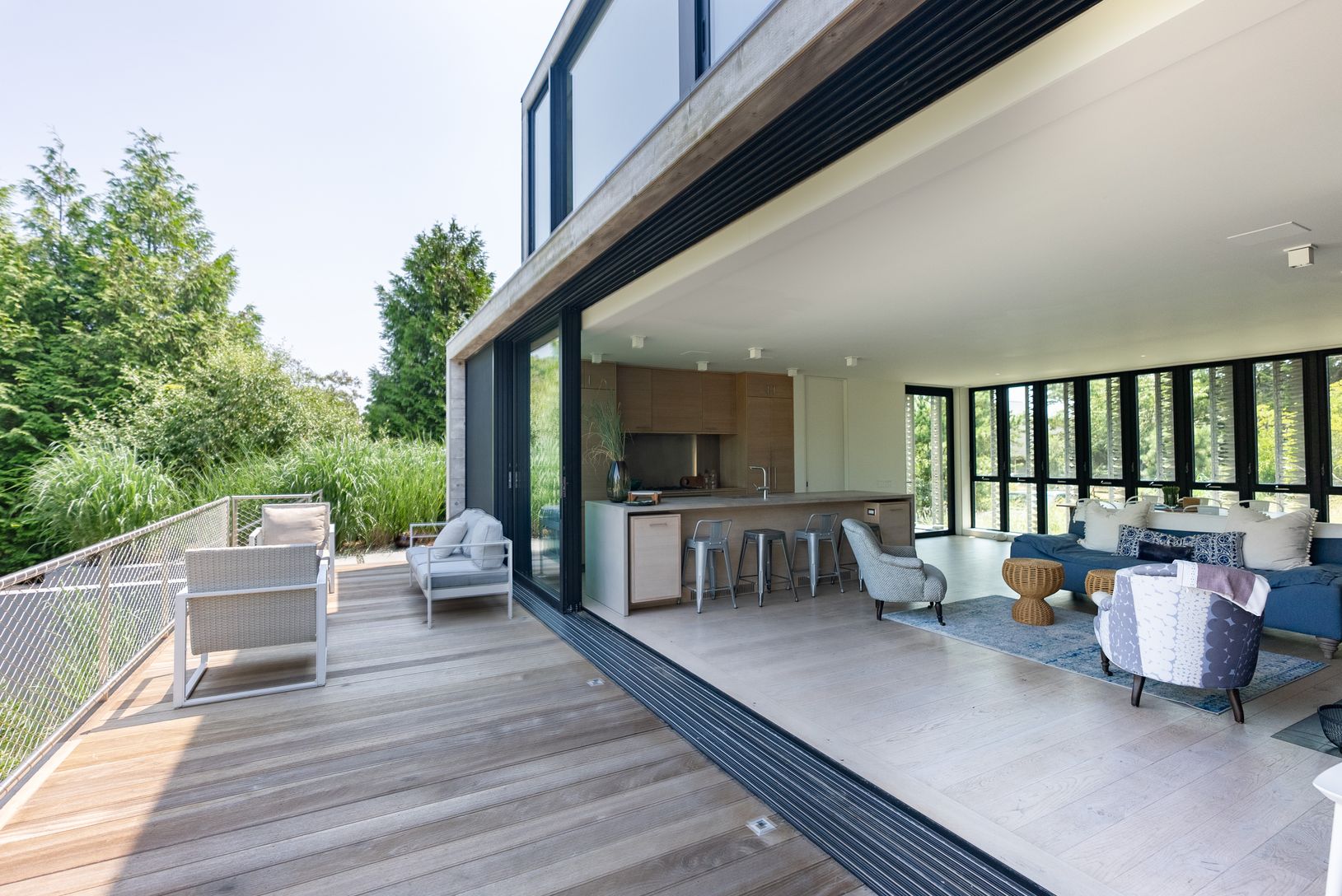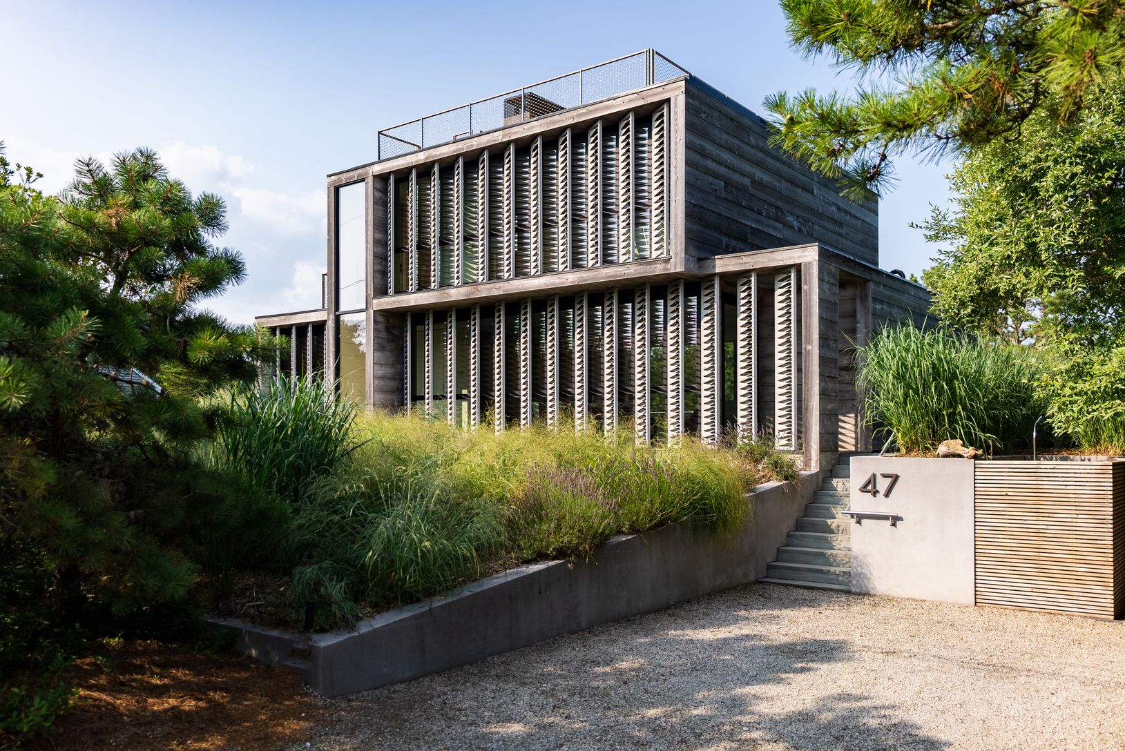 Designed and built in 2015. This striking Bates Masi + Architects modern home in the Amagansett Dunes provides unmatched style, comfort and beauty, just a few houses from a private ocean beach. The louvered facade, which covers the West side of the house, not only provides breathtaking visual appeal, but filters warm natural light and a cool breeze throughout the home, all the while providing complete privacy. Enter the home a few steps up, pa