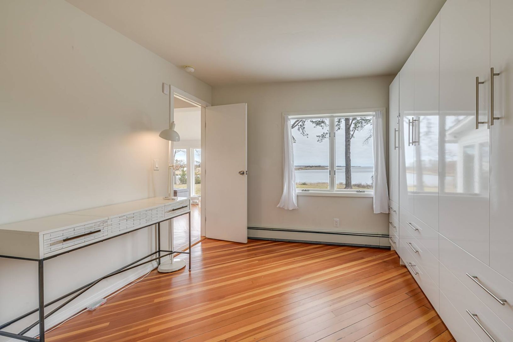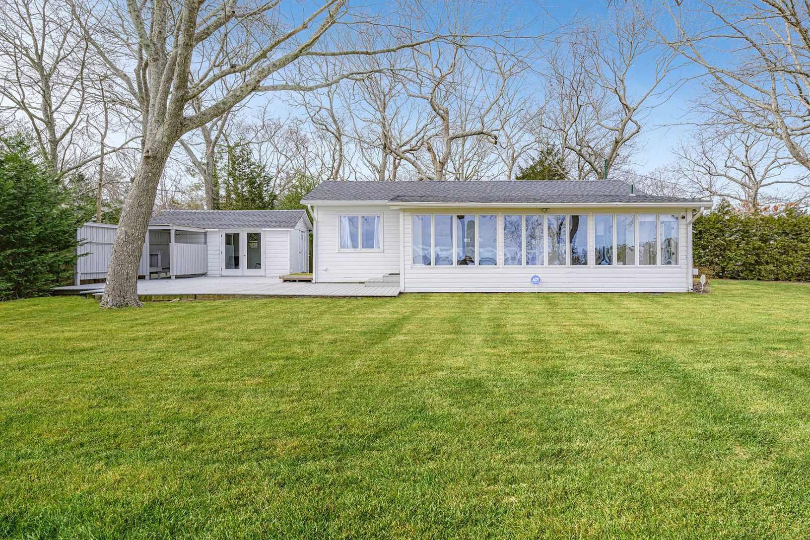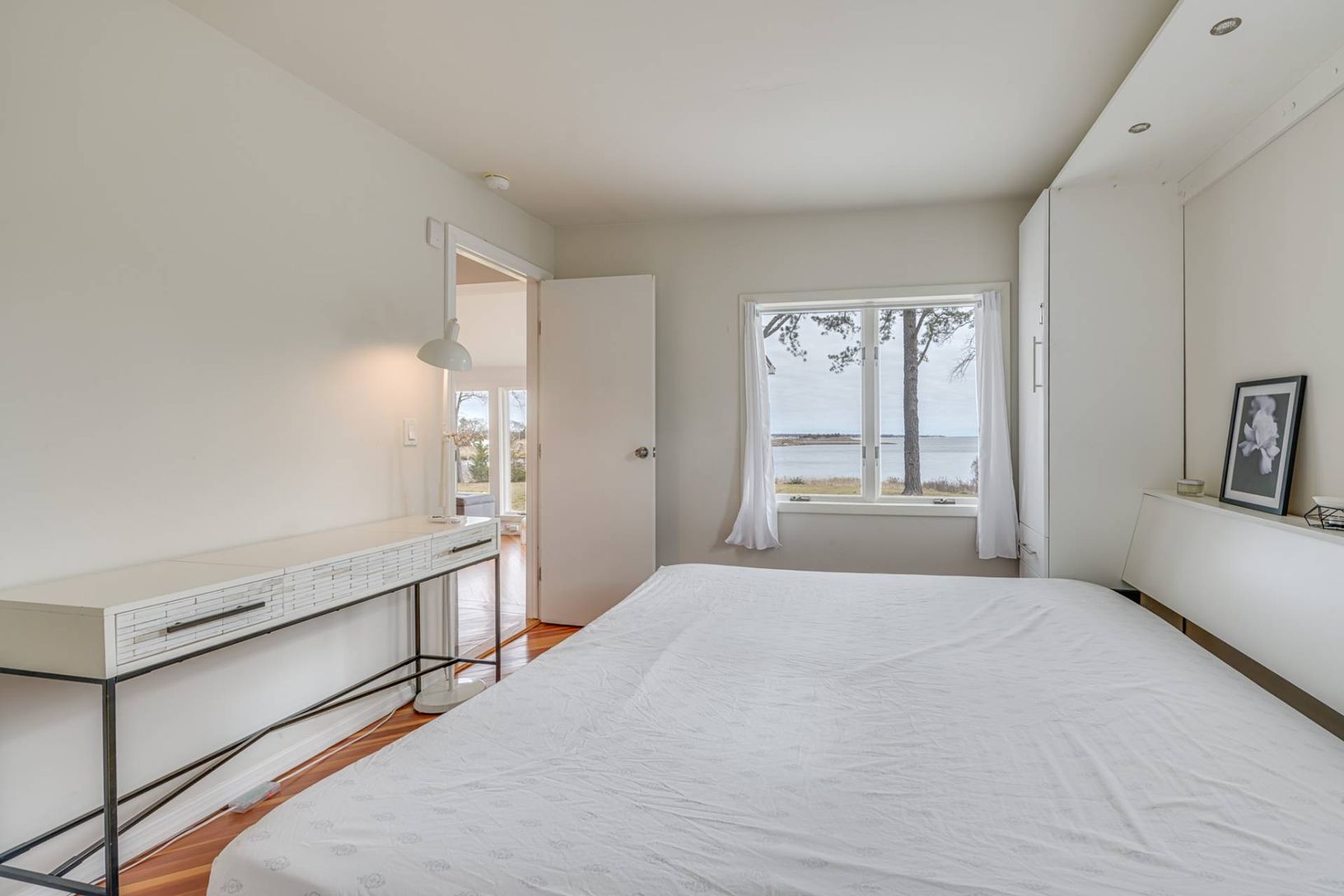 This 1 bedroom, 1.5 bath waterfront cottage is set on .57+/- acre with beautiful unending views of Reeves Bay. Upon entry you are drawn to the wall of large casement windows that lure you to the water front, decking, yard and surrounding natural land with indigenous landscape. Tons of natural light create a setting that is peaceful and comforting. The open floor plan is made up of a large living room, eat in kitchen with island seating, gas co