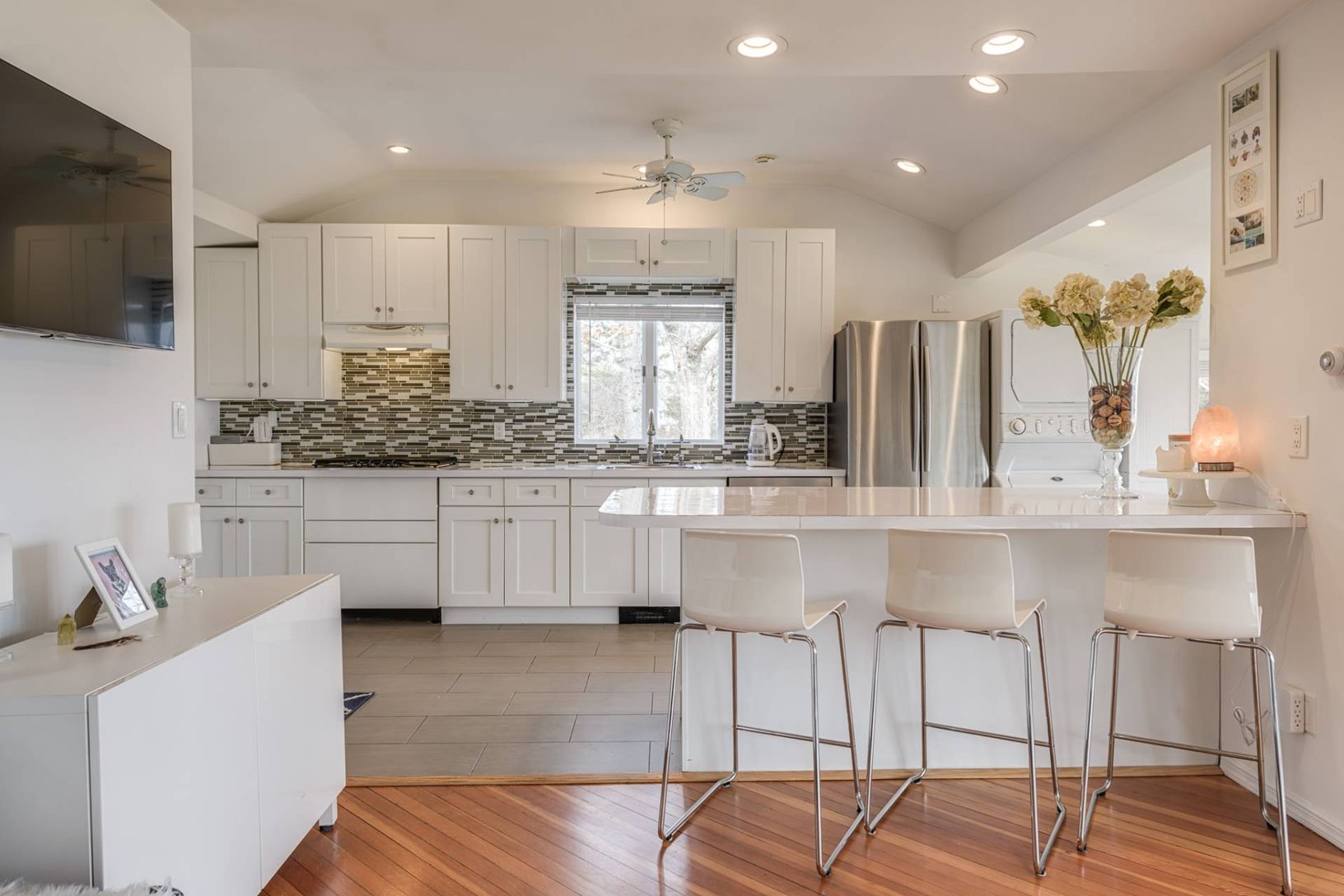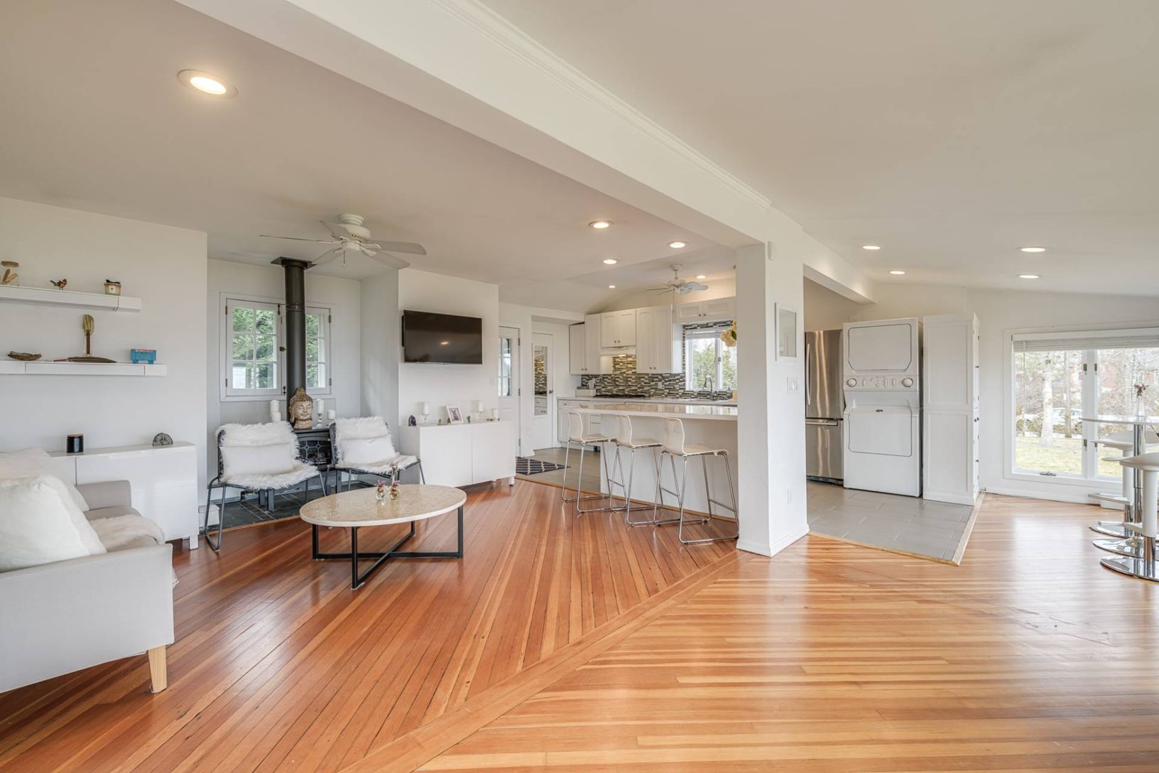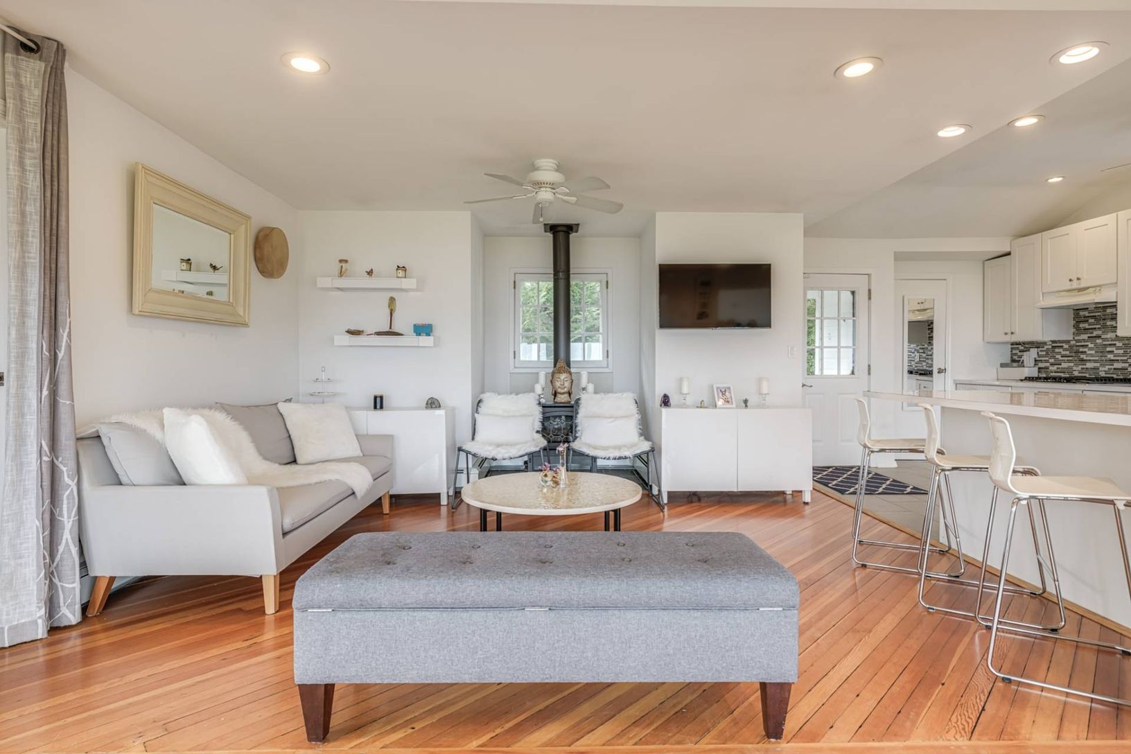 This 1 bedroom, 1.5 bath waterfront cottage is set on .57+/- acre with beautiful unending views of Reeves Bay. Upon entry you are drawn to the wall of large casement windows that lure you to the water front, decking, yard and surrounding natural land with indigenous landscape. Tons of natural light create a setting that is peaceful and comforting. The open floor plan is made up of a large living room, eat in kitchen with island seating, gas co