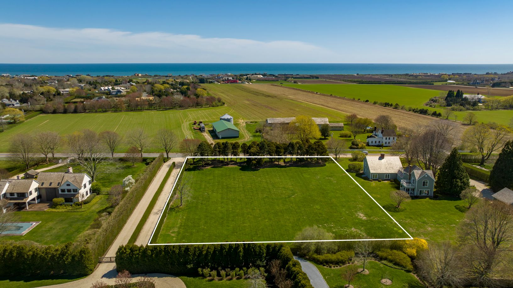 Nestled in the prestigious enclave of Sagaponack South, 480 Hedges Lane. This fully cleared 1.47-acre parcel boasts meticulous landscaping and presents the opportunity to build a ±6,267 Sq. Ft. main residence, accompanied by a ±940 Sq. Ft. accessory structure and pool. Enjoy panoramic views of the adjacent ±33-acre agricultural reserve and distant ocean vistas. For those seeking additional space and flexibility, the adjacent 1.38-acre parcel w