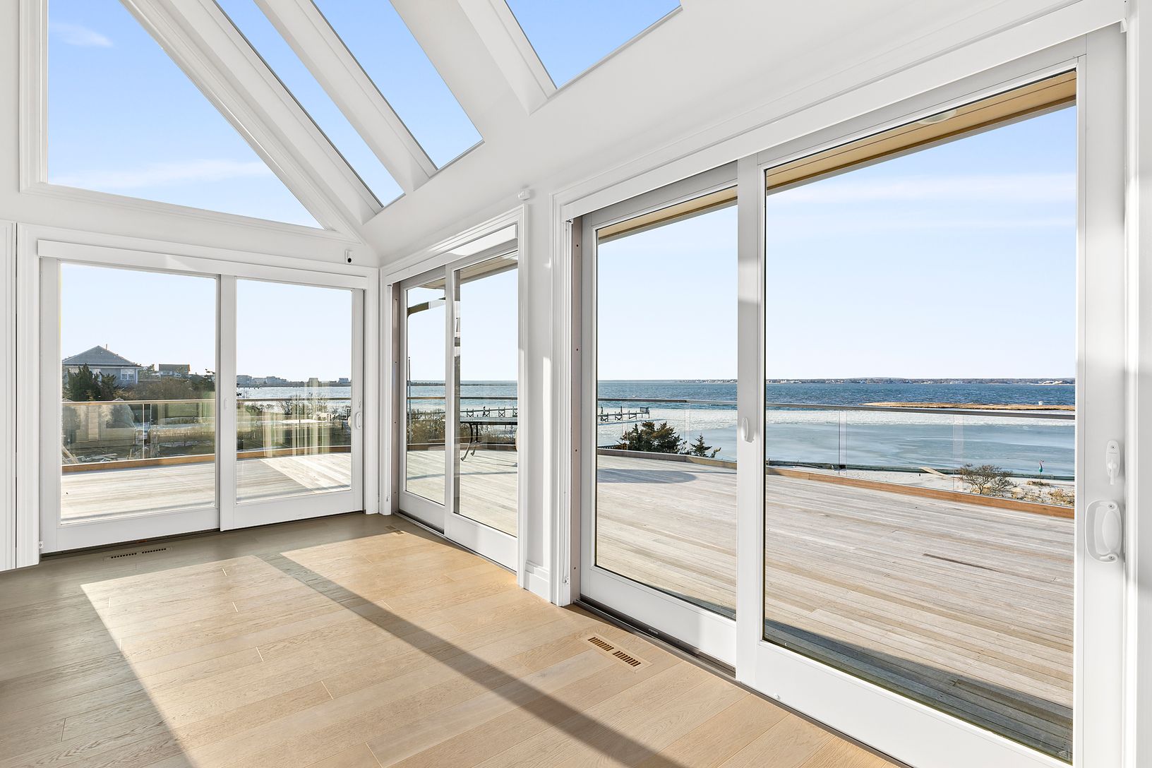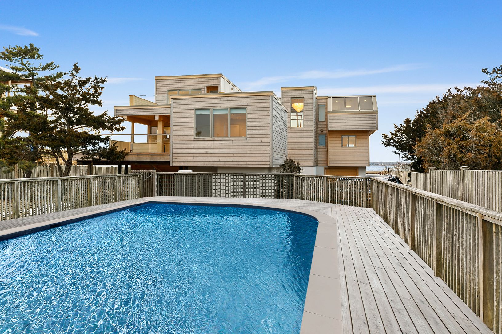 One of a kind, spectacular waterfront. Private cove, architectural details throughout. Down to the studs renovation, new windows, Austrian white oak floors, glass railings inside and out. Dune Road contemporary. 5 bed, 4 1/2 bath, huge mahogany decks all around. Sparkling views from every room. Gunite pool, rare bay front bulkhead, gas fireplace, walls of glass with vista views, deeded beach access. Marble bathrooms and kitchen perfect fo