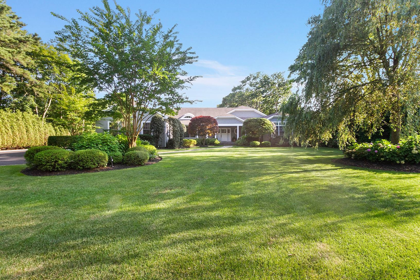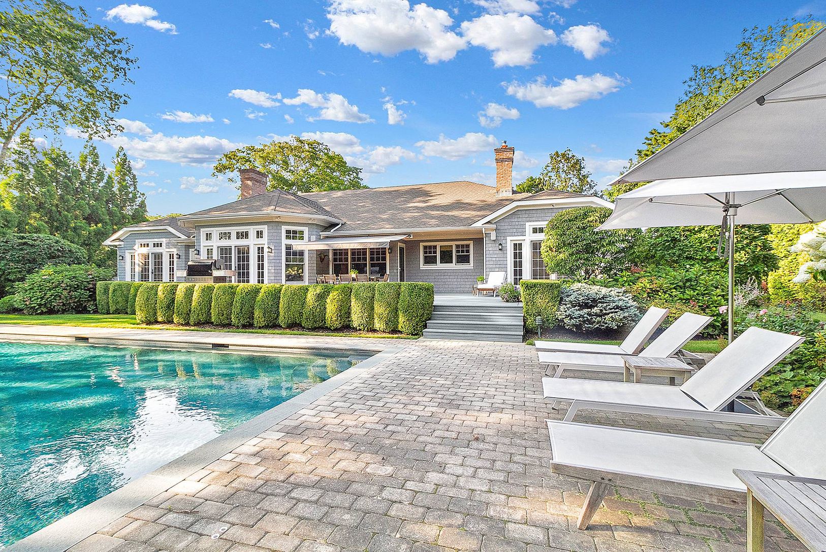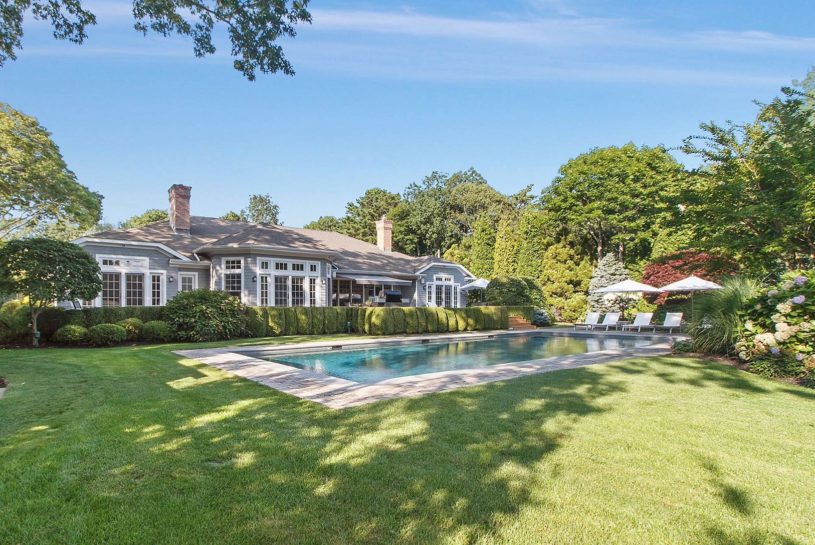 Quogue Village premier offering of the perfect July rental. The fun begins with an oversized heated, gunite pool, Har-tru tennis court, and basketball. Located on a remarkable 1-acre plus property the grounds are truly park-like.