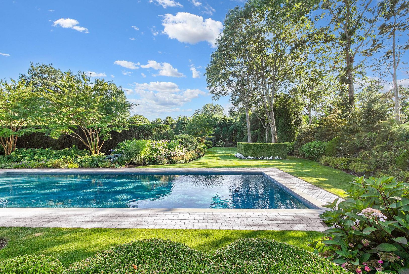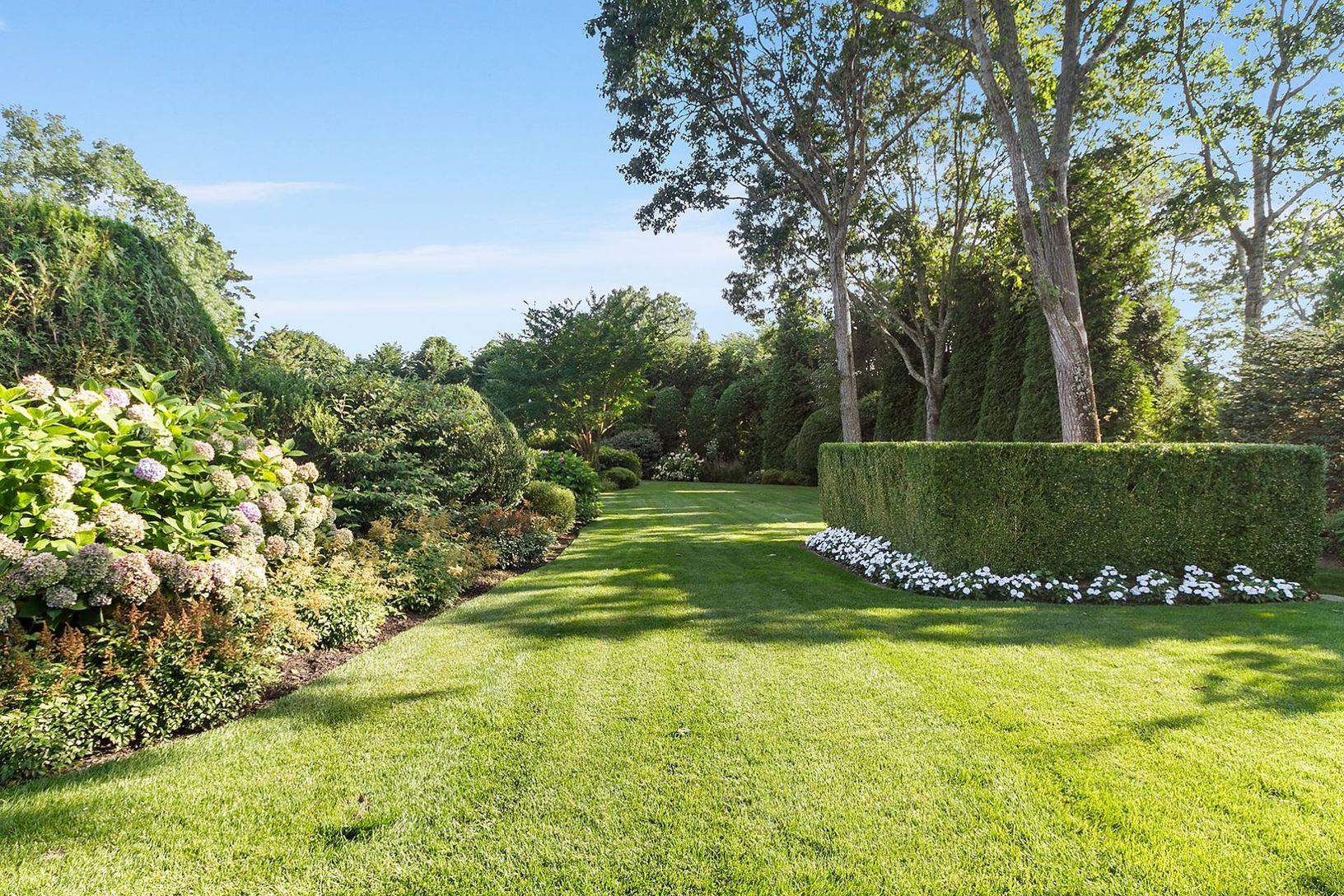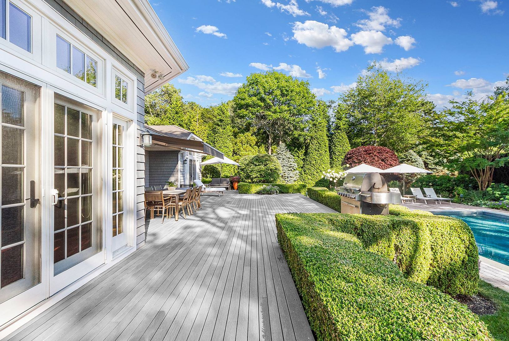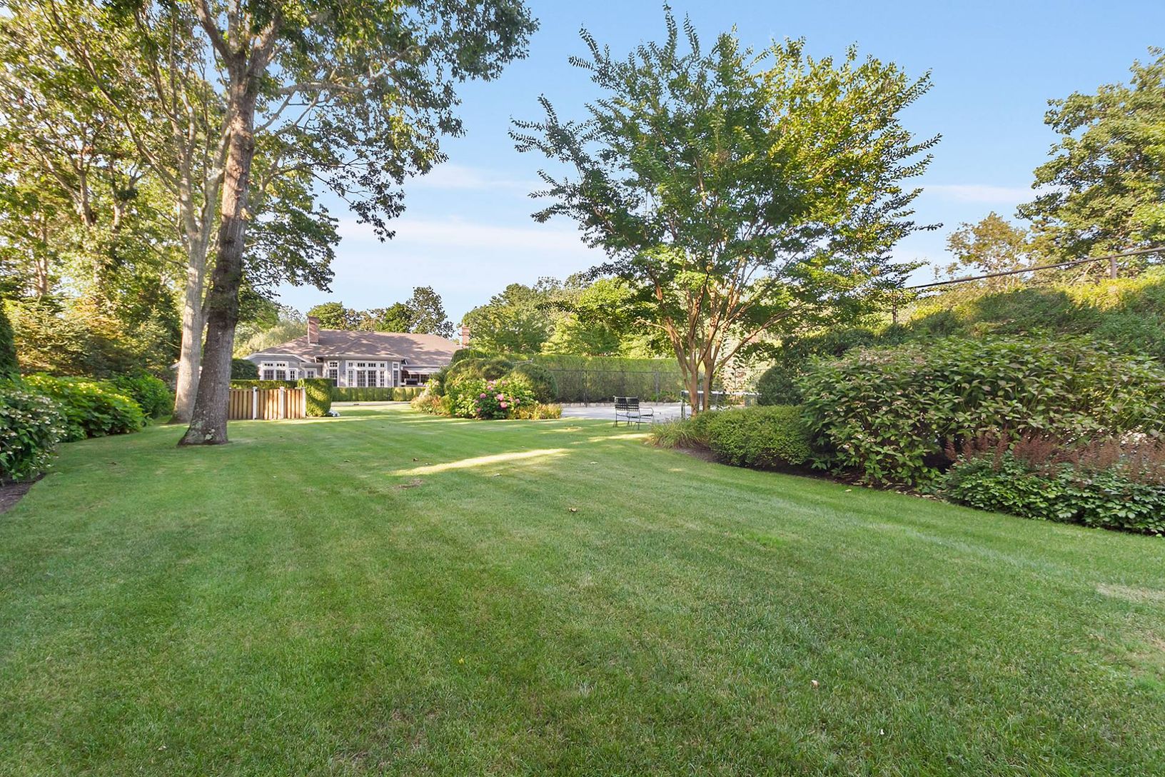 Quogue Village premier offering of the perfect July rental. The fun begins with an oversized heated, gunite pool, Har-tru tennis court, and basketball. Located on a remarkable 1-acre plus property the grounds are truly park-like.