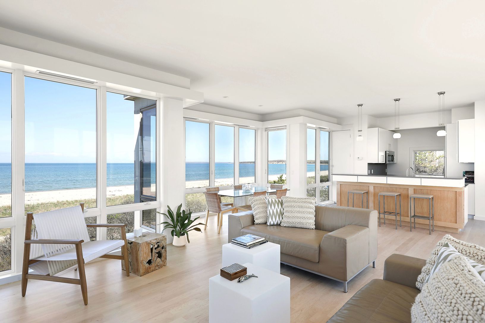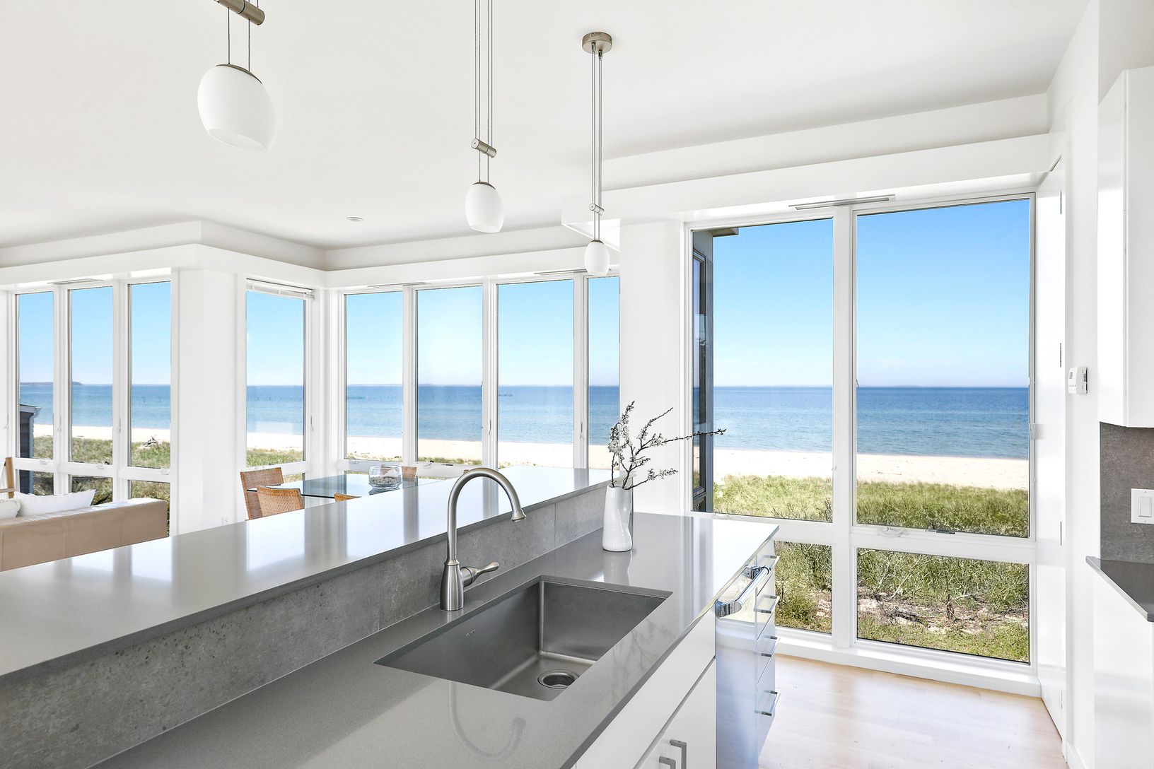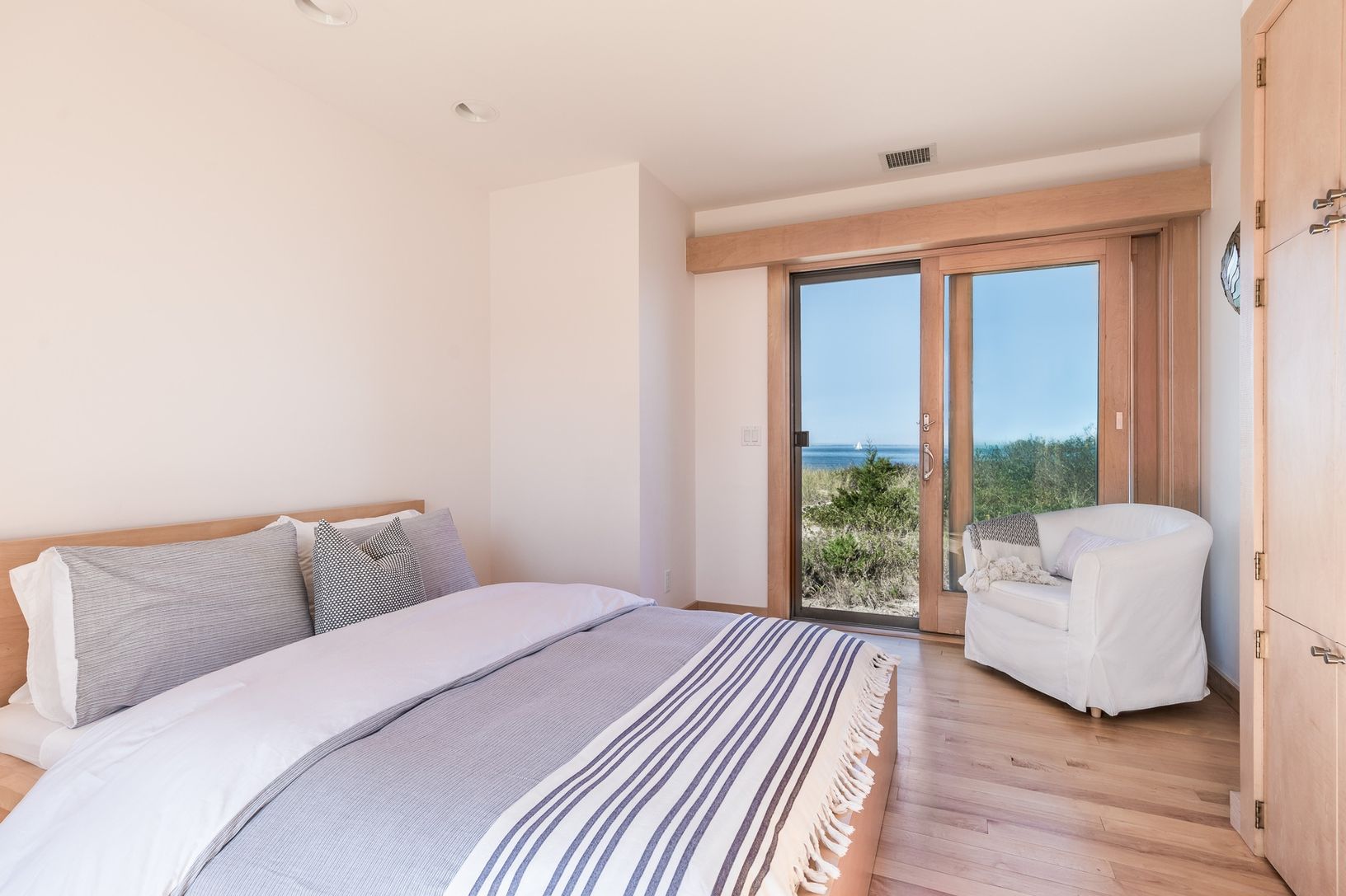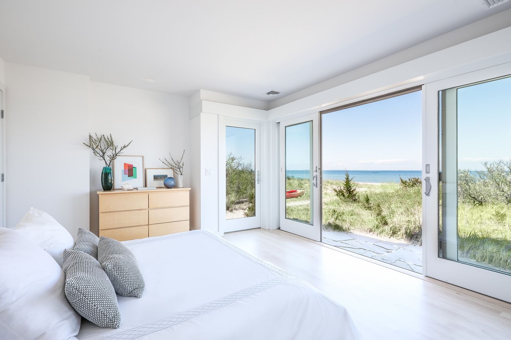 Set amongst the wild grassy beach-scape, with 100 feet of sandy beach frontage and nothing but open sky and the expanse of Gardiner's Bay in front of you, is this beautifully crafted modern beach house. Walls of glass both front and back overlooking Three Mile Harbor bring epic views into the home from every direction. With impeccable attention to detail, this home was designed for living surrounded by nature. Magnificent sunsets and quiet mom