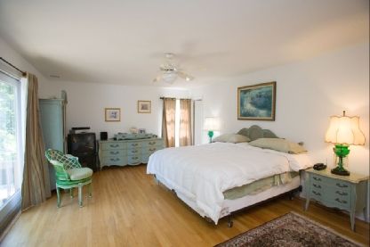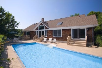 In the estate area of East Quogue. Lovely one-level post modern home features 4 bedrooms, 4 marble baths, granite kitchen, hardwood floors, fireplace, central air conditioning, and deck. This 1+ acre property is conveniently located to town, school and the park. This East Quogue property is secluded and boasts a waterfront with 240' deep water dock, catwalk to floating dock for 2 boats, and a bay front pool.