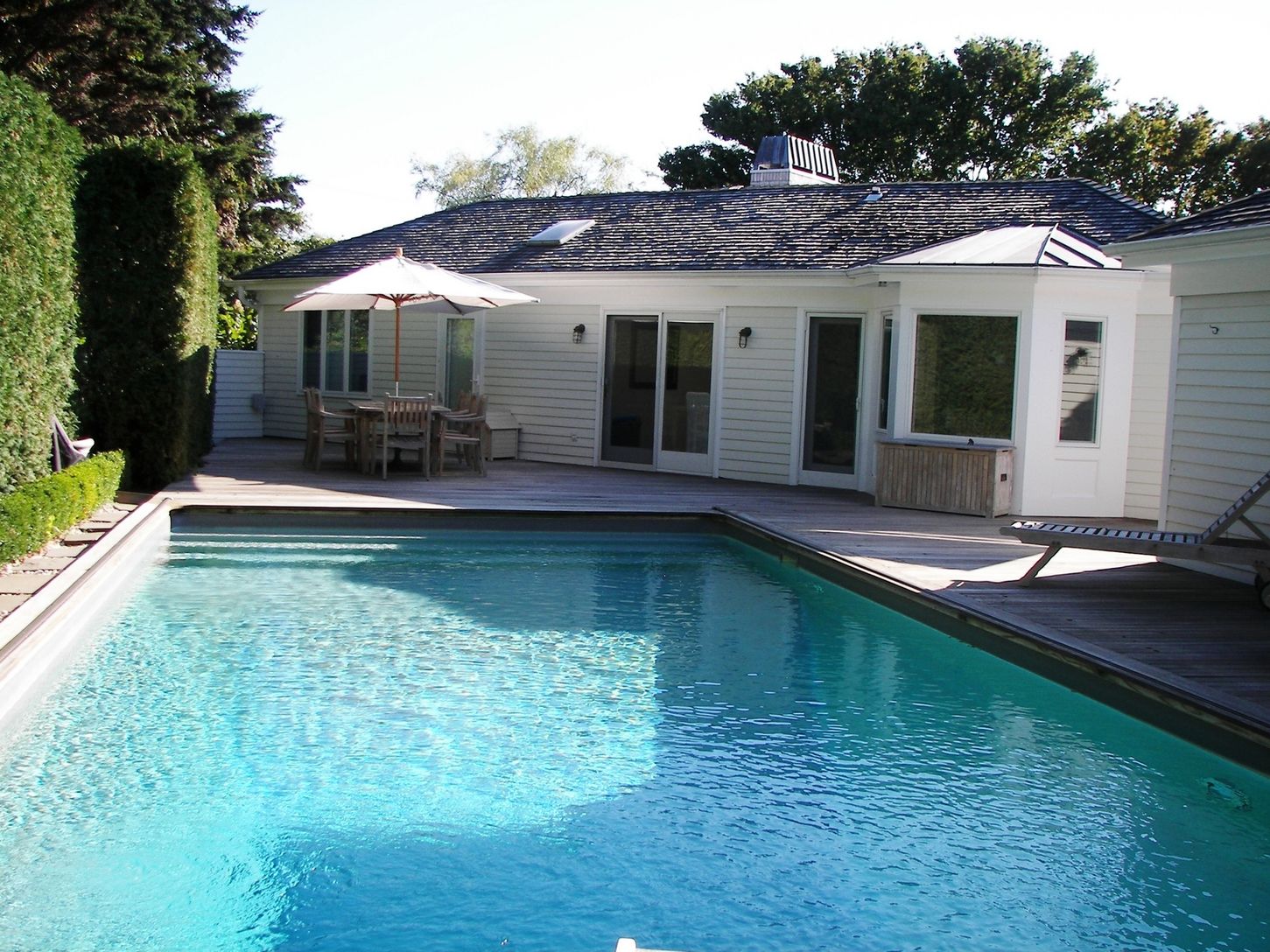 PERFECT GETAWAY!! SOUTHAMPTON SOUTH!! Completely updated with great light and on one level. Includes a fabulous chefs kitchen, formal dining room overlooking pool, 3+ bedrooms w/en-suite baths. The living room has vaulted ceiling, fireplace, and 3 pair of French doors with views of the bay and ocean. The master bedroom has it's own deck, views to the ocean, and fabulous bath. The lower level is completely finished w/spacious entertainment room