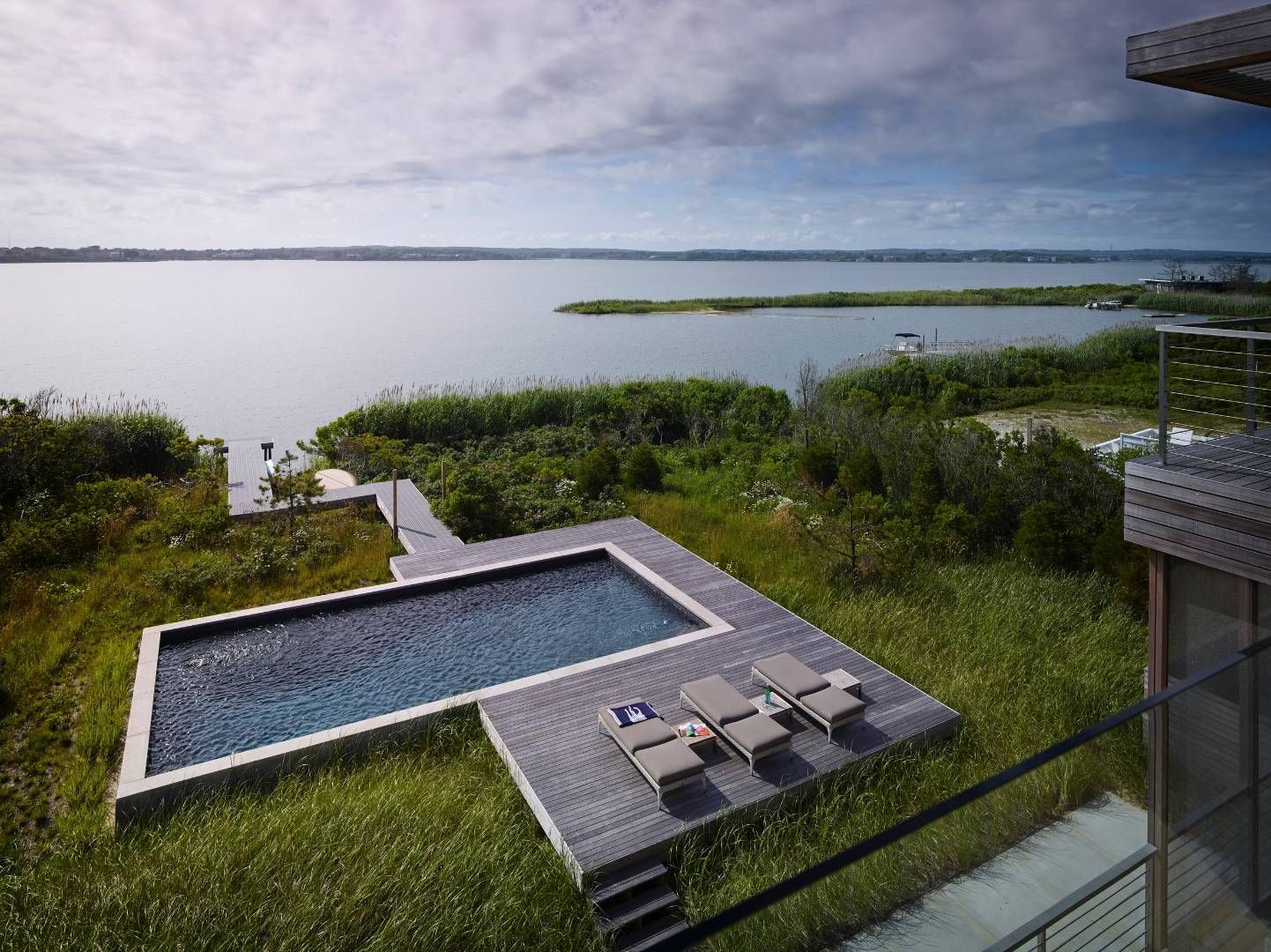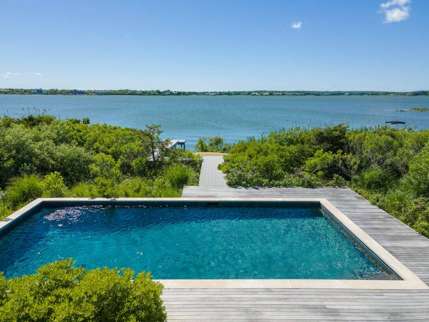 Sited on .40 acre on Mecox Bay at the end of Flying Point Road, this impeccable modern home, designed by the renowned architectural firm of Stelle Lomont Rouhani with Associated Interiors by Eleanor Donnelly, is a stunning tribute to masterful modern design. The property features a waterfront 16 x 32' heated Gunite pool and dock, an outdoor shower, garage/cabana covered outdoor seating and dining area on the pool level, and thoughtful, well-ar