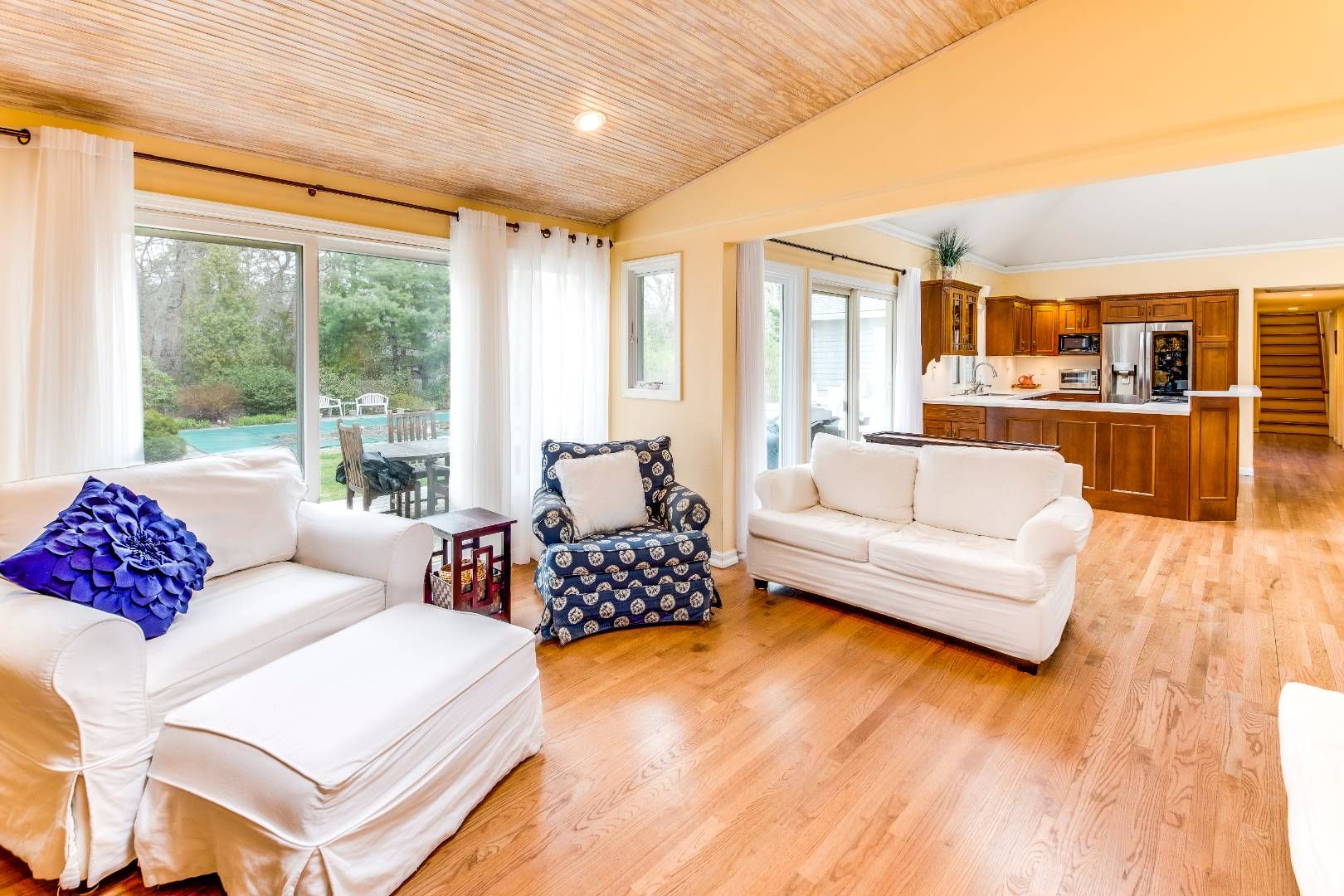 Wainscott architect designed beach home within 2 miles, toes in the sand at Beach Lane. This home was built in the late 80's and renovated within the past 5 years. The first floor master bedroom opens to a private deck and has a generous walk in closet. There are two more bedrooms and baths as well as an office, den and lower level theater room with surround sound. The fenced rear yard is enclosed and private with a 20x40 salt water heated poo