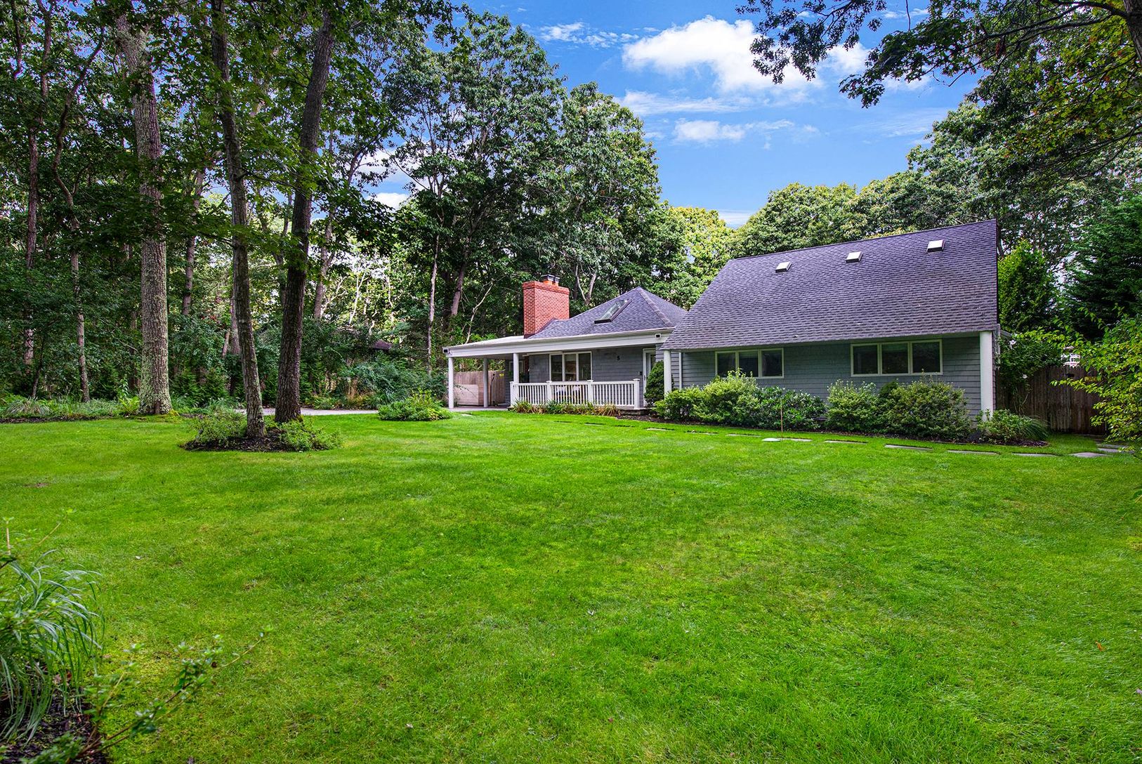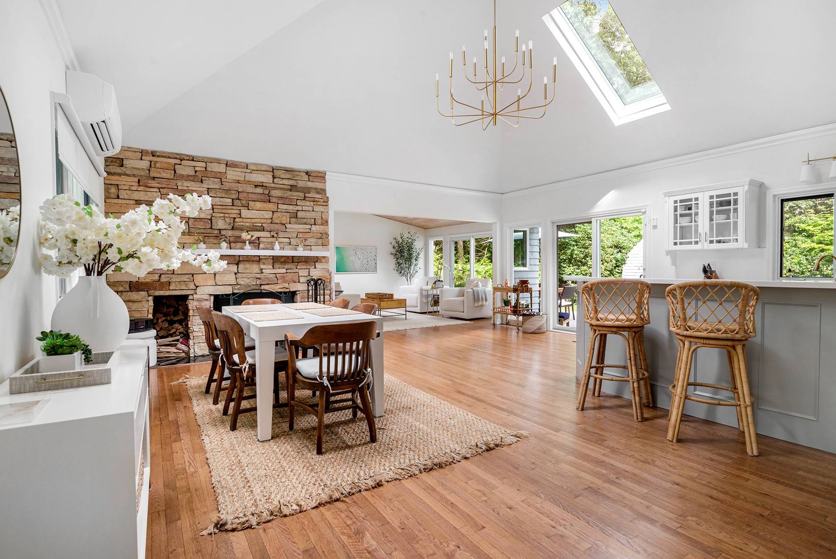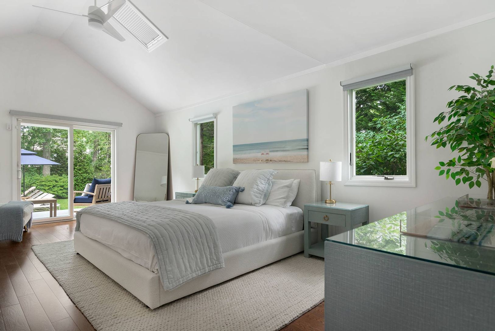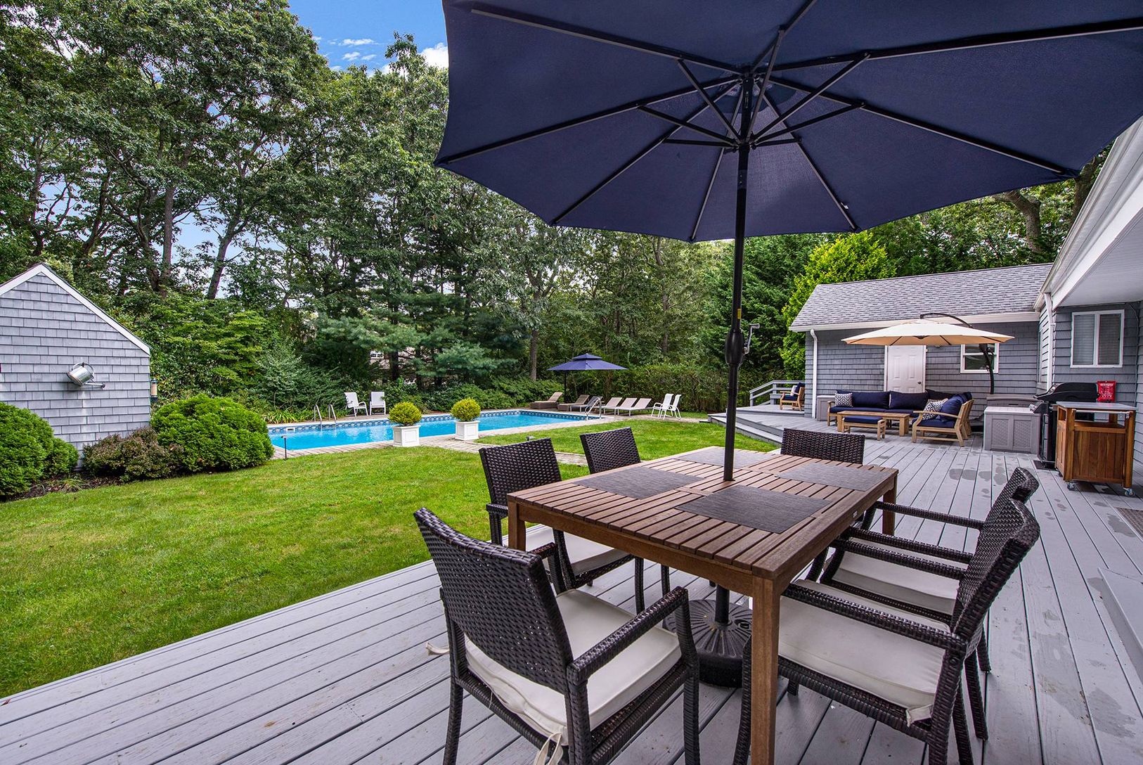 Beautifully maintained beach house near everything in the hamlet of Wainscott. Cheerfully decorated, this home is crisp and tasteful. There is an open living room with stone fireplace, dining area, den and kitchen with stainless appliances. The first floor primary bedroom suite has a king bed and opens up to a private deck. It boasts a large TV and generous walk-in closet. Additionally, there is a guest bedroom with queen bed, an office and a