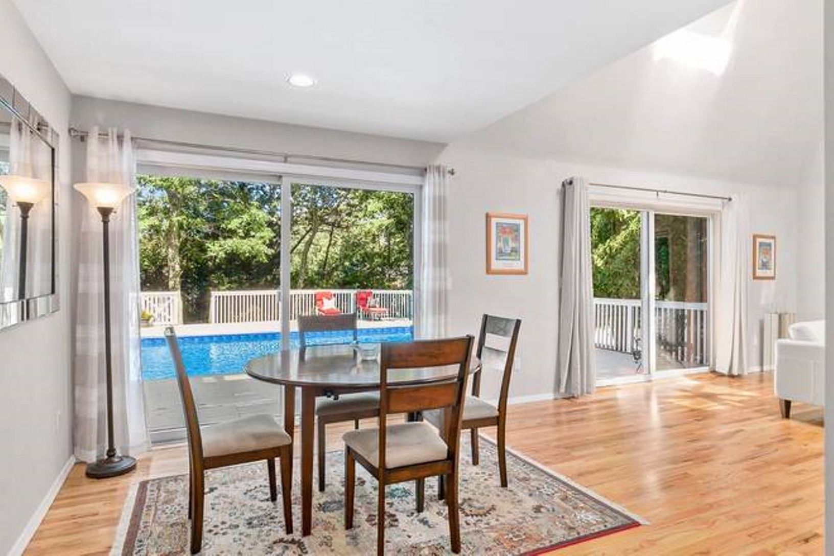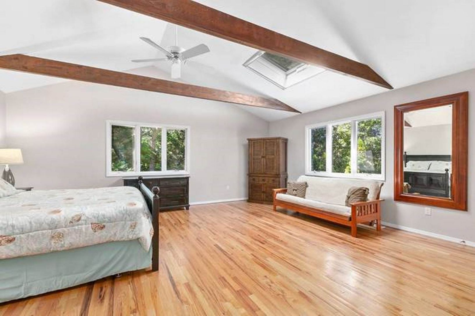 Nestled on a quiet lane, this Wainscott Contemporary is centrally located to everything the Hamptons has to offer! Pristinely kept, it features 2531 sf of main living, open floor plan, sky-lit soaring vaulted ceilings with exposed beams, wood floors throughout, fireplace, loft with Master suite on second floor, and a finished lower level with laundry, full bath, den, office and an outside entrance. Spacious yard, heated pool and privacy!