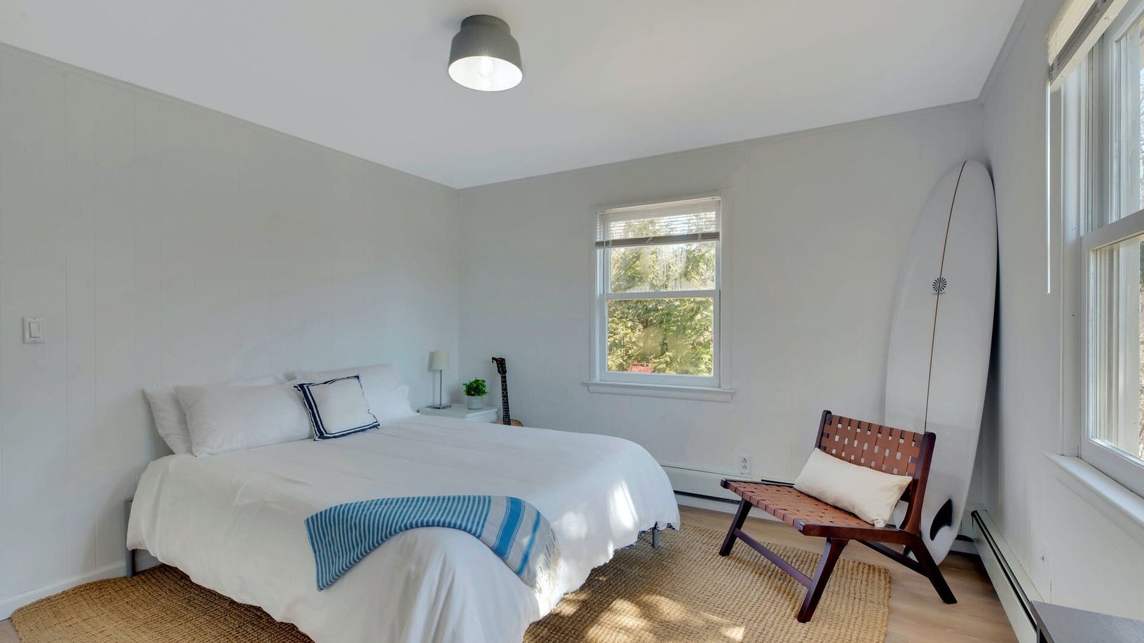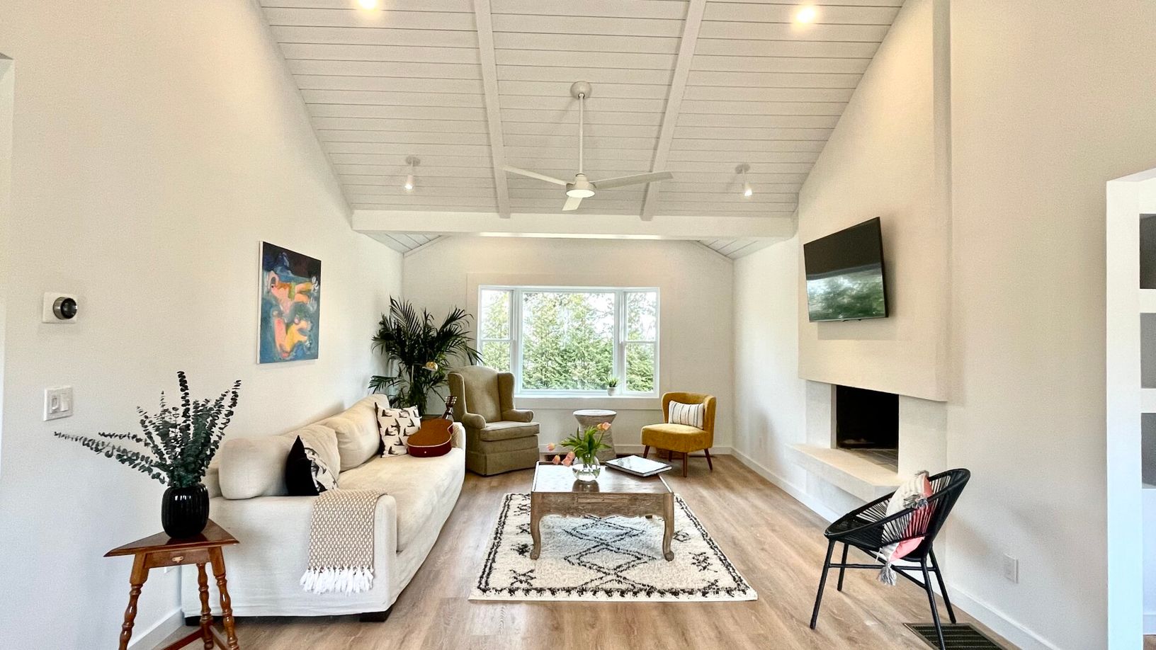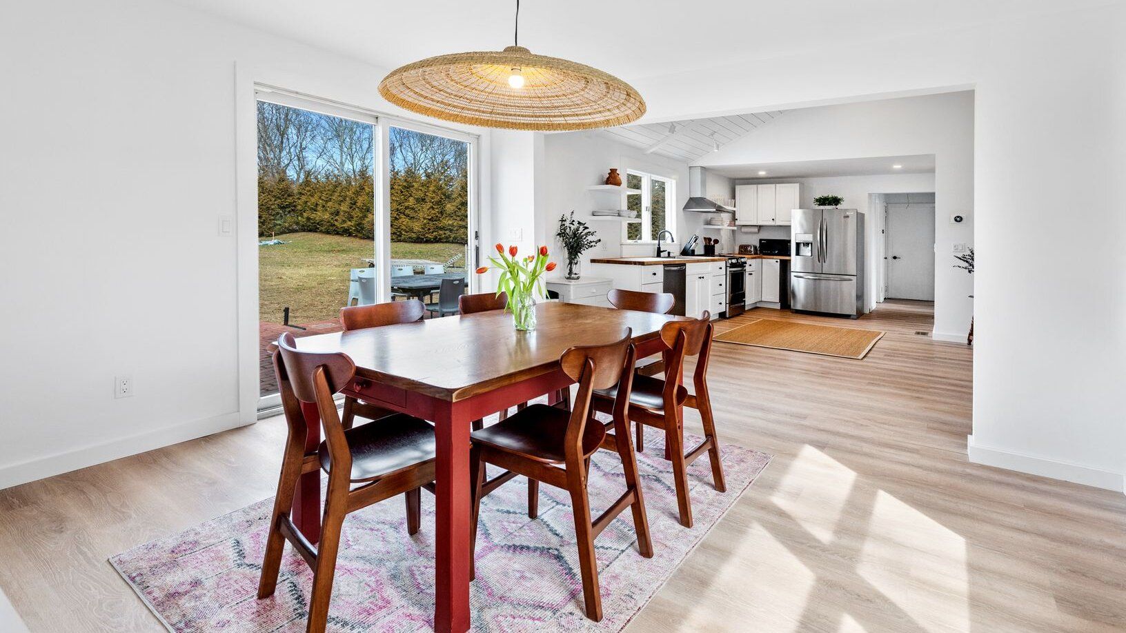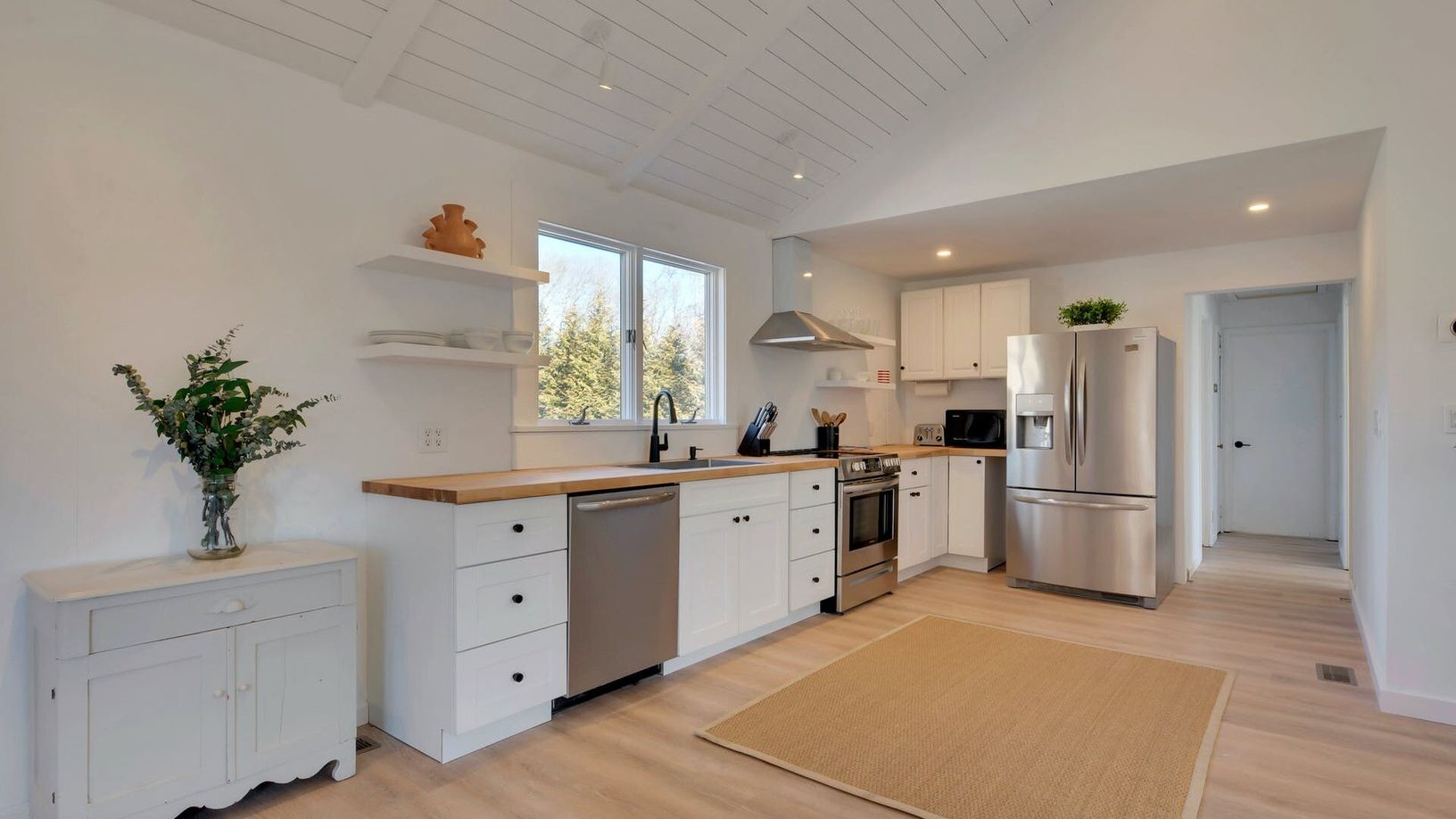 Enjoy a tranquil getaway at this fully-renovated ranch-style beach house in a central location in Amagansett. The nearly-1,750-square-foot interior is cozy and airy, featuring open living spaces, warm hardwood flooring, and vaulted ceilings. Relax in the light modern living room with plush furniture, and flat-scree