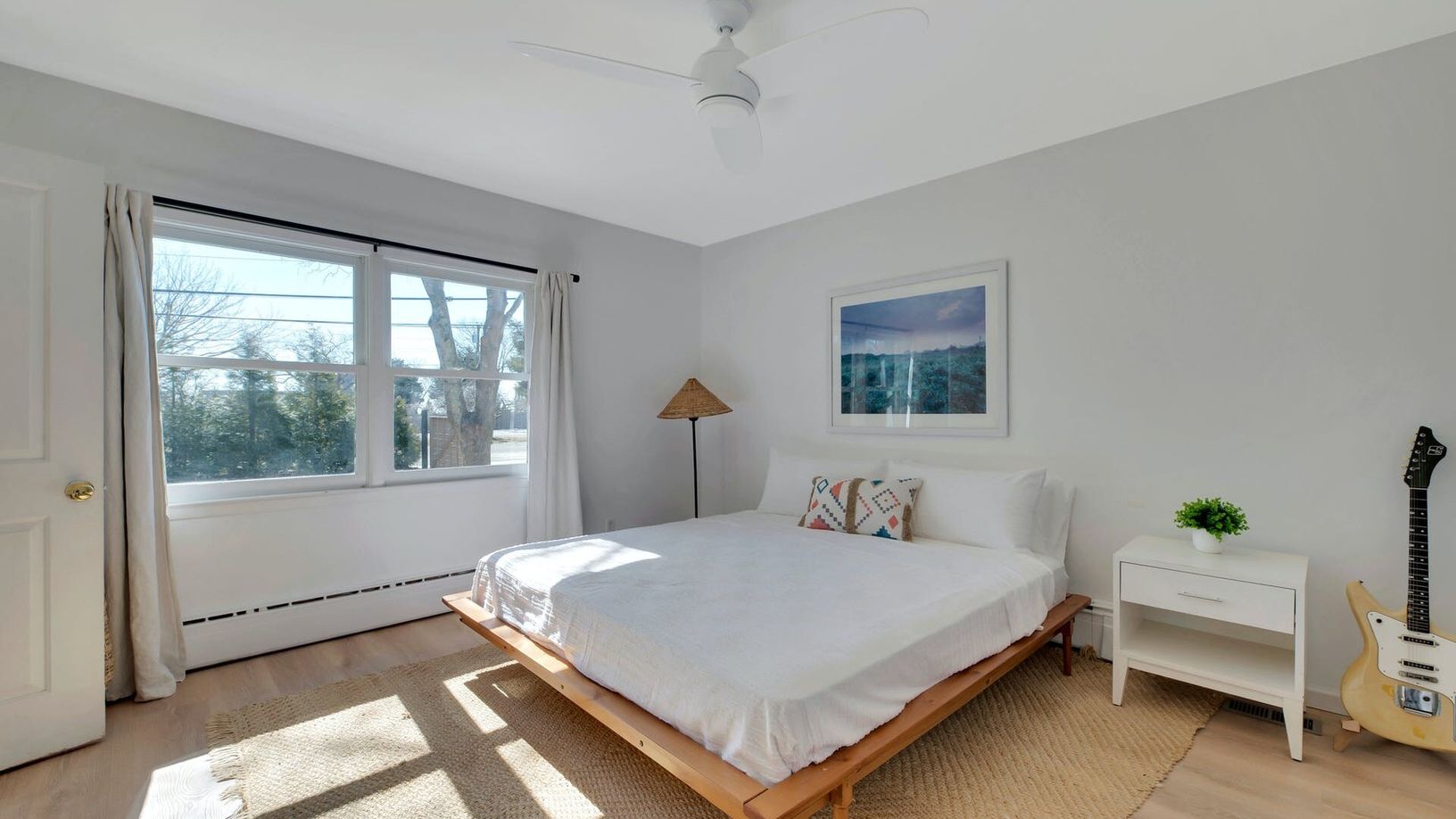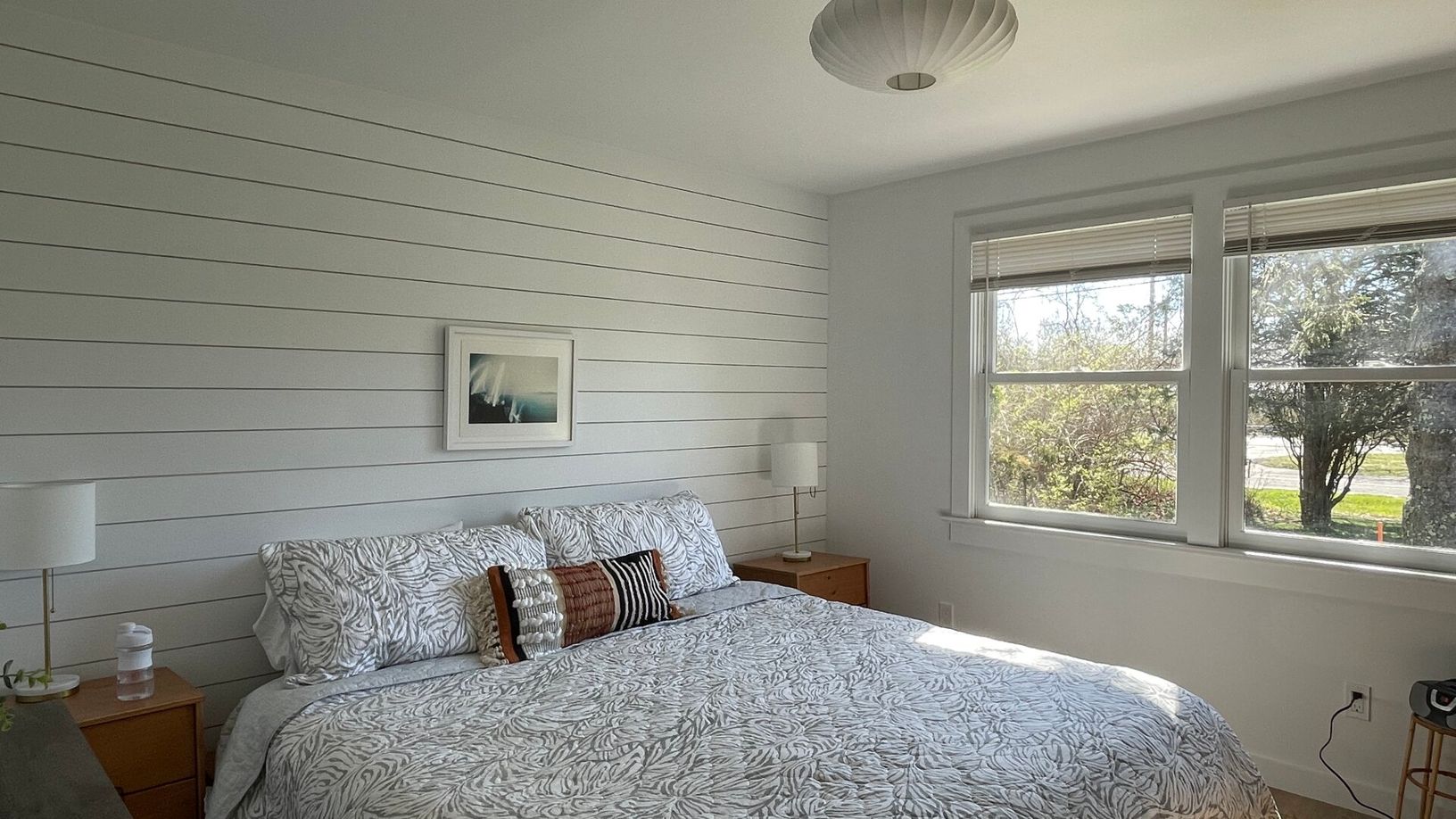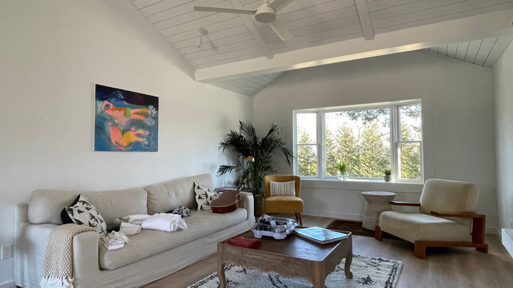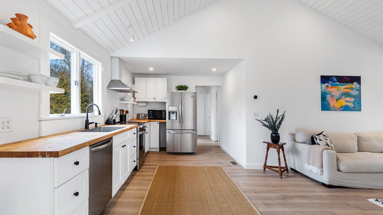 Enjoy a tranquil getaway at this fully-renovated ranch-style beach house in a central location in Amagansett. The nearly-1,750-square-foot interior is cozy and airy, featuring open living spaces, warm hardwood flooring, and vaulted ceilings. Relax in the light modern living room with plush furniture, and flat-scree
