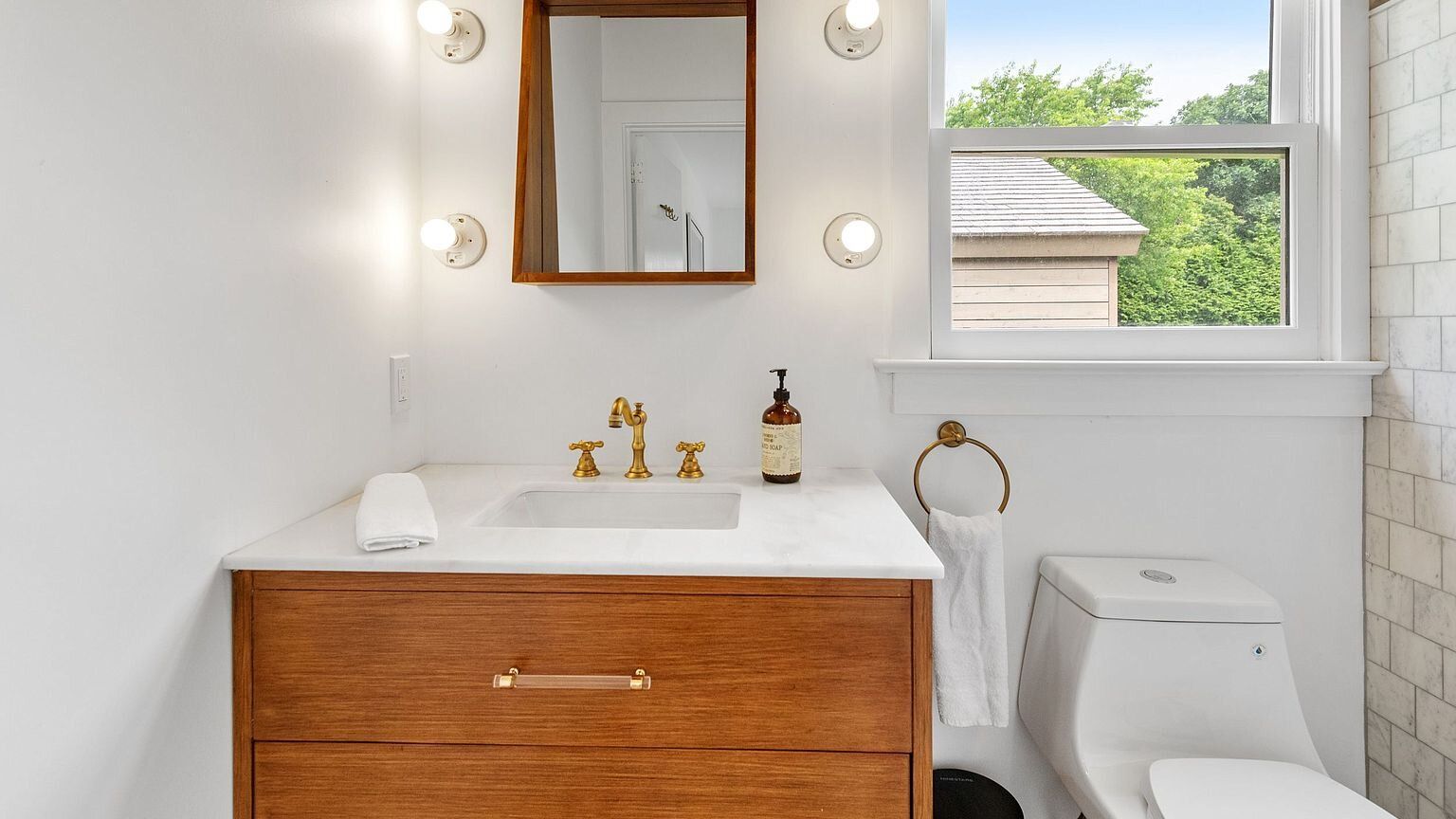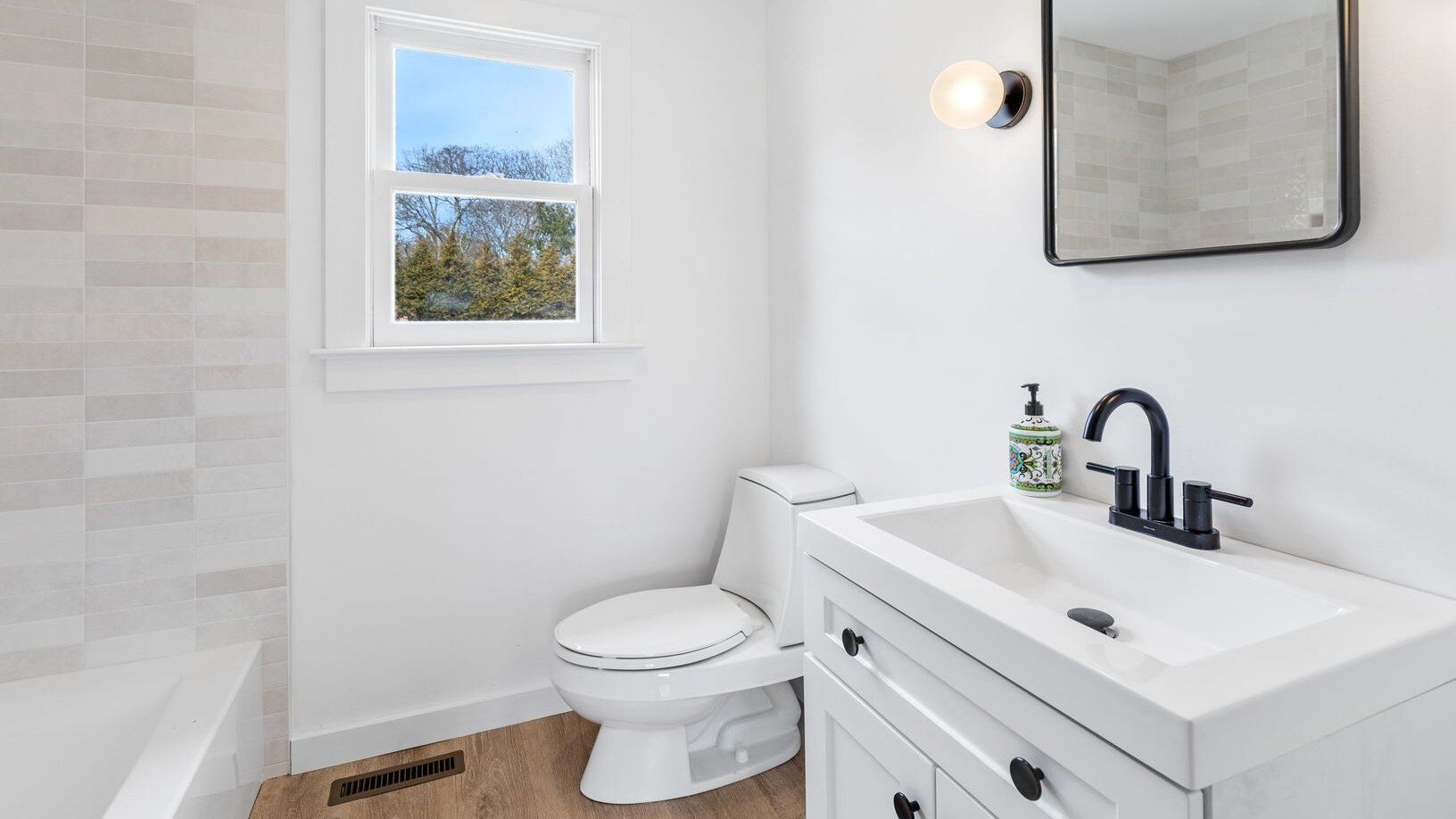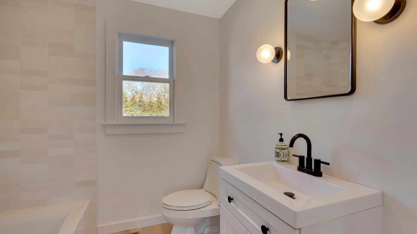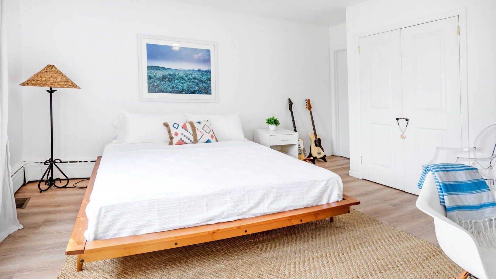 Enjoy a tranquil getaway at this fully-renovated ranch-style beach house in a central location in Amagansett. The nearly-1,750-square-foot interior is cozy and airy, featuring open living spaces, warm hardwood flooring, and vaulted ceilings. Relax in the light modern living room with plush furniture, and flat-scree