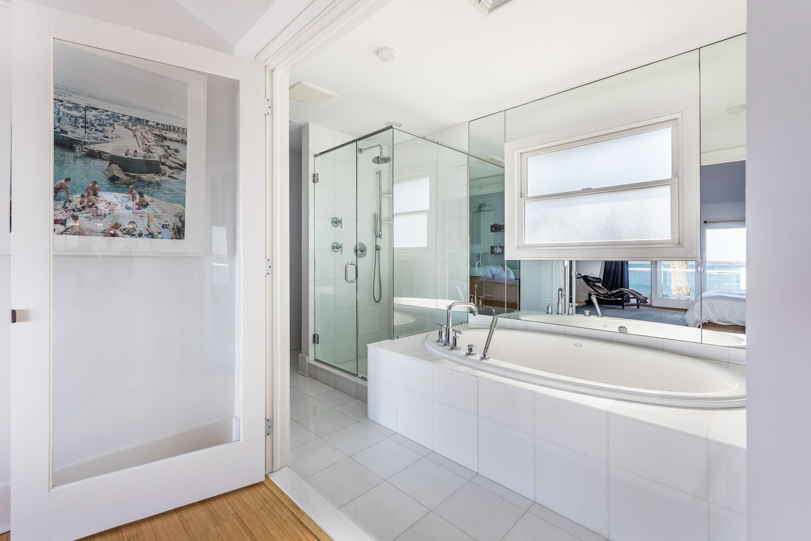 This spectacular bay front home in Sag Harbor Village has panoramic bay beach and water views making it an ultimate summer retreat. This three-bedroom, 3.5 bath home offers open concept living. On the first floor a living room, dining and kitchen have stunning water views through glass doors opening to an expansive covered porch. There is a spacious second floor with the master bedroom and two guest bedrooms. The finished lower level offers an