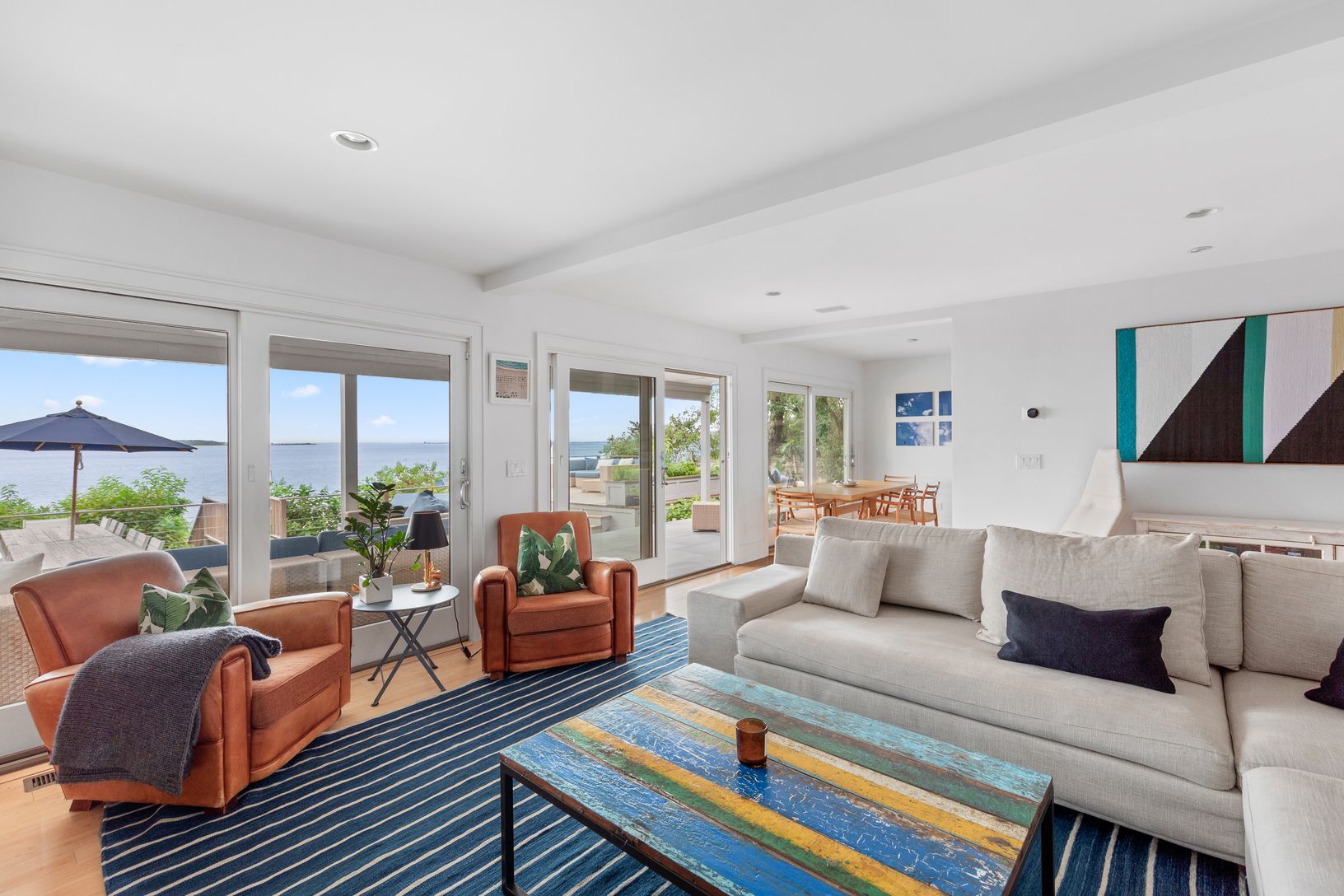 This spectacular bay front home in Sag Harbor Village has panoramic bay beach and water views making it an ultimate summer retreat. This three-bedroom, 3.5 bath home offers open concept living. On the first floor a living room, dining and kitchen have stunning water views through glass doors opening to an expansive covered porch. There is a spacious second floor with the master bedroom and two guest bedrooms. The finished lower level offers an