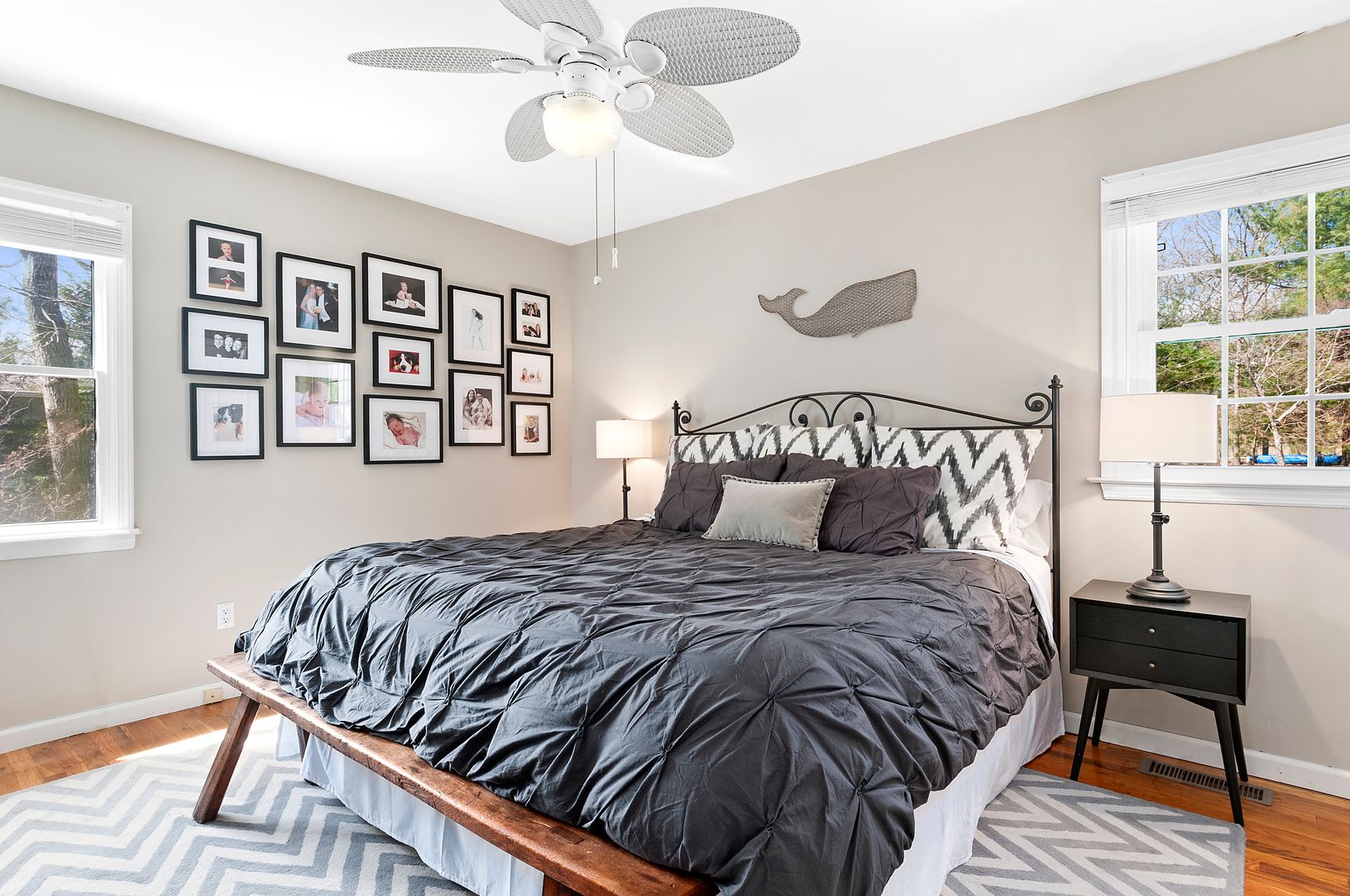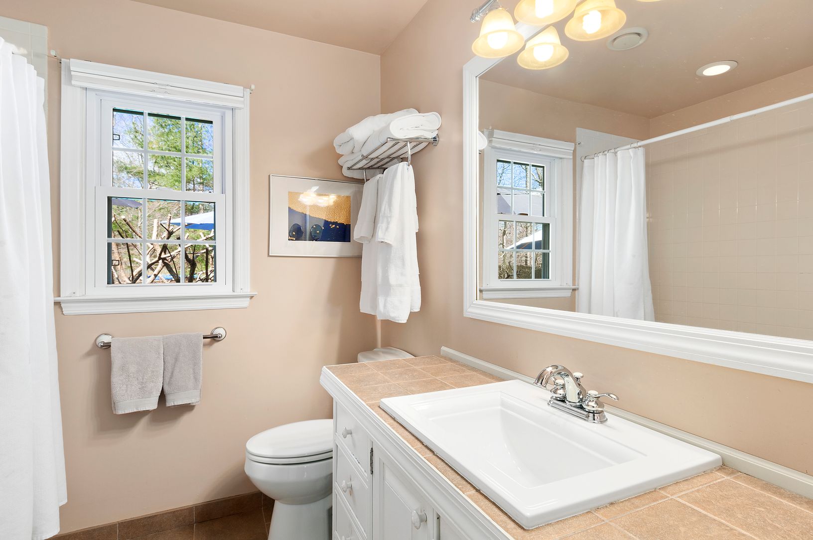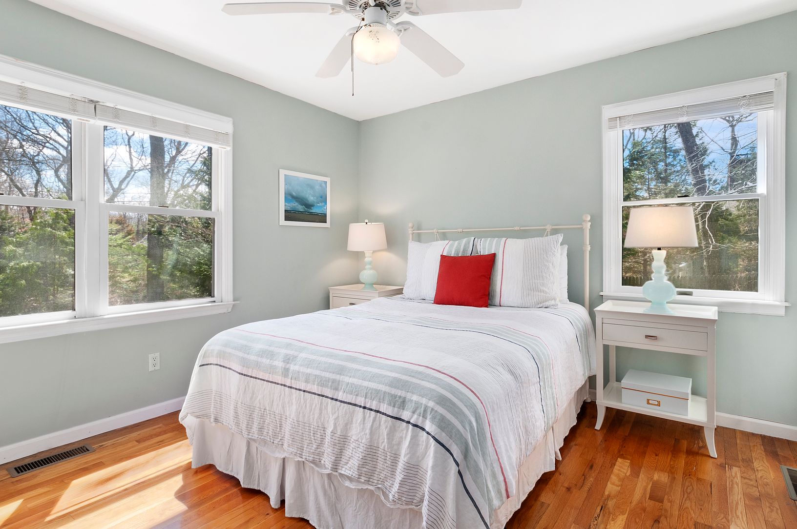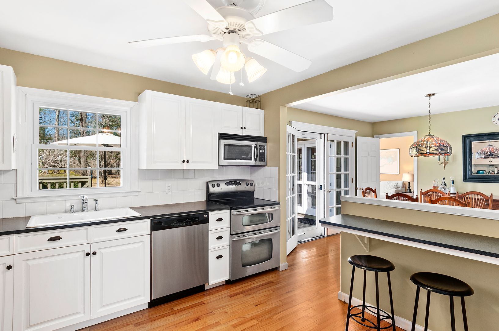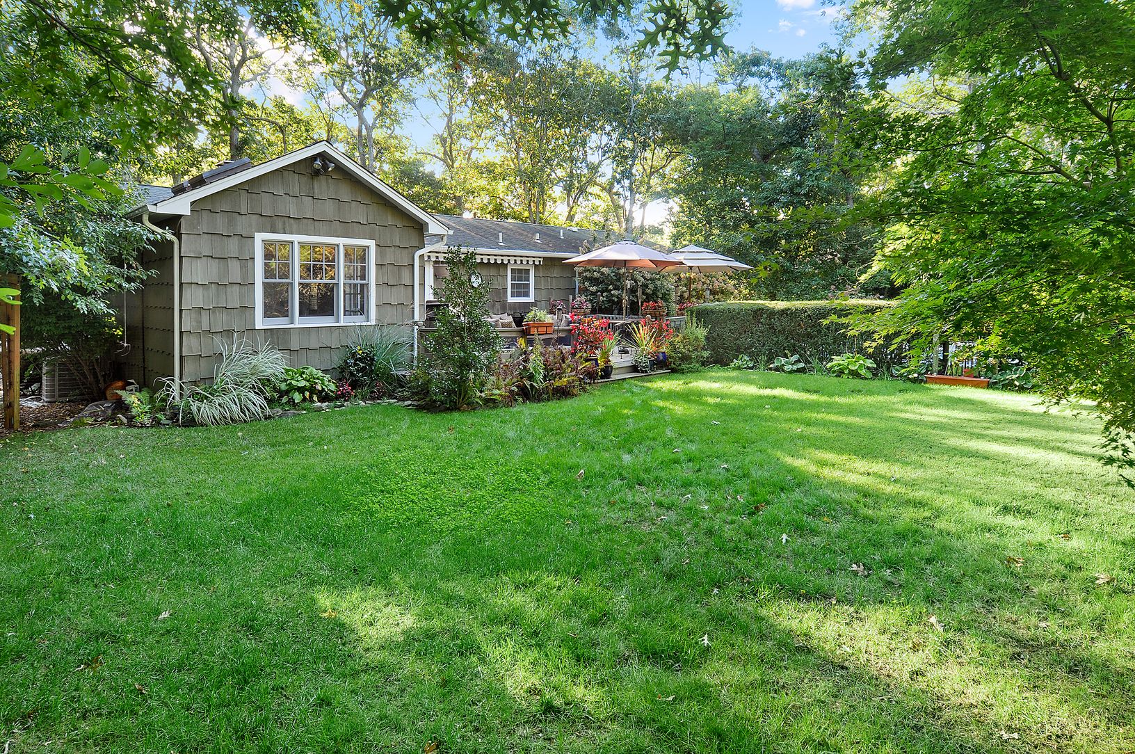 This charming turn-key home offers three bedrooms and three bathrooms on a half-acre lot located close to East Hampton village and ocean beaches. The cathedral ceiling in the living room with skylights draws in plenty of natural light throughout the main living space. The kitchen includes stainless steel appliance overlooking the dining room and bright sun room/den with four skylights and French doors opening up to the pool area. The expansive