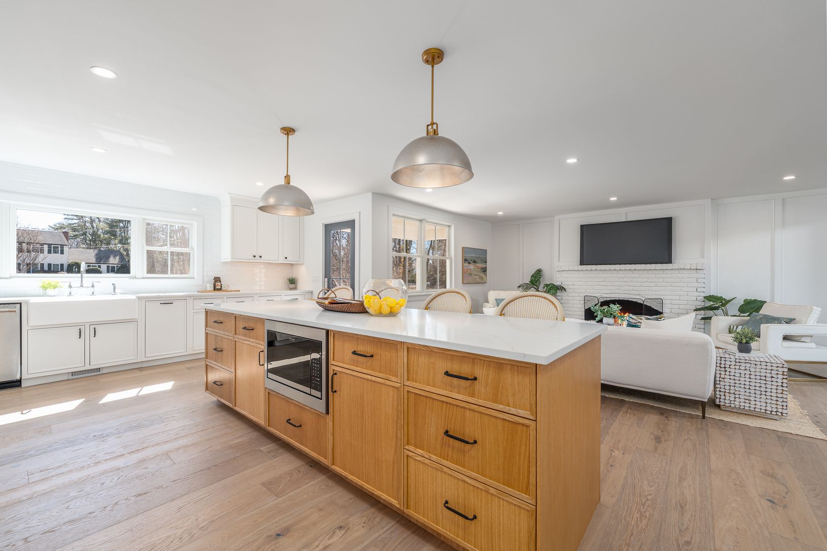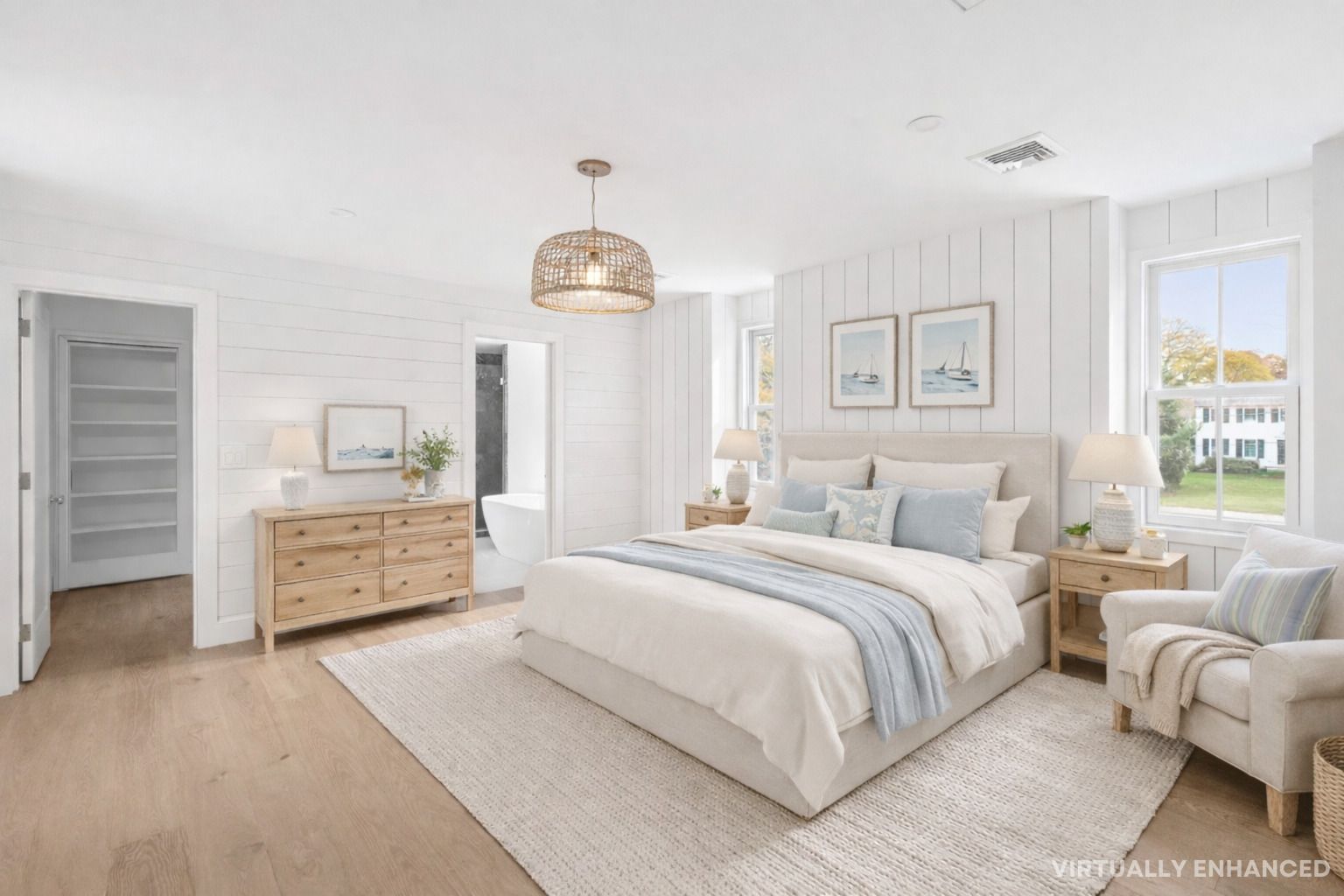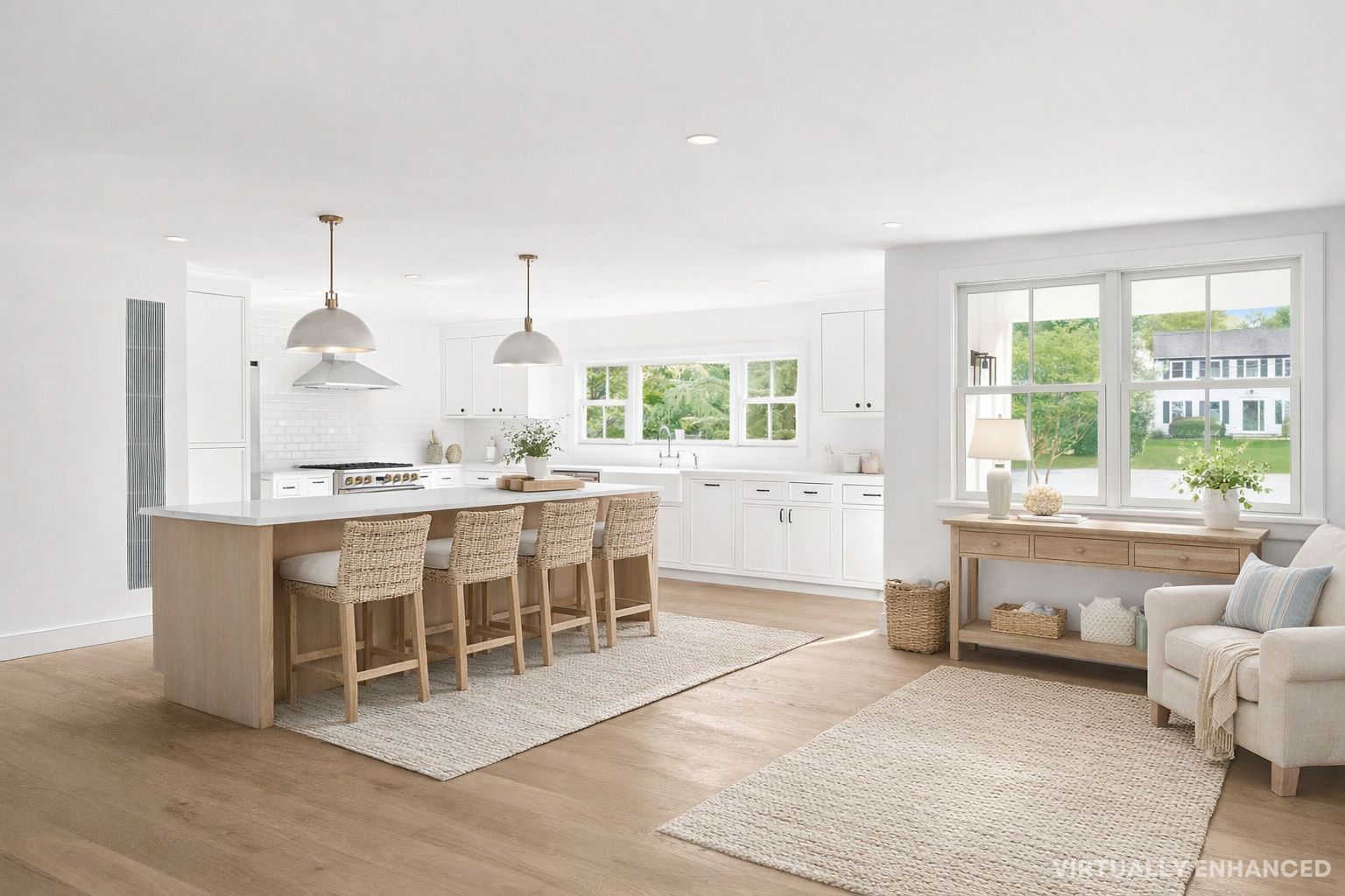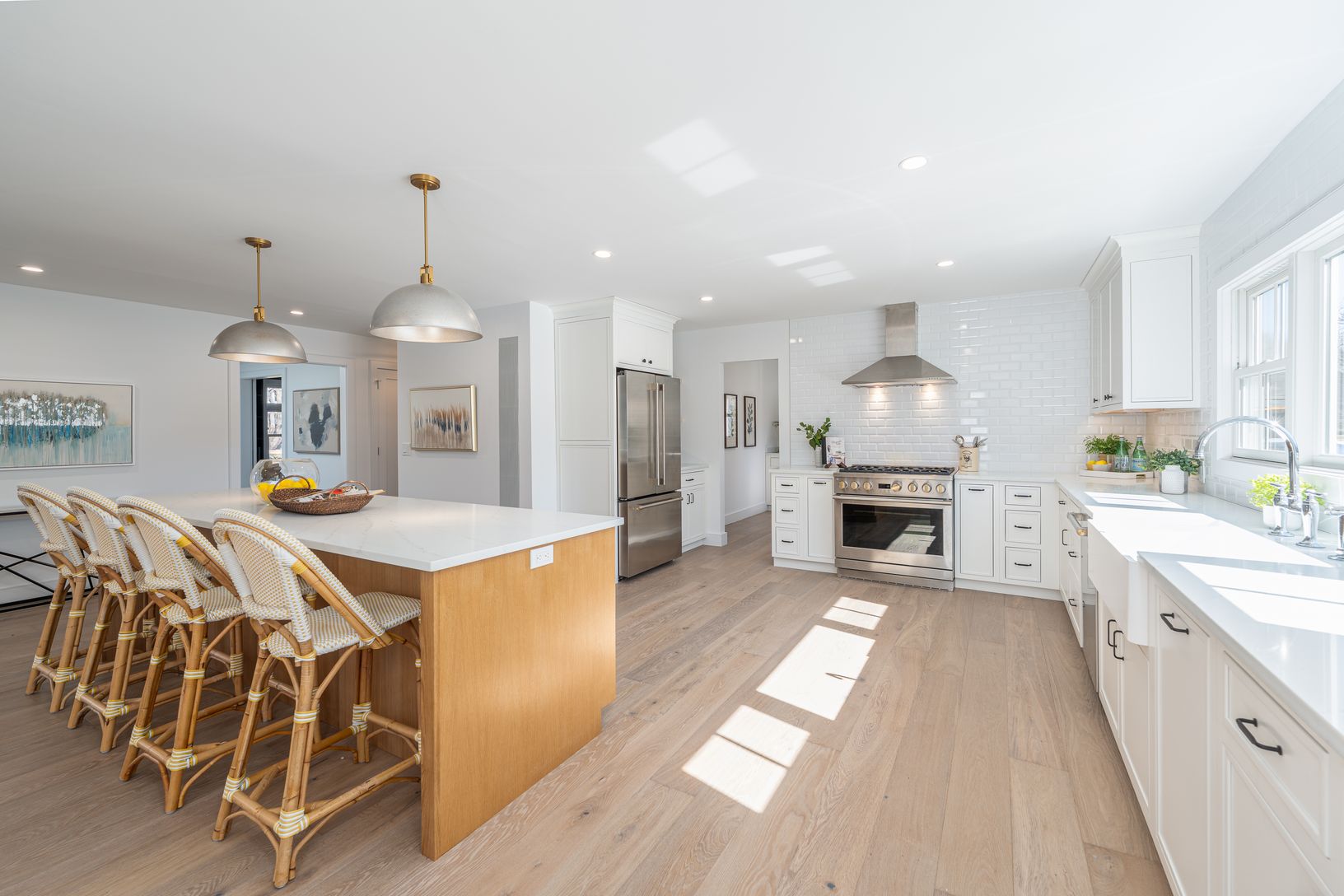 Tucked away on a quiet cul-de-sac lane, just completed, this six-bedroom, four-and-a-half-bath modern farmhouse has been beautifully reimagined and completely renovated, blending classic coastal charm with contemporary sophistication. Set on just shy of an acre, the home offers approximately 4,300 square feet of light-filled living space designed for effortless entertaining and relaxed luxury. Inside, 7.5-inch engineered oak flooring flows thr