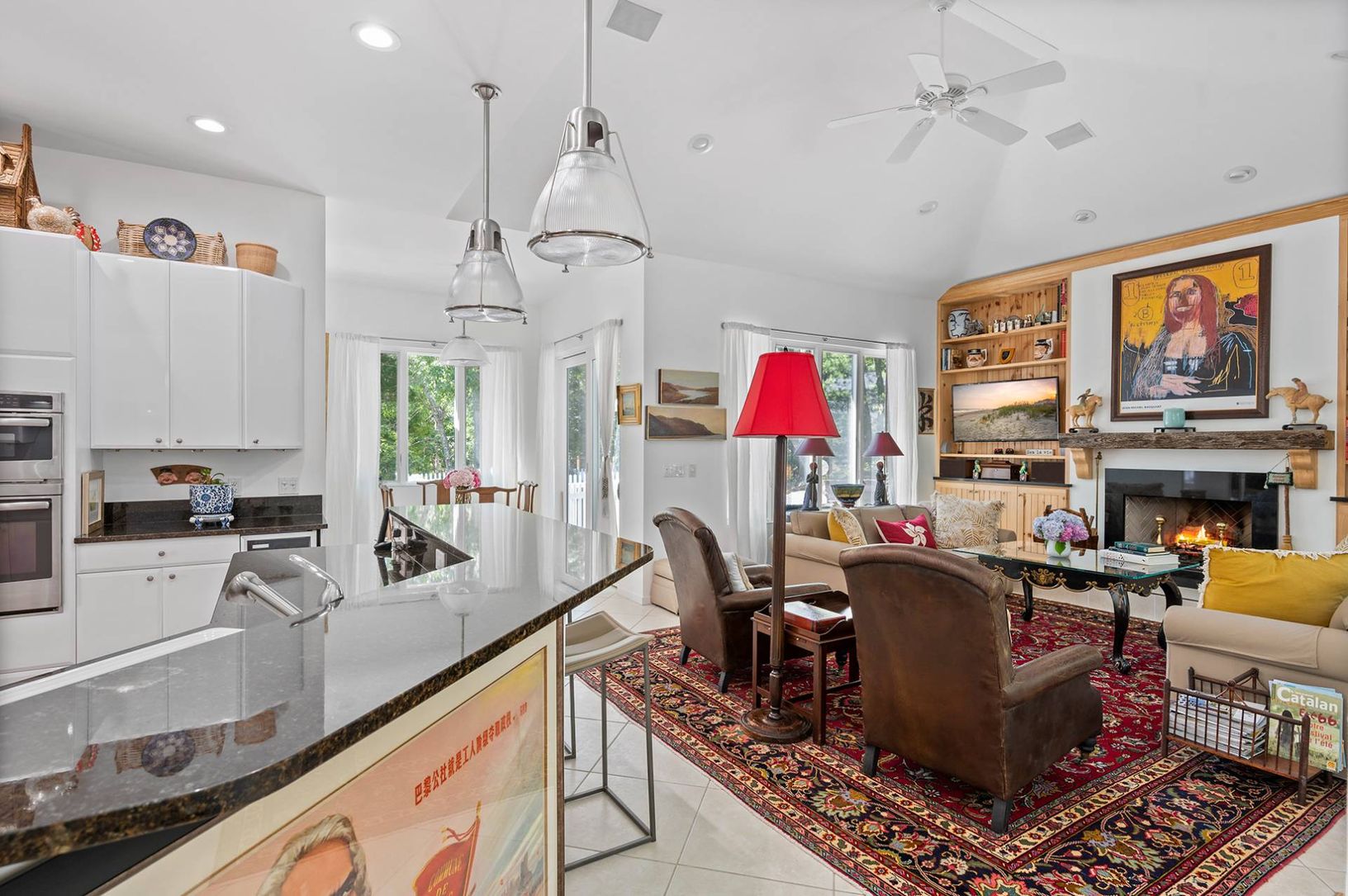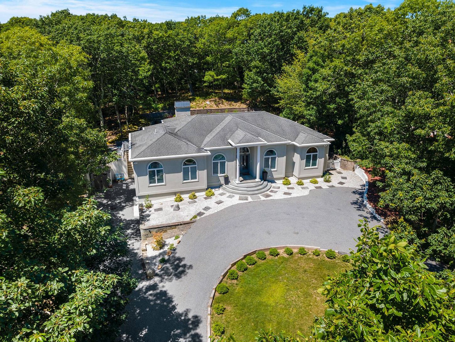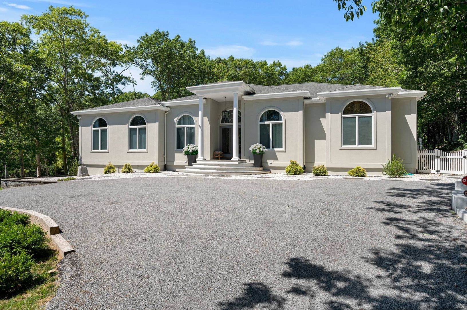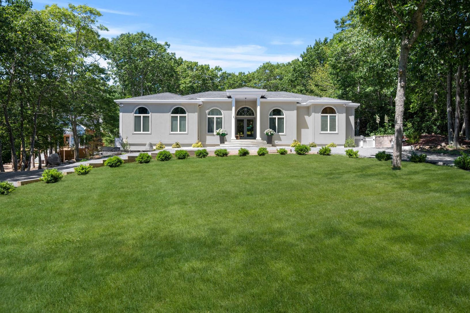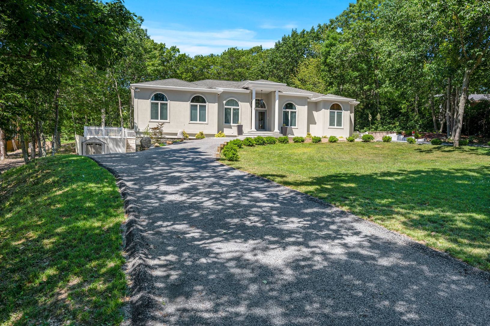 Experience coastal living at its finest in this bright, East Hampton single-story retreat. Perched on an elevated lot and nestled away from the road, this 2,650+/- sq. ft. light filled residence on 0.59+/- acres boasts vaulted ceilings and expansive windows. It features three bedrooms, three baths, and an open-concept layout with a living room, dining area, gourmet kitchen with granite countertops and a breakfast nook, family room with a wood-