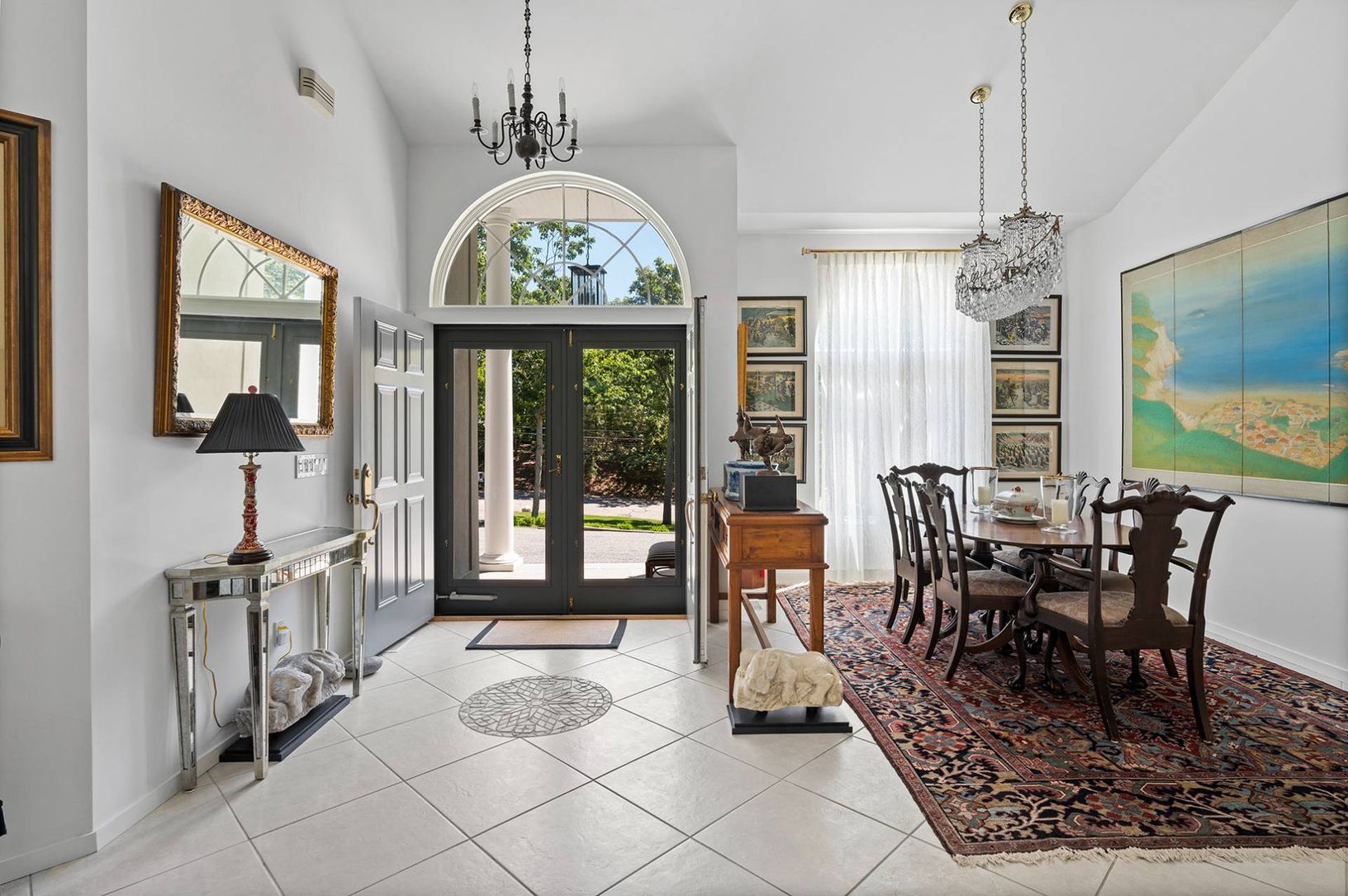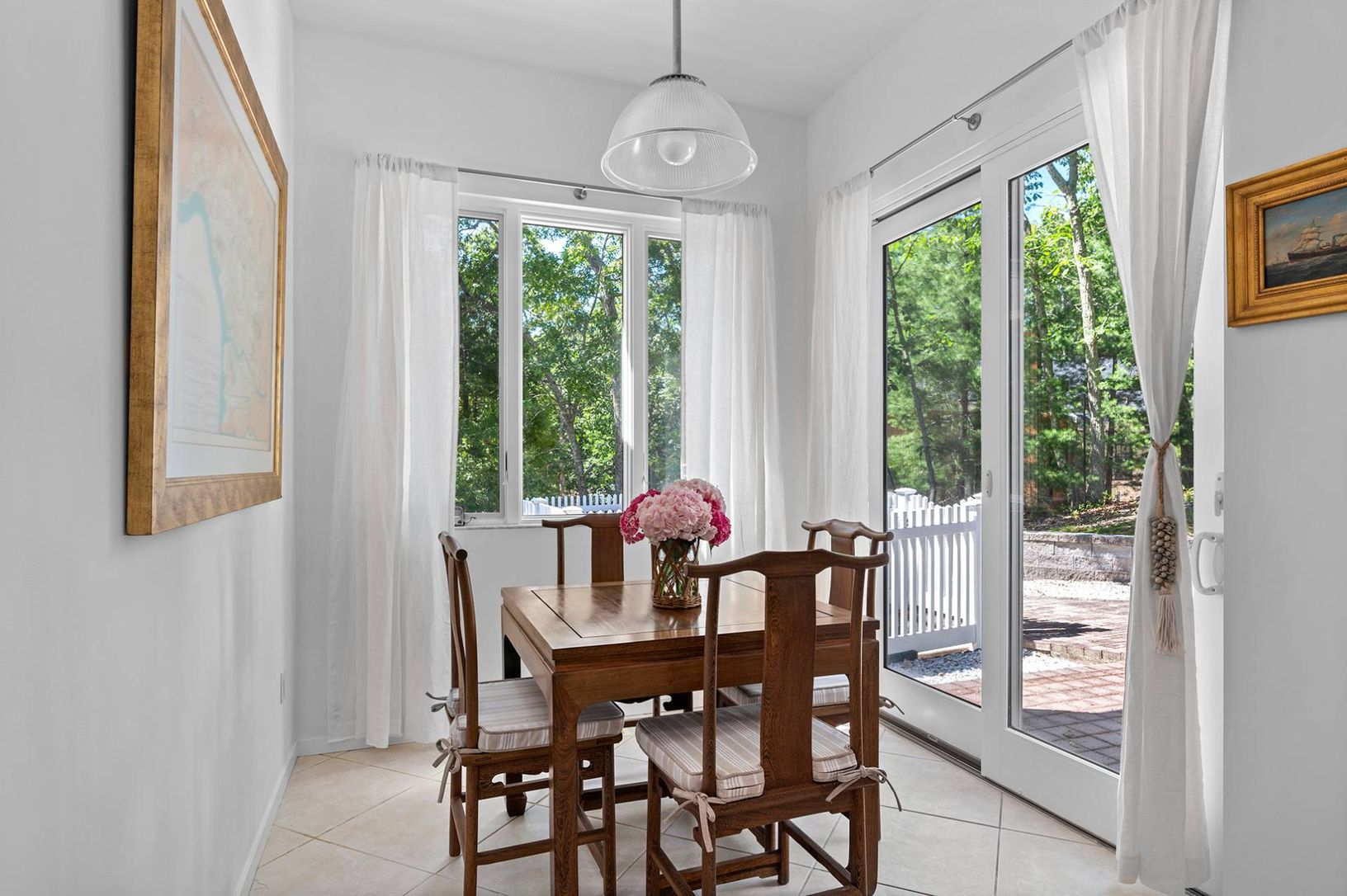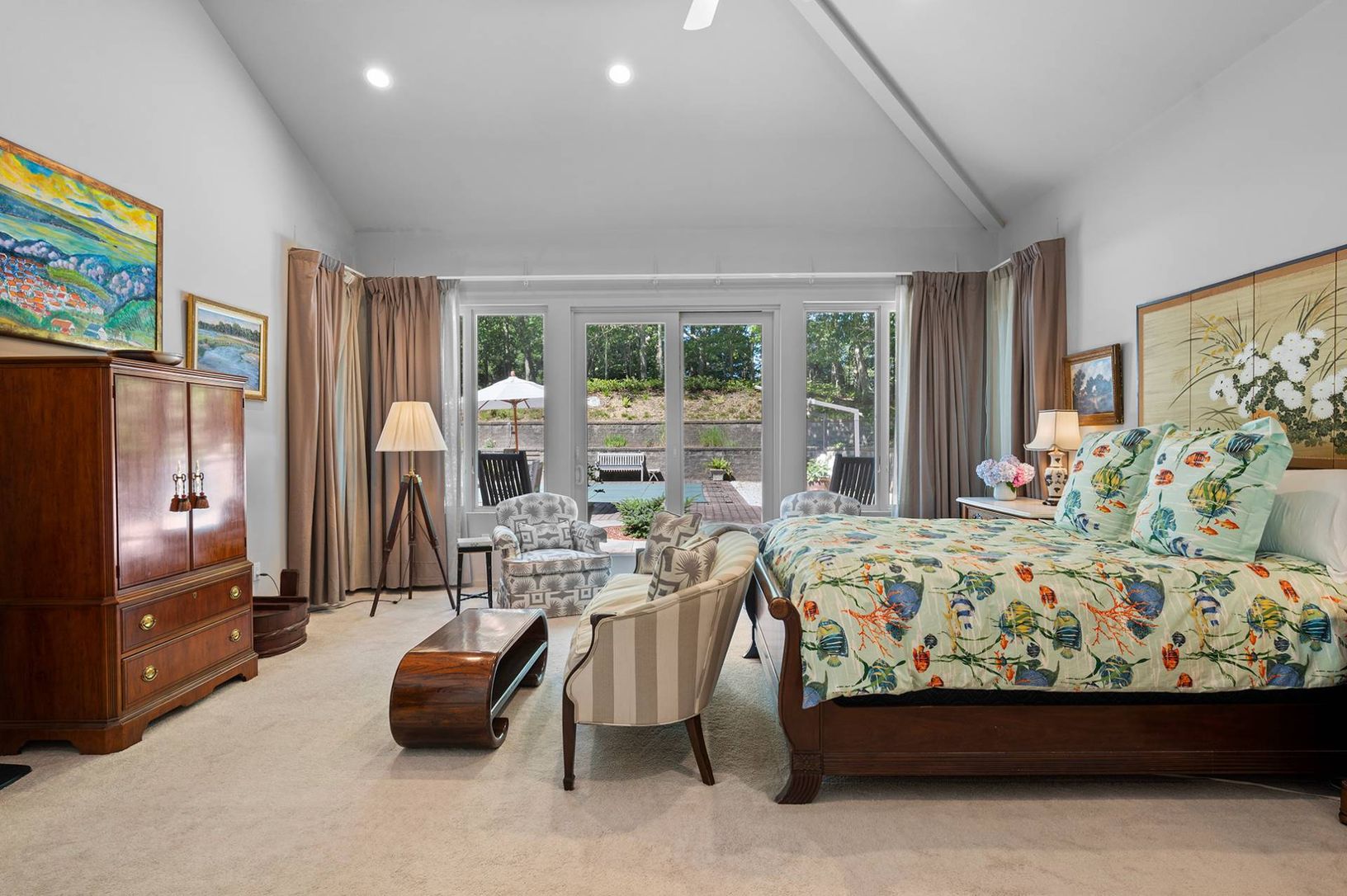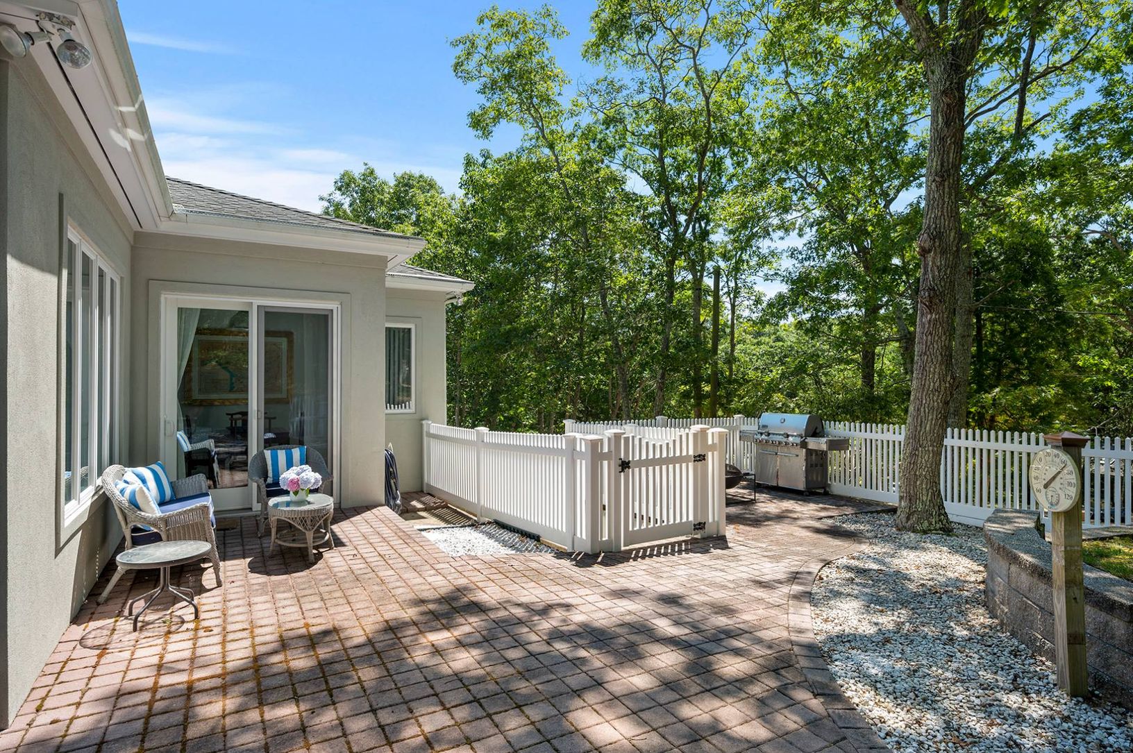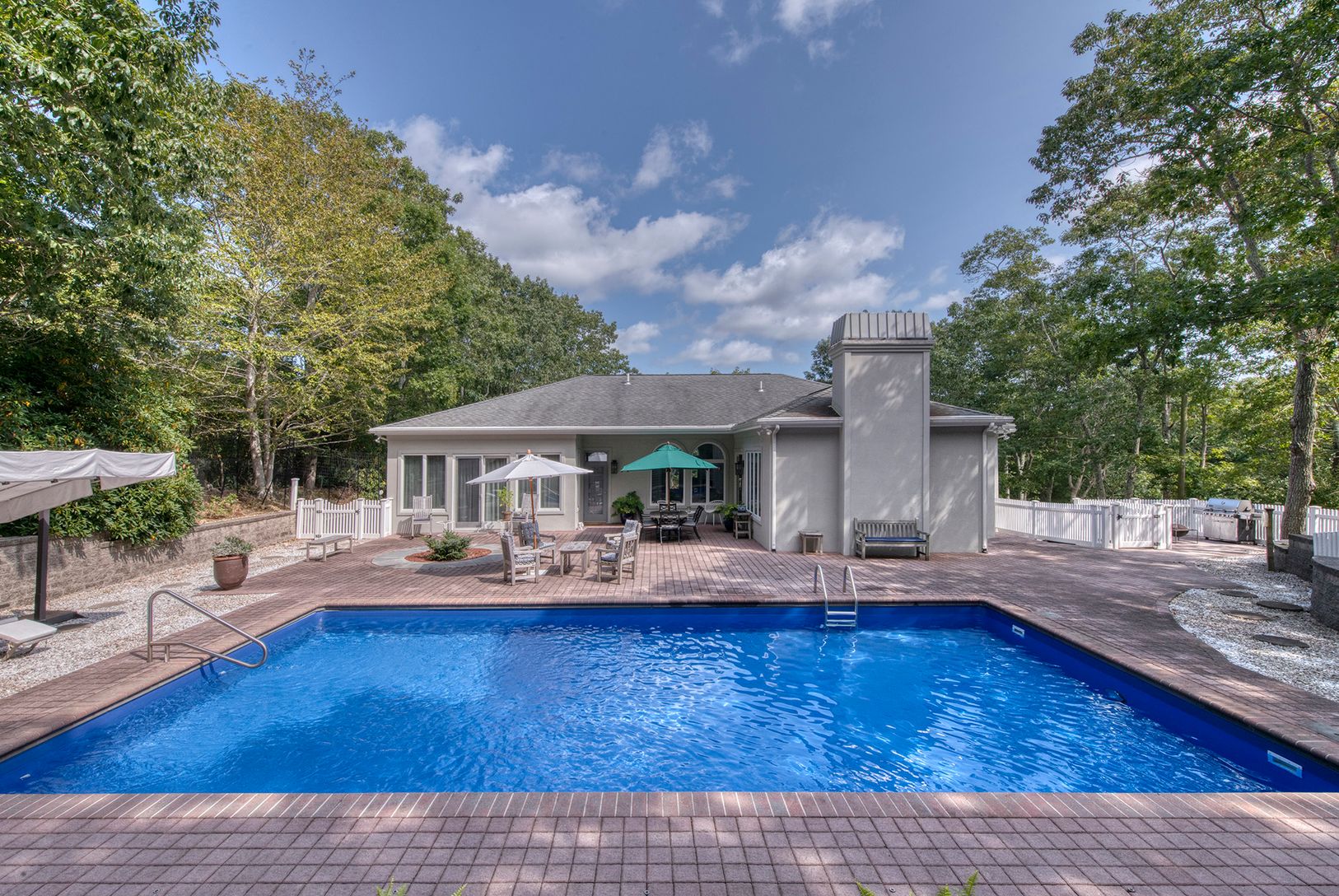 Experience coastal living at its finest in this bright, East Hampton single-story retreat. Perched on an elevated lot and nestled away from the road, this 2,650+/- sq. ft. light filled residence on 0.59+/- acres boasts vaulted ceilings and expansive windows. It features three bedrooms, three baths, and an open-concept layout with a living room, dining area, gourmet kitchen with granite countertops and a breakfast nook, family room with a wood-