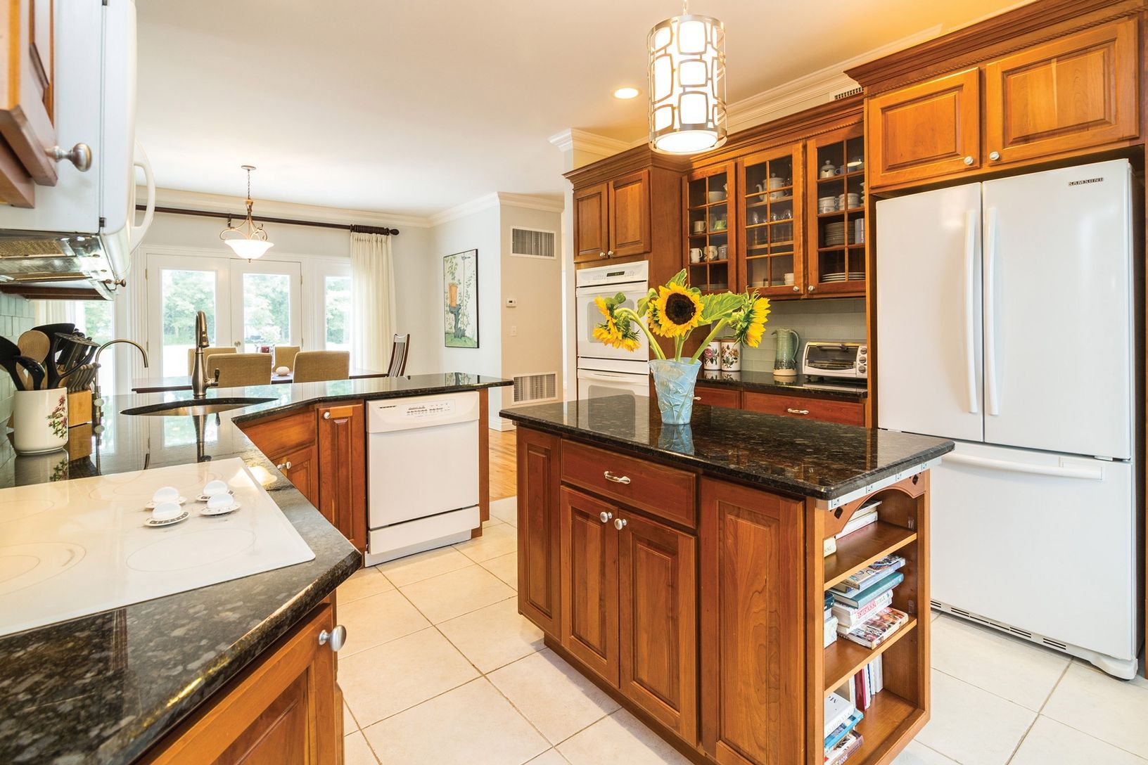 Located behind hedgerow on 1.09+/- acres on a quiet country lane, this clean contemporary awaits its next owners. Step into the front foyer, then into the living room which has elevated ceilings, a fireplace and french doors leading to the outdoor entertainment deck. Adjacent to the living room are the formal dining room, which also has outdoor access and wonderful country kitchen with granite countertops, center island, pantry and office nook