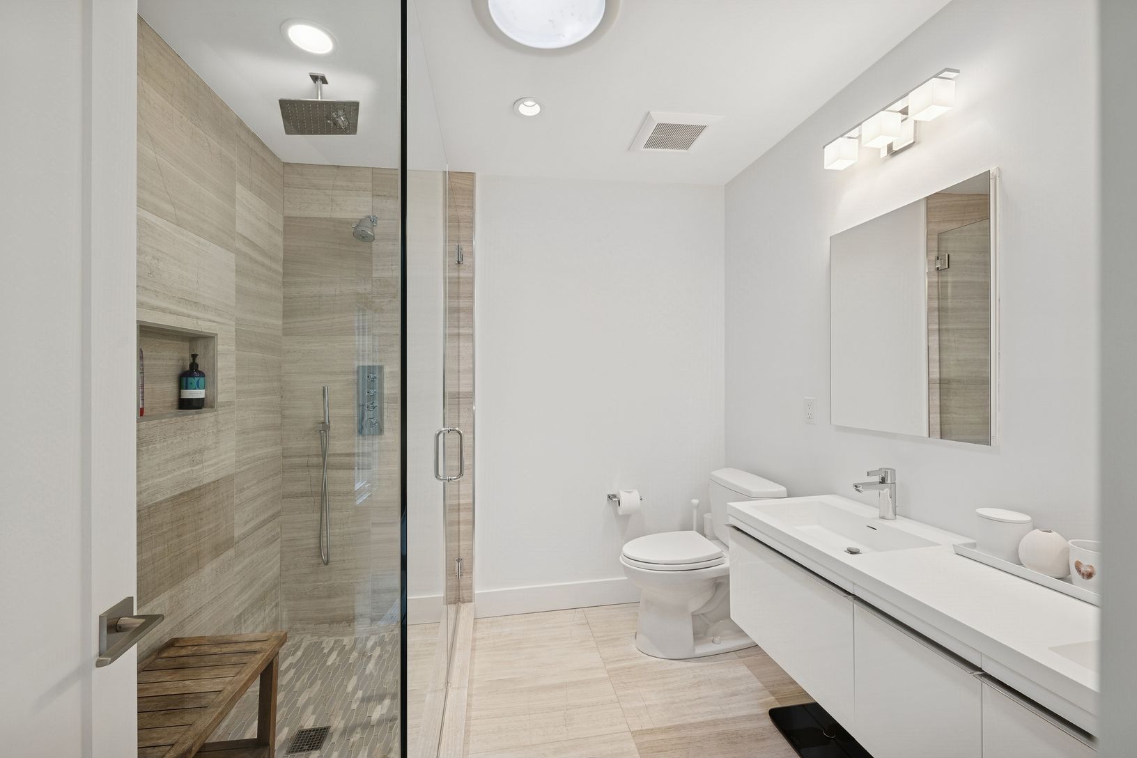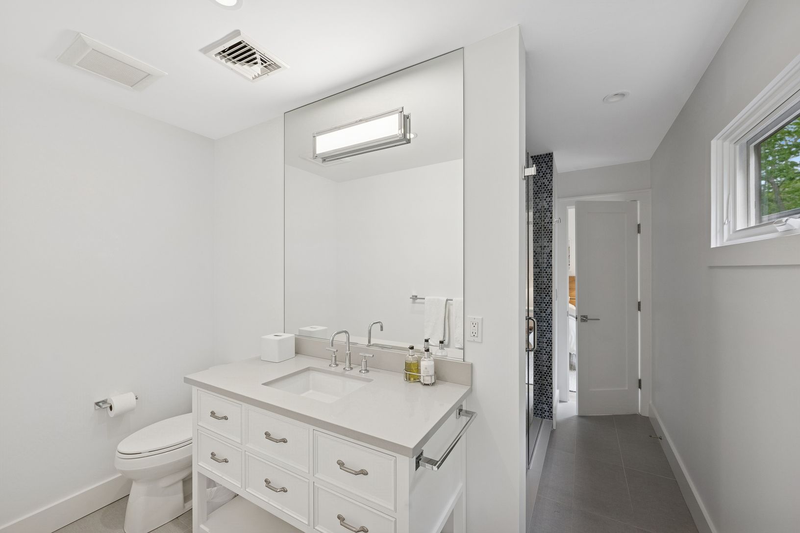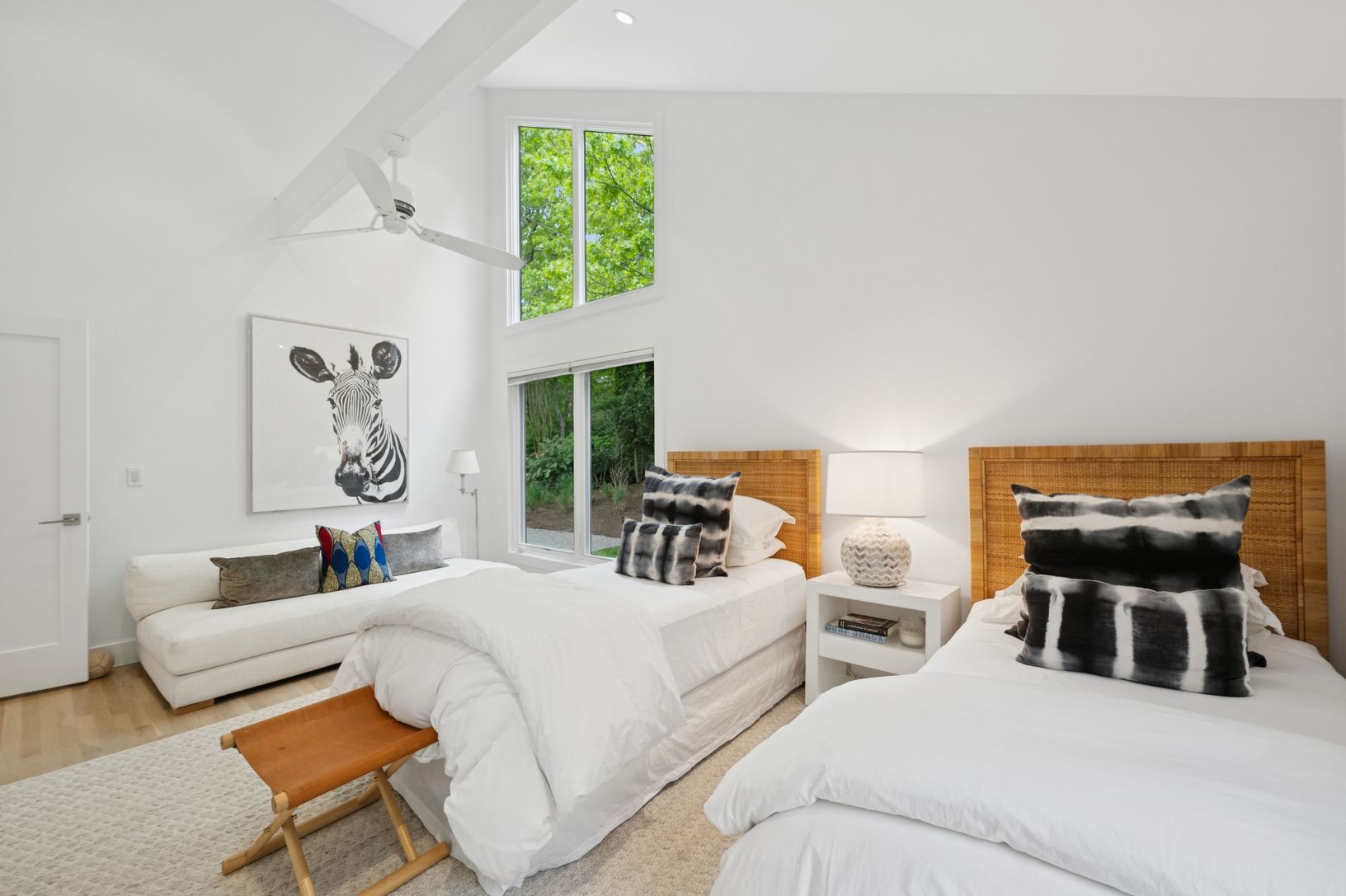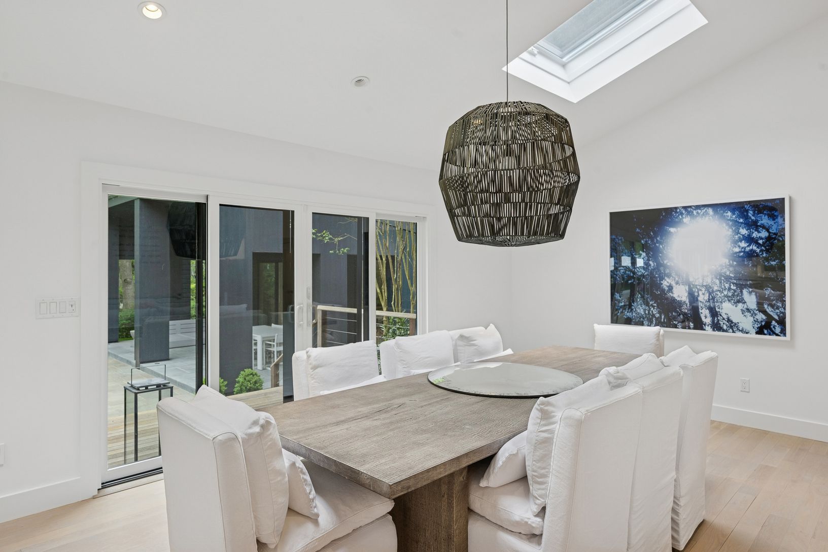 A chic modern exterior will greet you at the front door. Inside you will find a crisp, sunny Hamptons beach vibe as you enter the spacious living room with vaulted ceilings and a fireplace. The five bedrooms all have an individual quiet and calming space. The master suite has a beamed cathedral ceiling, custom finished walk-in closet and a beautiful bath with marble countertop. The guest suite also has a custom walk in closet and ample natural