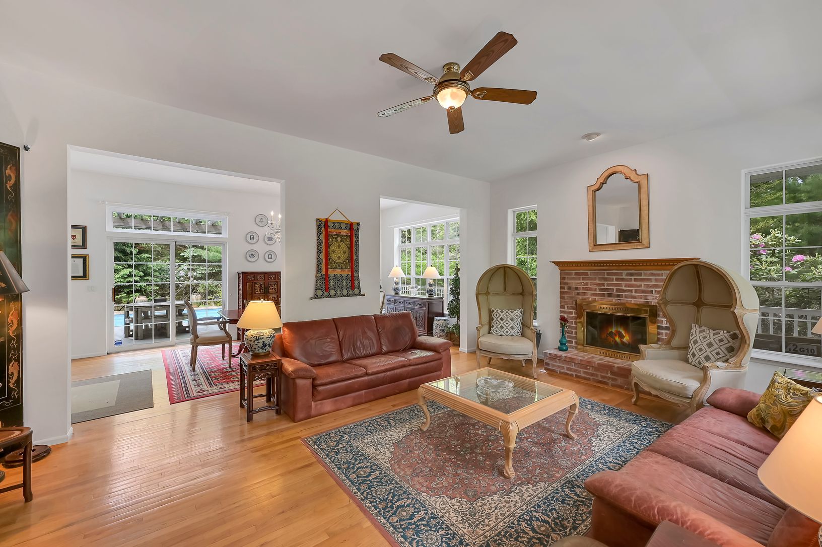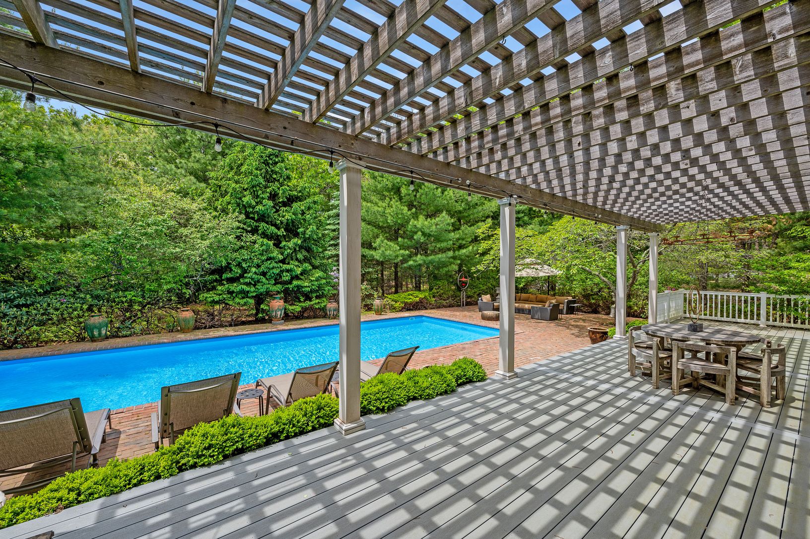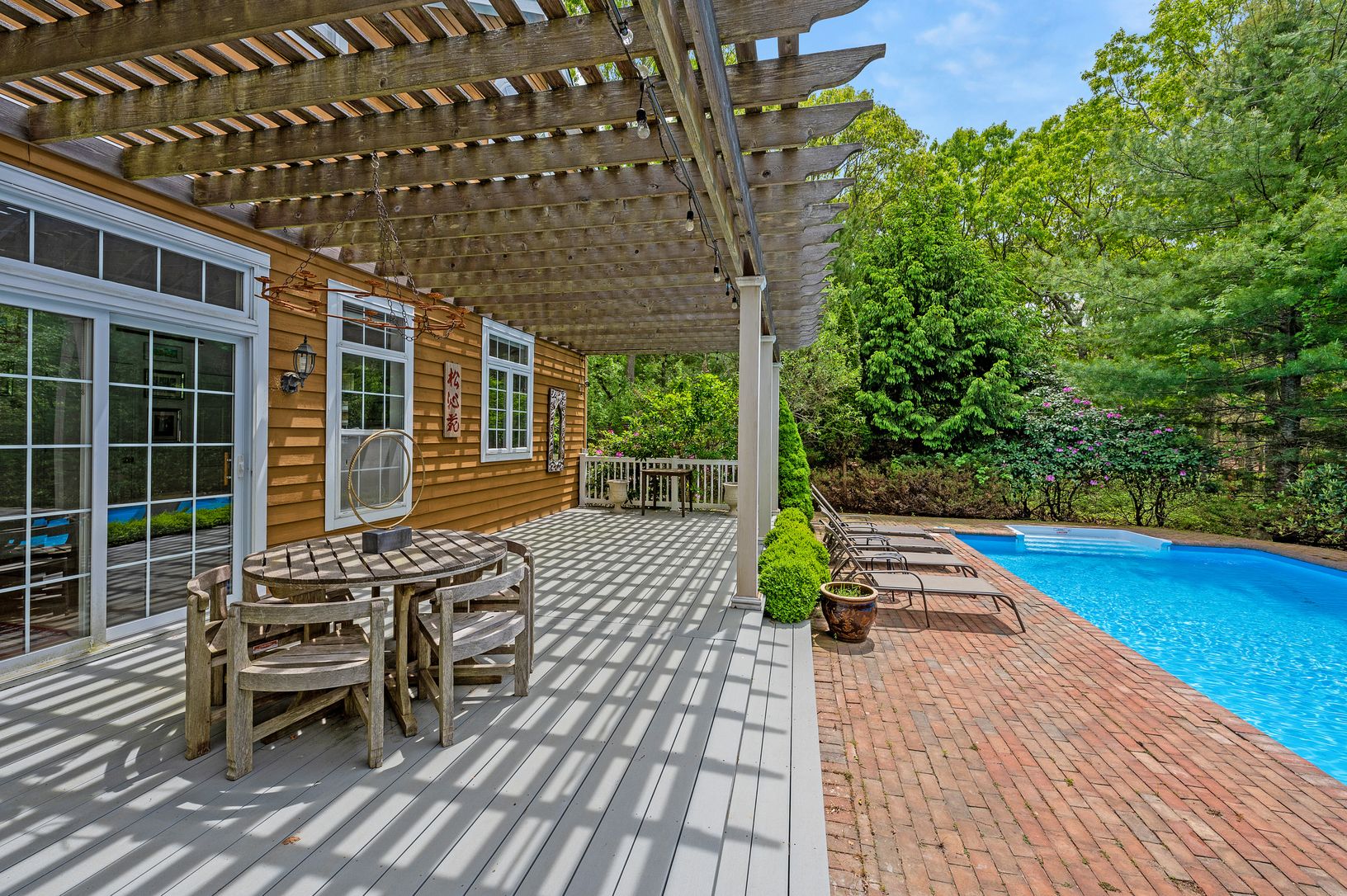Recharge your soul here surrounded by nature and sunshine. Drive into the quiet cul-de-sac and enter through the white driveway gates onto this lush, secluded 1.49 ac property. Spread out on this large, open plan first floor, complete with a bright living room, kitchen, and dining area that both overlook the pool and gardens, plus a big windowed den and a full bathroom. Enter through a separate side entrance that comes in off the driveway whic