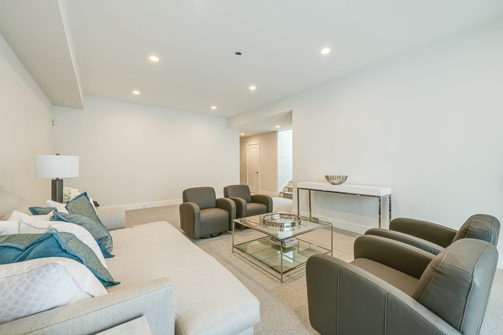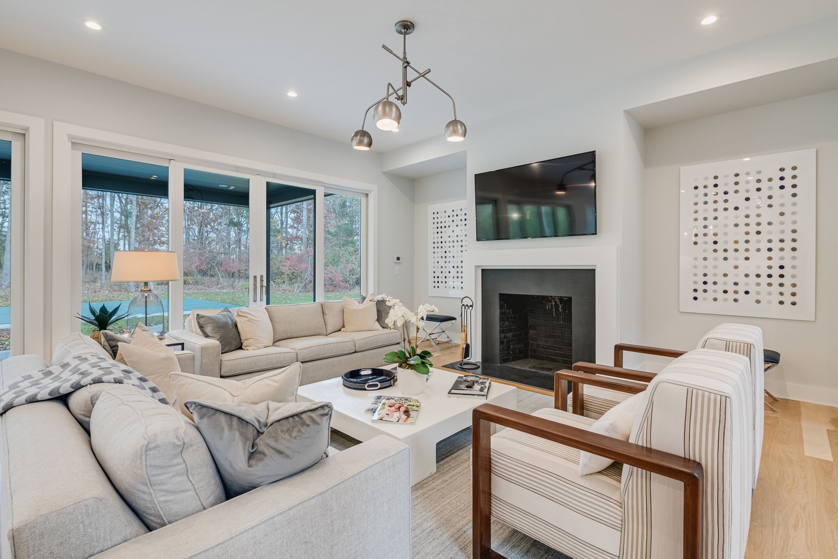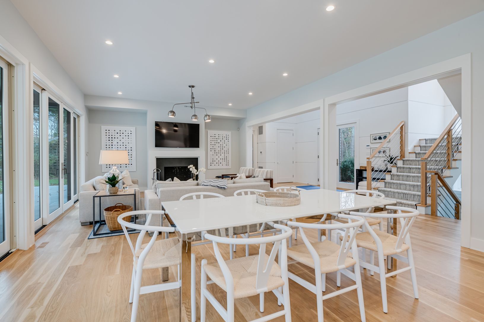 This new construction modern barn-style home built by Farrell on .7+/- acre in the Hansom Hills neighborhood of East Hampton features fine craftsmanship and modern finishes throughout. The home provides 4,458+/- sq. ft. of living space (including finished lower level) with six bedrooms and six and a half baths. A grand entry foyer opens to open concept first floor living areas with 10' ceilings, including a living room with fireplace and eat-