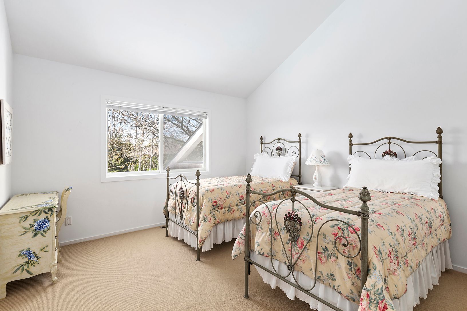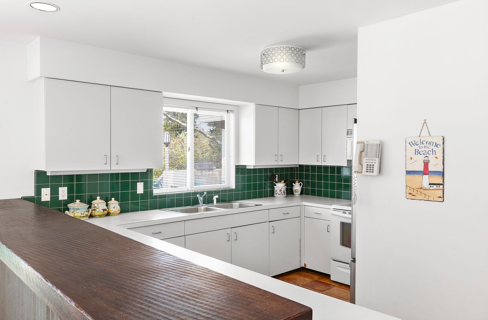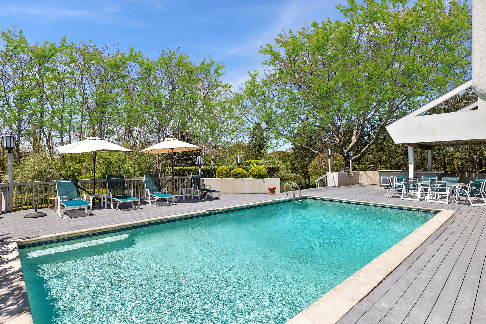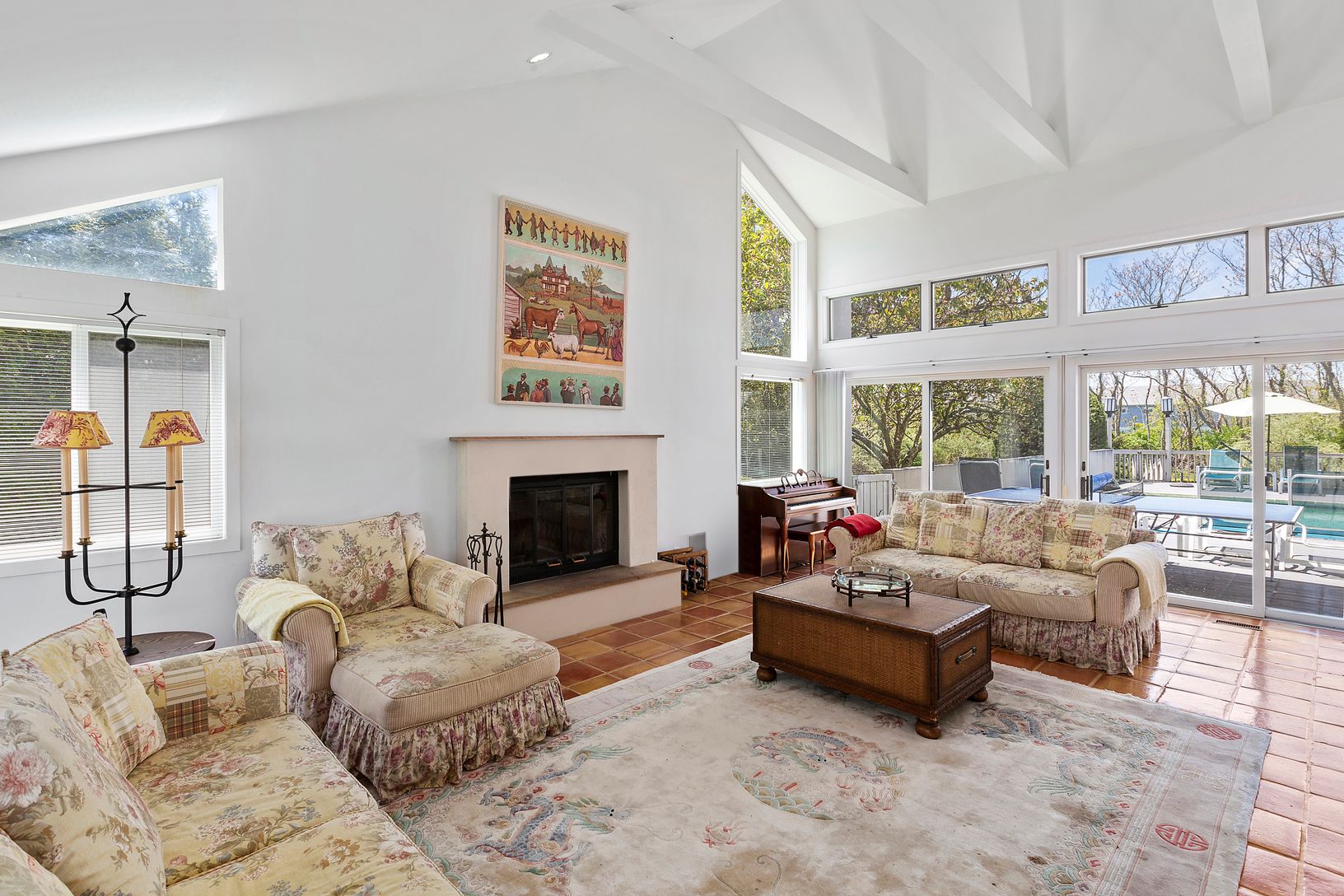 Located in the heart of Westhampton Beach Village, just one block south of Main Street on a quiet cul-de-sac, sits this 3400 sq foot two-story contemporary home. The one-acre property is lush with beautiful landscaping, including a koi pond, and an expansive lawn. The light filled living room with cathedral ceilings includes a wood burning fireplace and sliding doors that lead to decks on both sides of the room. The dining room opens to the ki