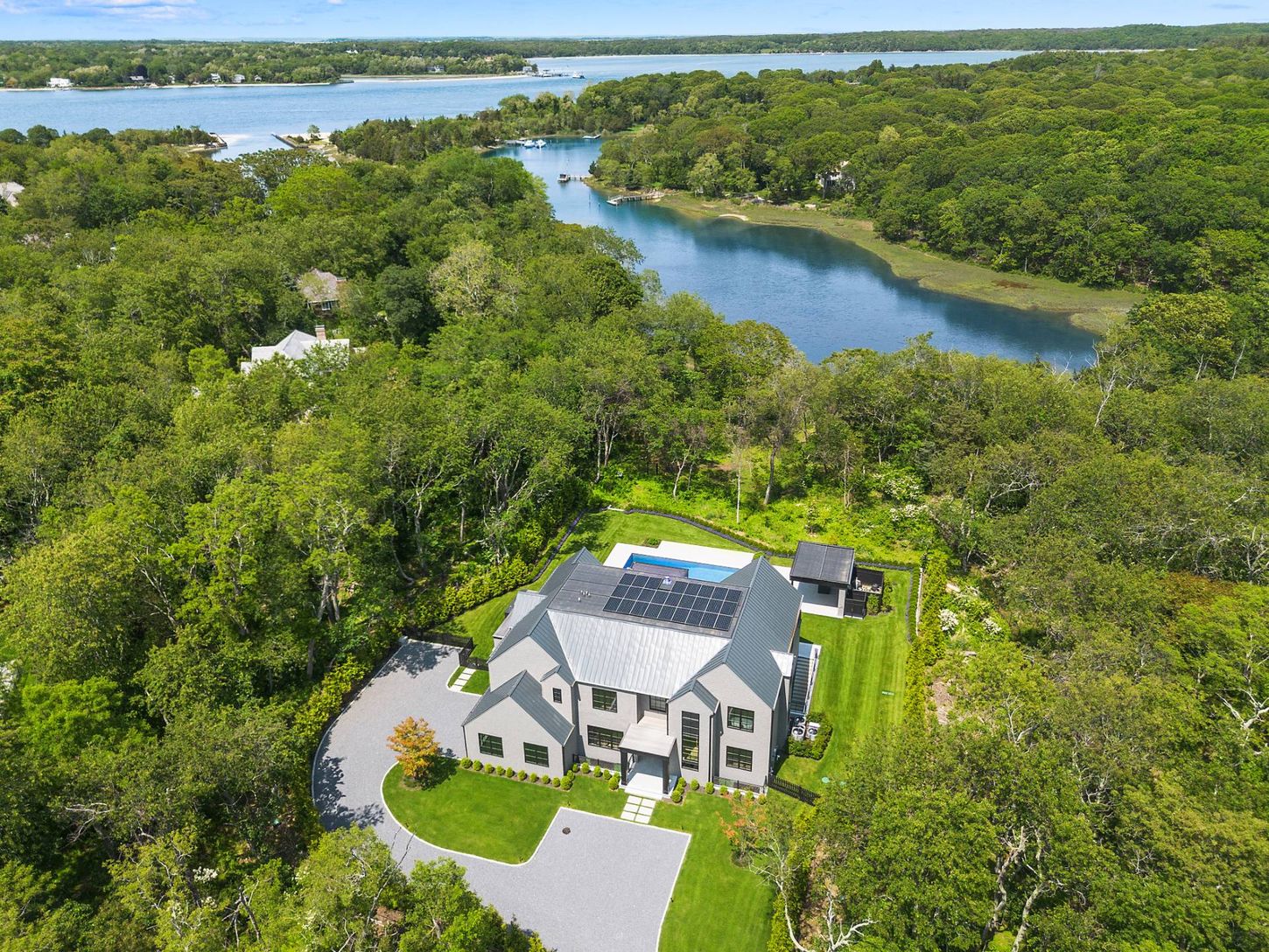 Just completed, an exciting new luxury residence by BJC Custom Homes. Secluded on 2 acres in North Haven Point on the banks of serene Ganet Creek. Truly among nature and just minutes to Sag Harbor Village. Enjoy all the area has to offer: private beach, 3 pristine championship tennis courts and basketball. Designed and crafted to perfection by master builder Matt Pantofel. 9,692 sf of luxury living on three levels with elevator, high-end finis