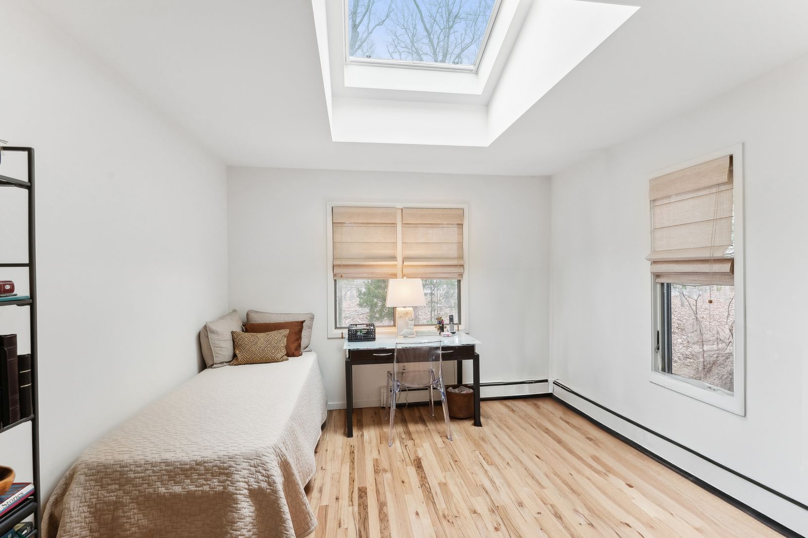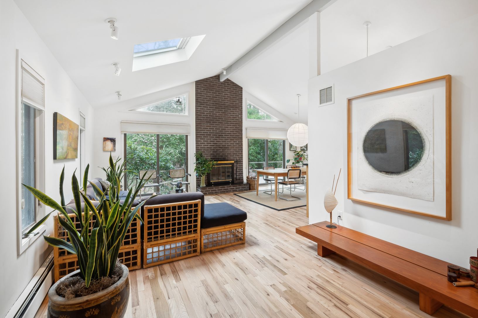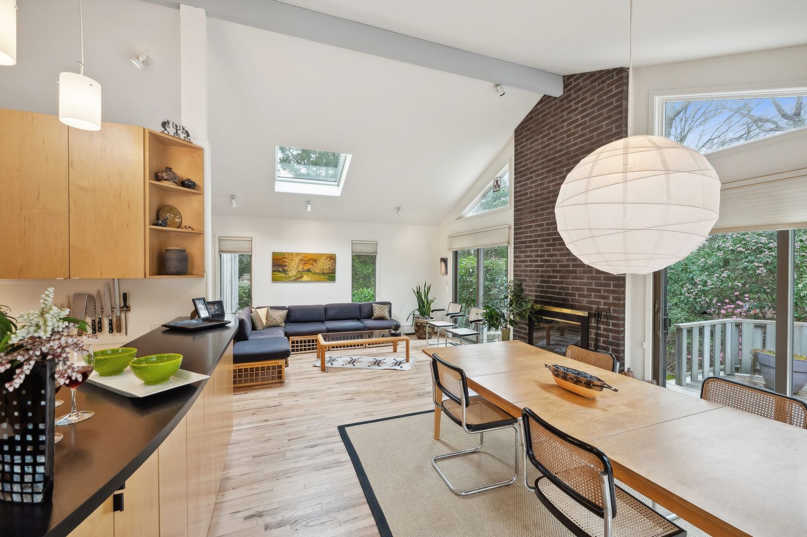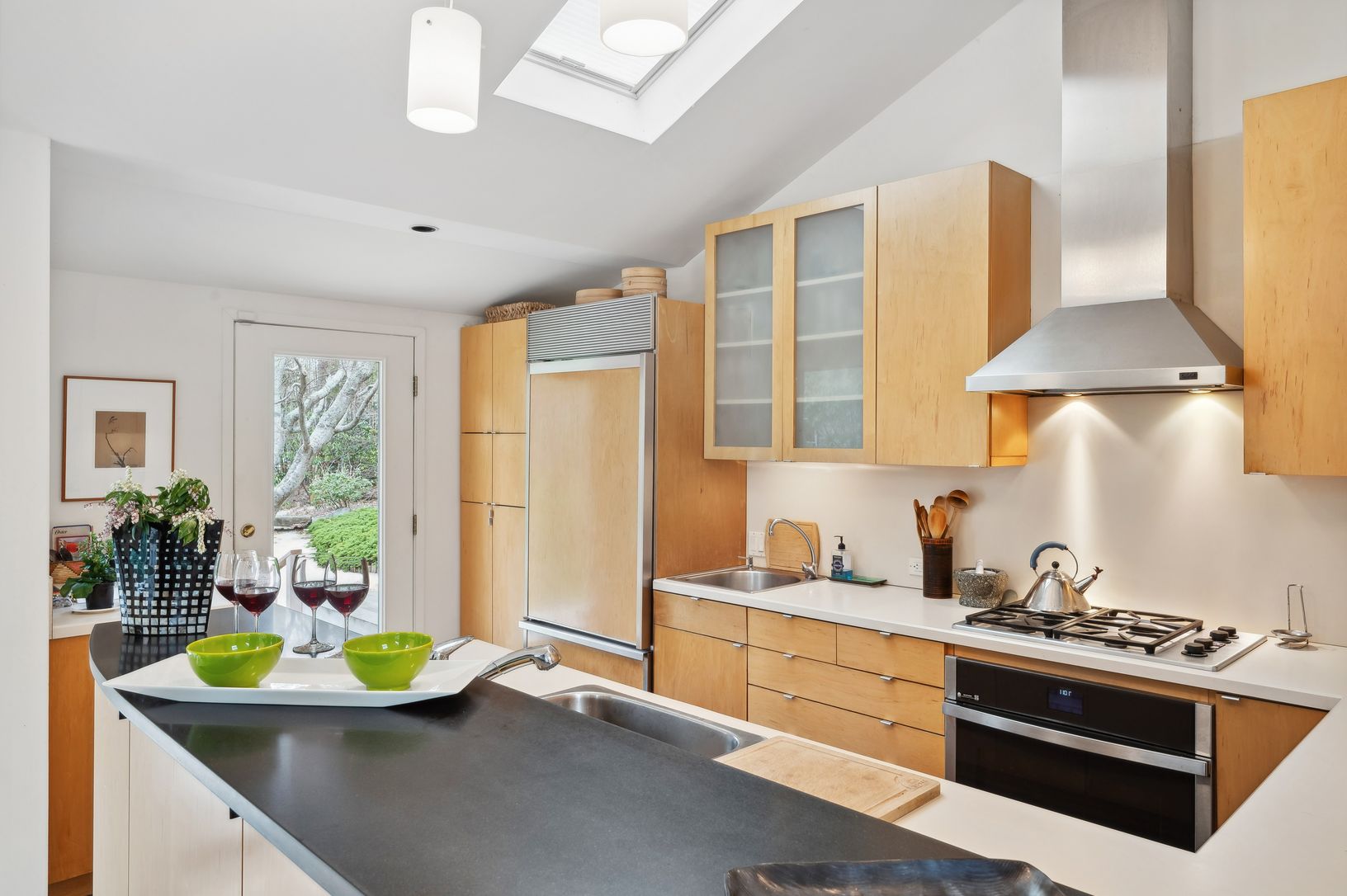 It offers a light filled open floor plan with living room,dining and chef’s kitchen, Sub Zero, Boch dishwasher, gas cooktop and electric oven and two sinks.