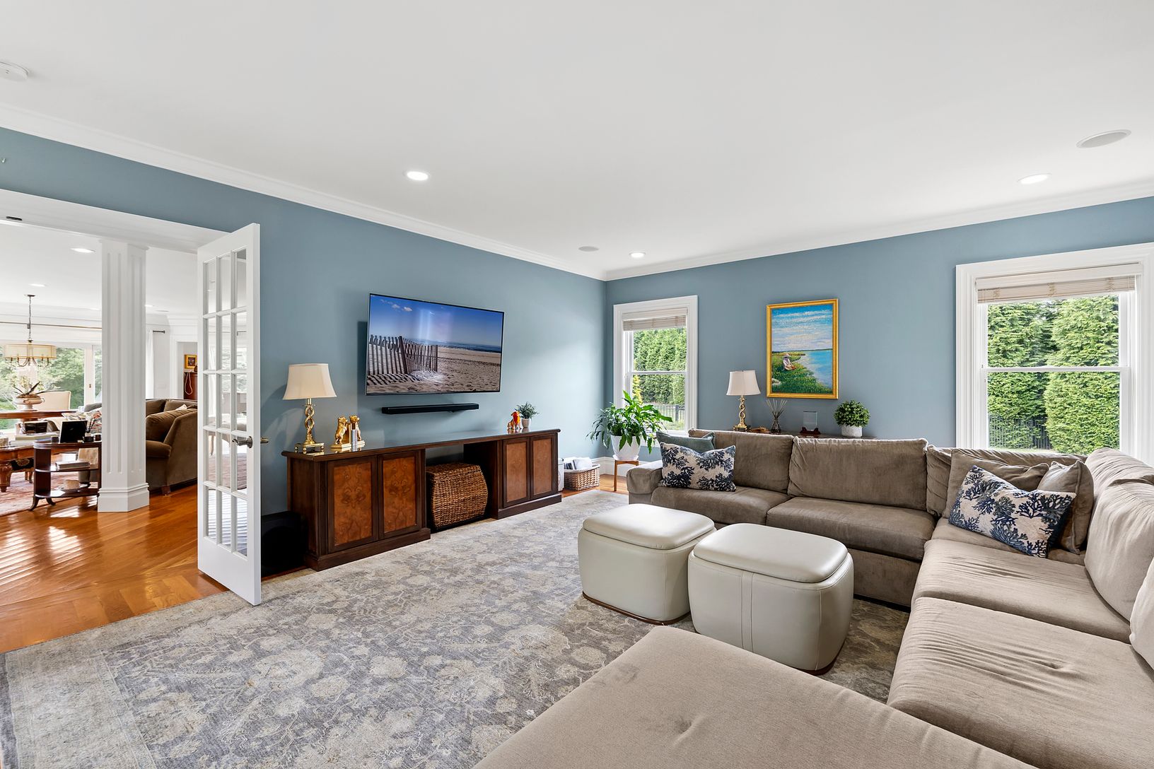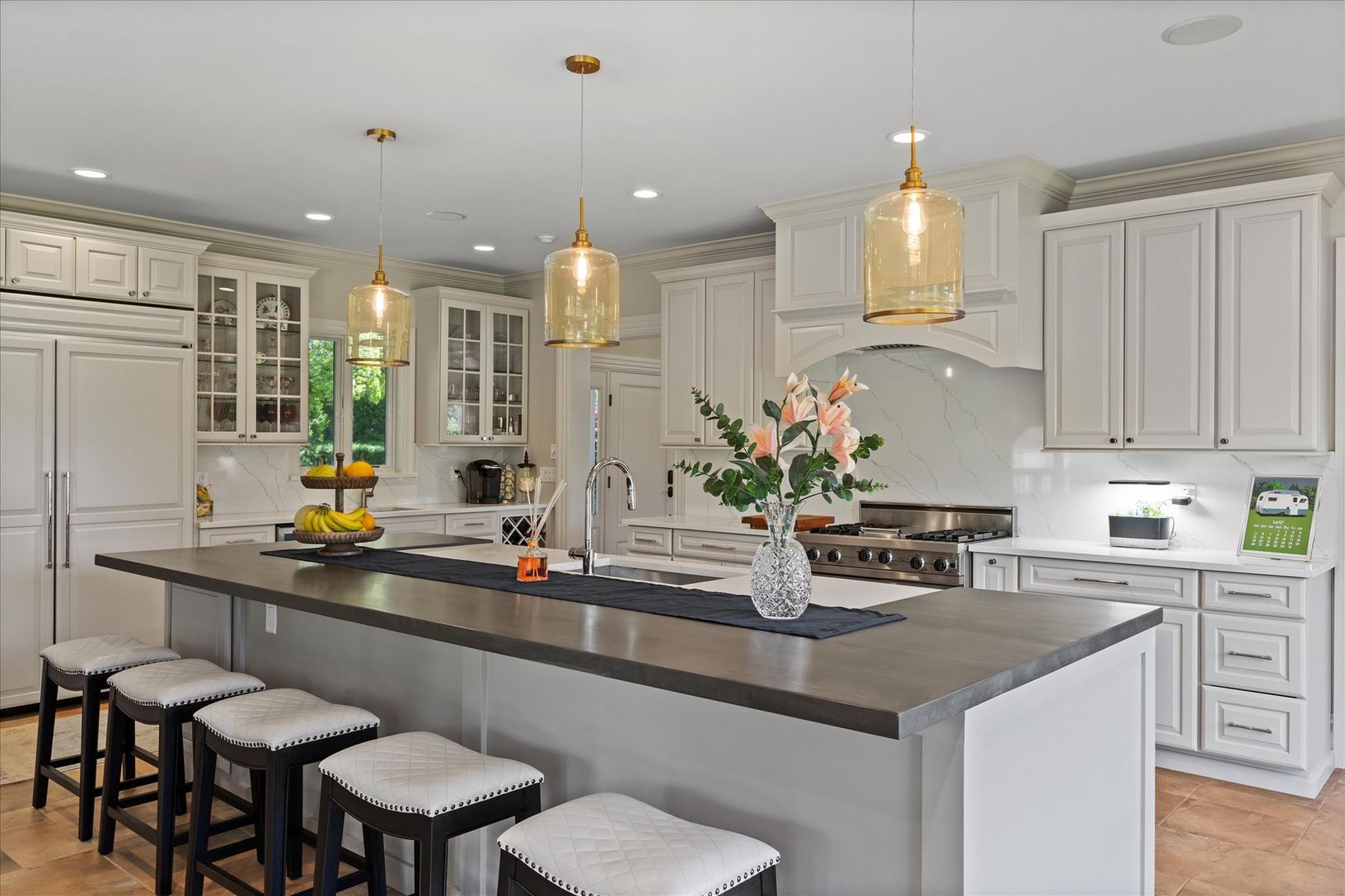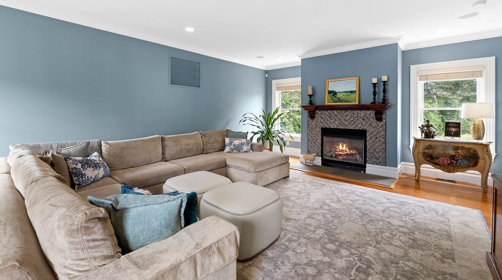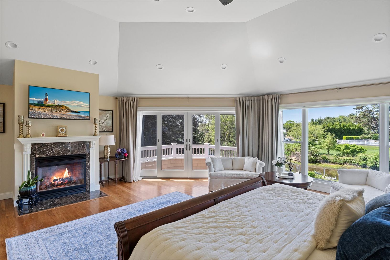 Situated on 1.15 acres of waterfront property, this custom post modern home, with 4 bedrooms and 3.5 bathrooms, offers multiple living areas with a formal living/dining room with wood burning fireplace, spacious den with gas fireplace, and additional family room adjacent to the kitchen. There are hardwood floors, custom mill work and oversized crown moldings throughout the house. The newly renovated open kitchen features a large center island