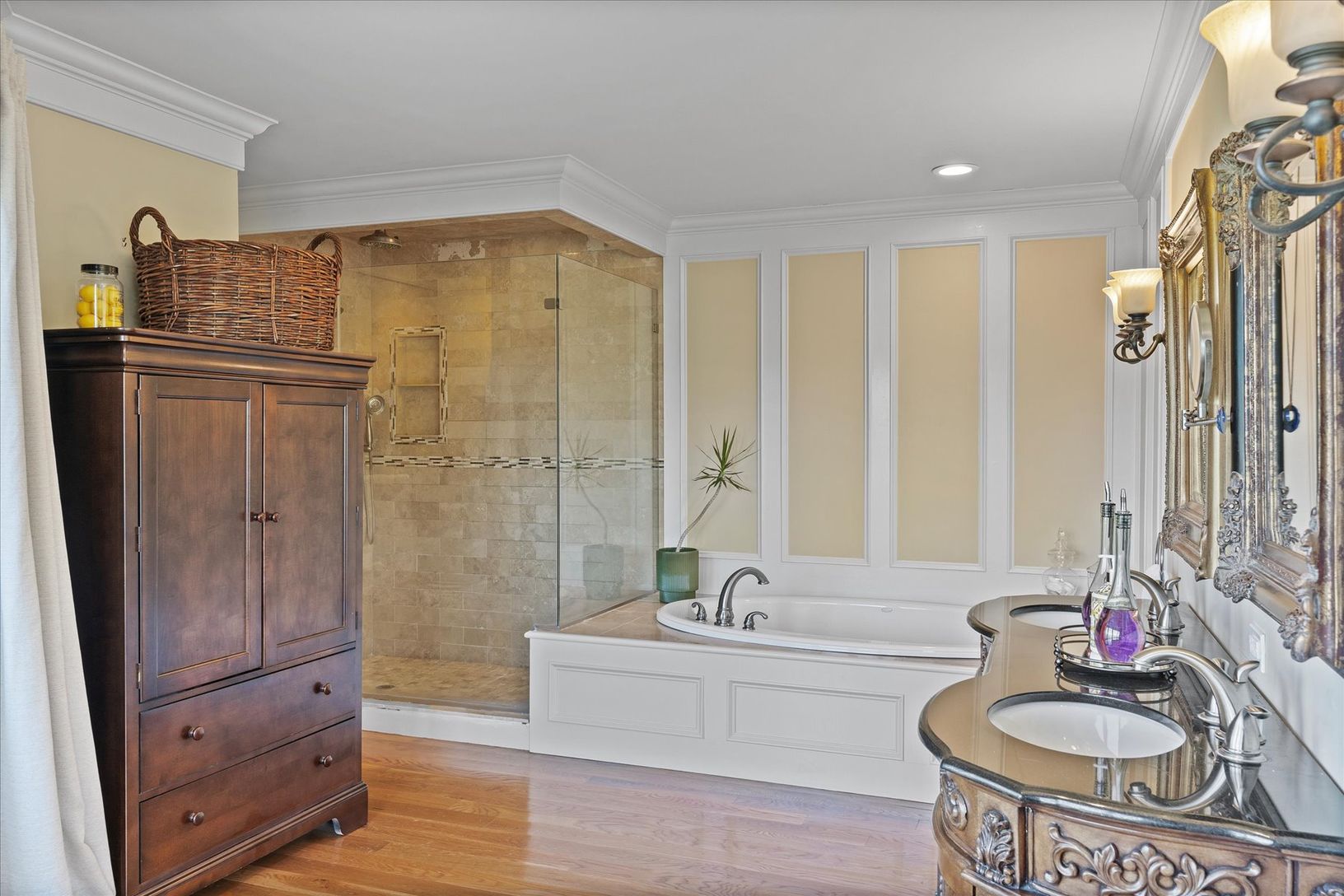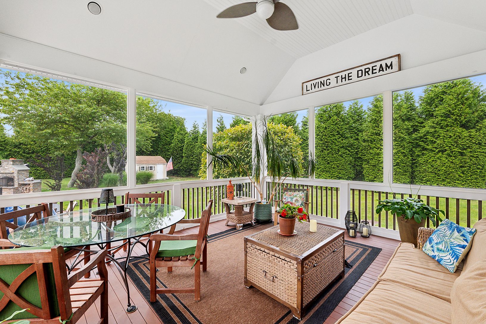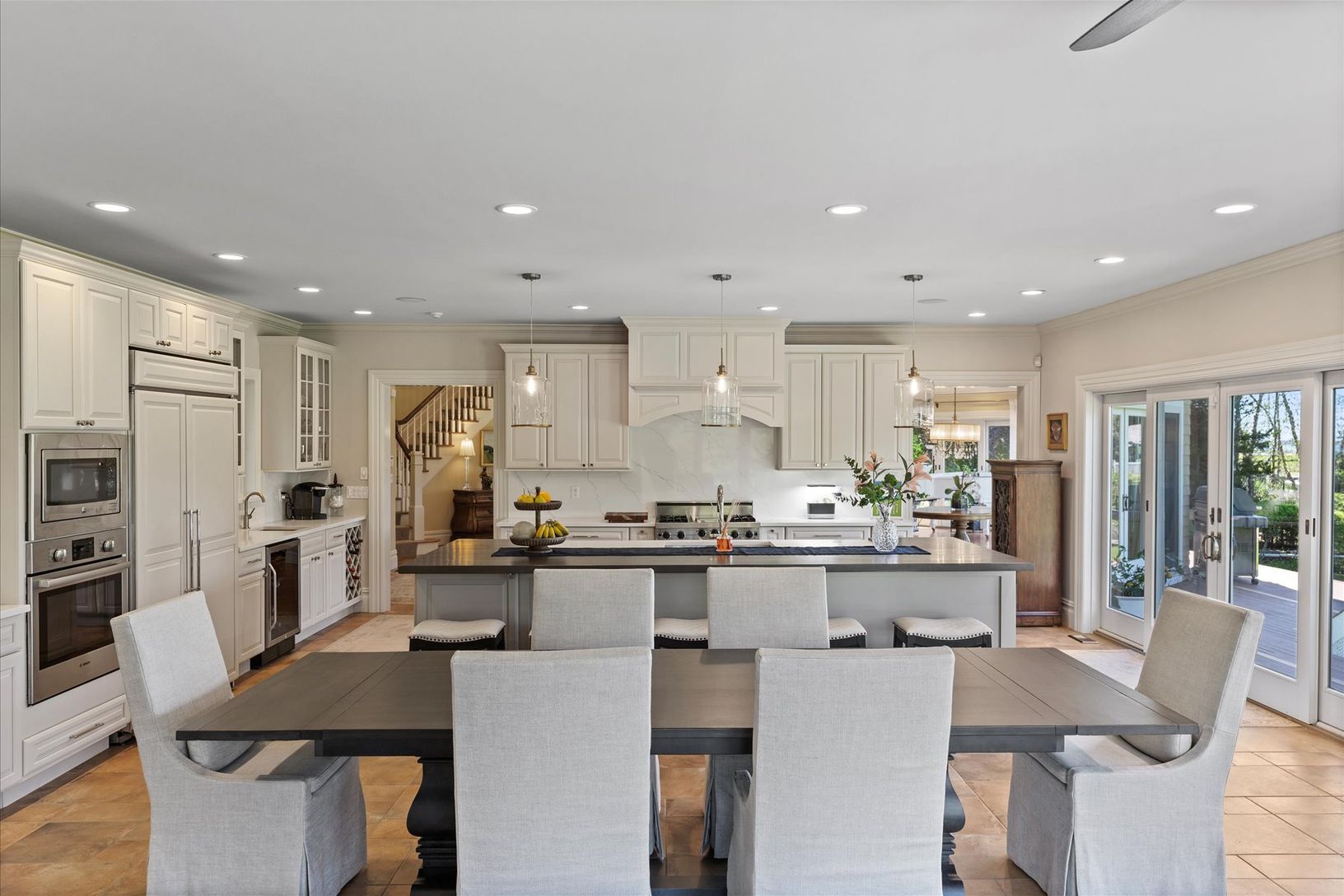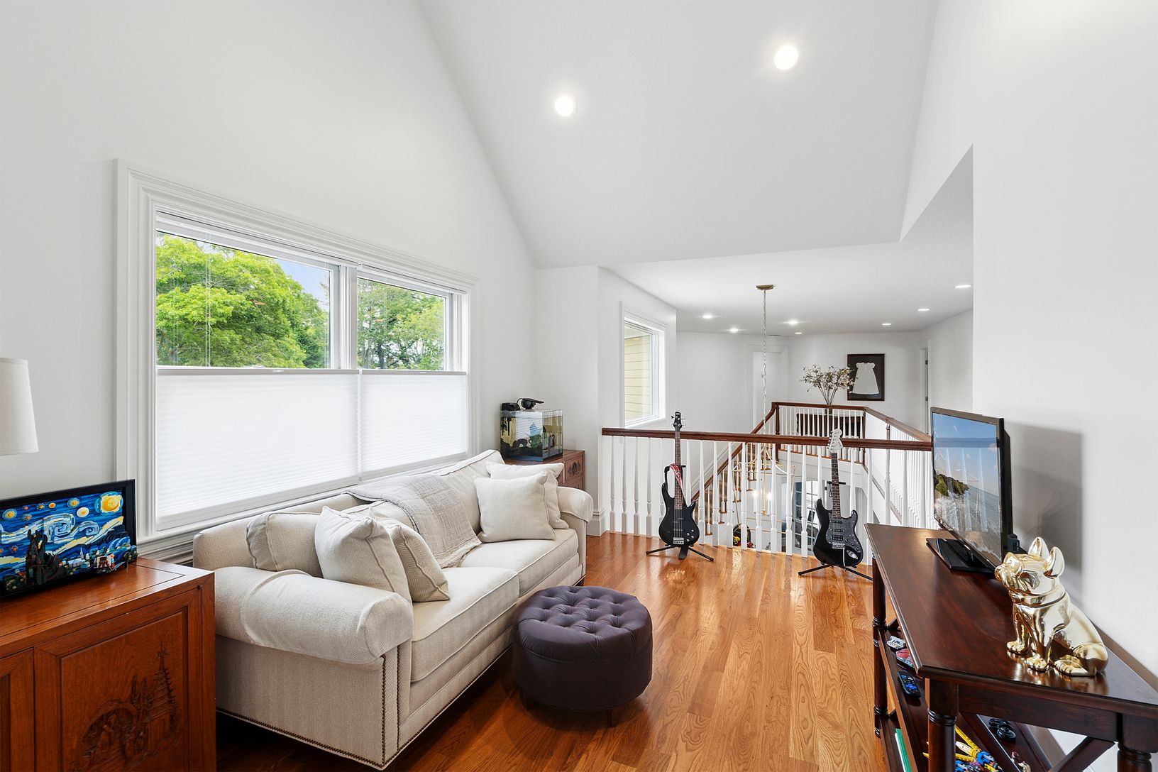 Situated on 1.15 acres of waterfront property, this custom post modern home, with 4 bedrooms and 3.5 bathrooms, offers multiple living areas with a formal living/dining room with wood burning fireplace, spacious den with gas fireplace, and additional family room adjacent to the kitchen. There are hardwood floors, custom mill work and oversized crown moldings throughout the house. The newly renovated open kitchen features a large center island