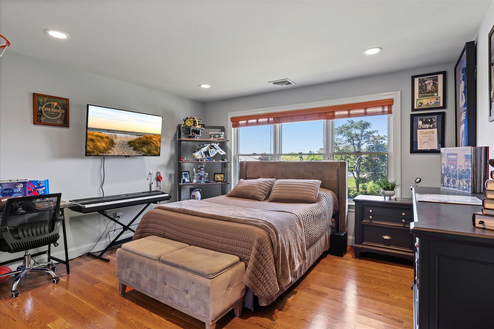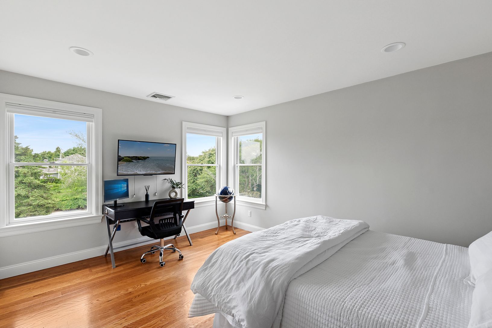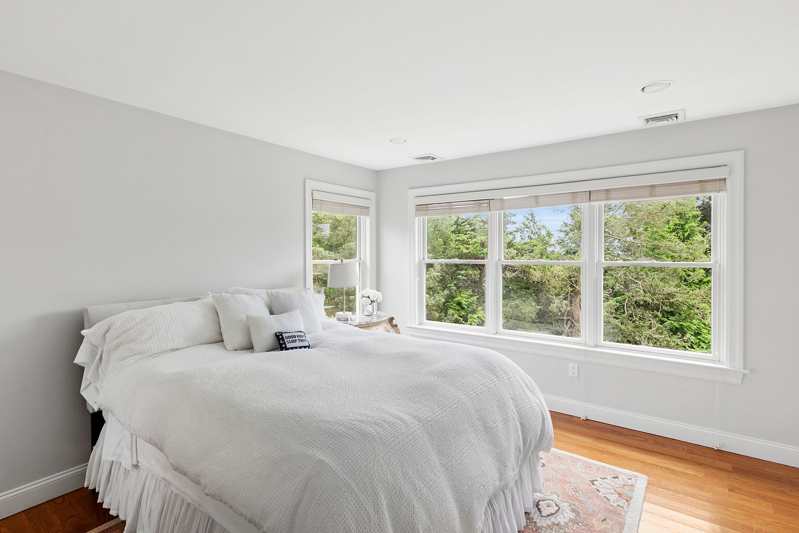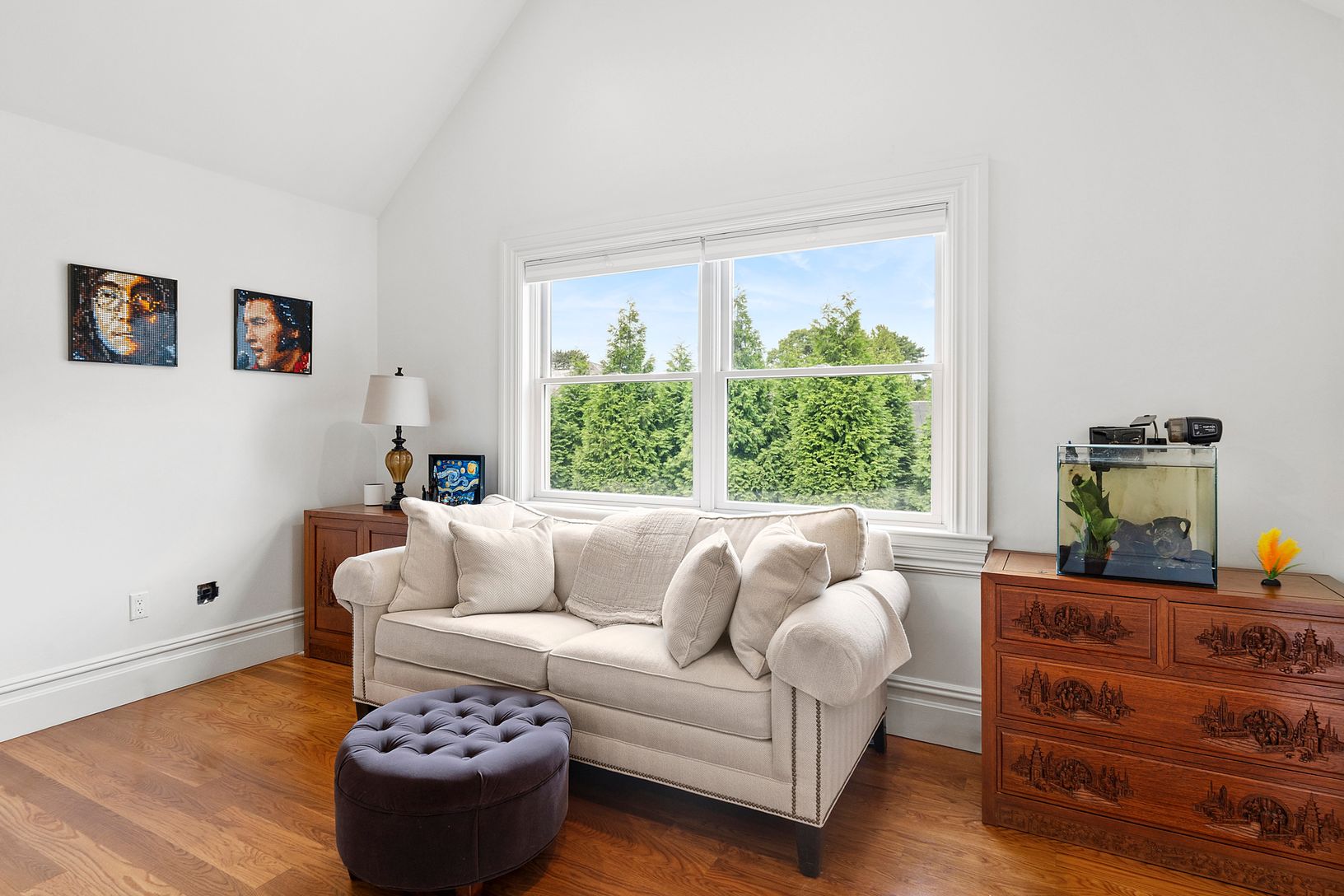 Situated on 1.15 acres of waterfront property, this custom post modern home, with 4 bedrooms and 3.5 bathrooms, offers multiple living areas with a formal living/dining room with wood burning fireplace, spacious den with gas fireplace, and additional family room adjacent to the kitchen. There are hardwood floors, custom mill work and oversized crown moldings throughout the house. The newly renovated open kitchen features a large center island