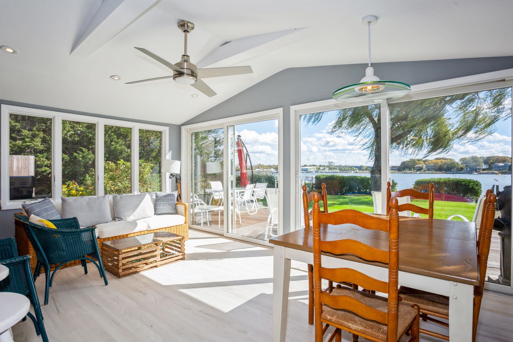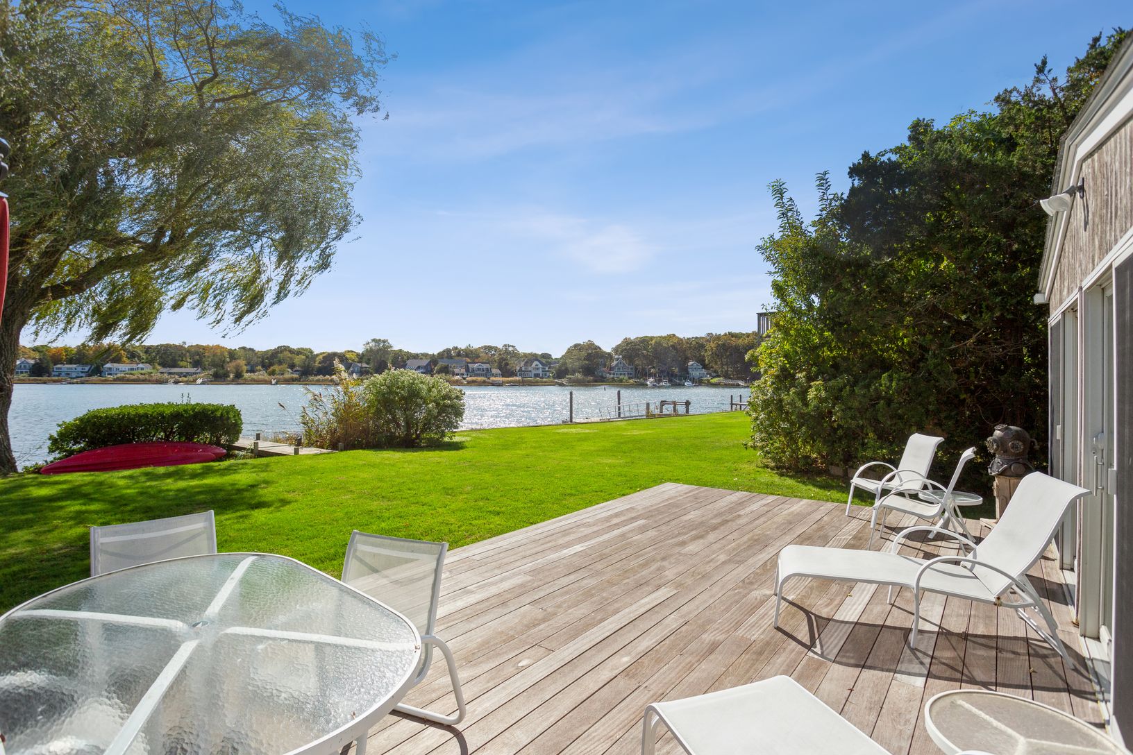 The best views ever.... comfortable, well kept cottage is on the water with its own dock. Features three bedrooms, two baths, both newly renovated with washer/dryer) an open kitchen/living/dining area plus a relaxing TV/ living room. Wonderful waterside deck to dine, relax and watch the boats go by. Nice front and rear yard for play, beach at end of road as well. Close to the village and across the way to Foster Memorial/Long Beach.Enjoy kaya