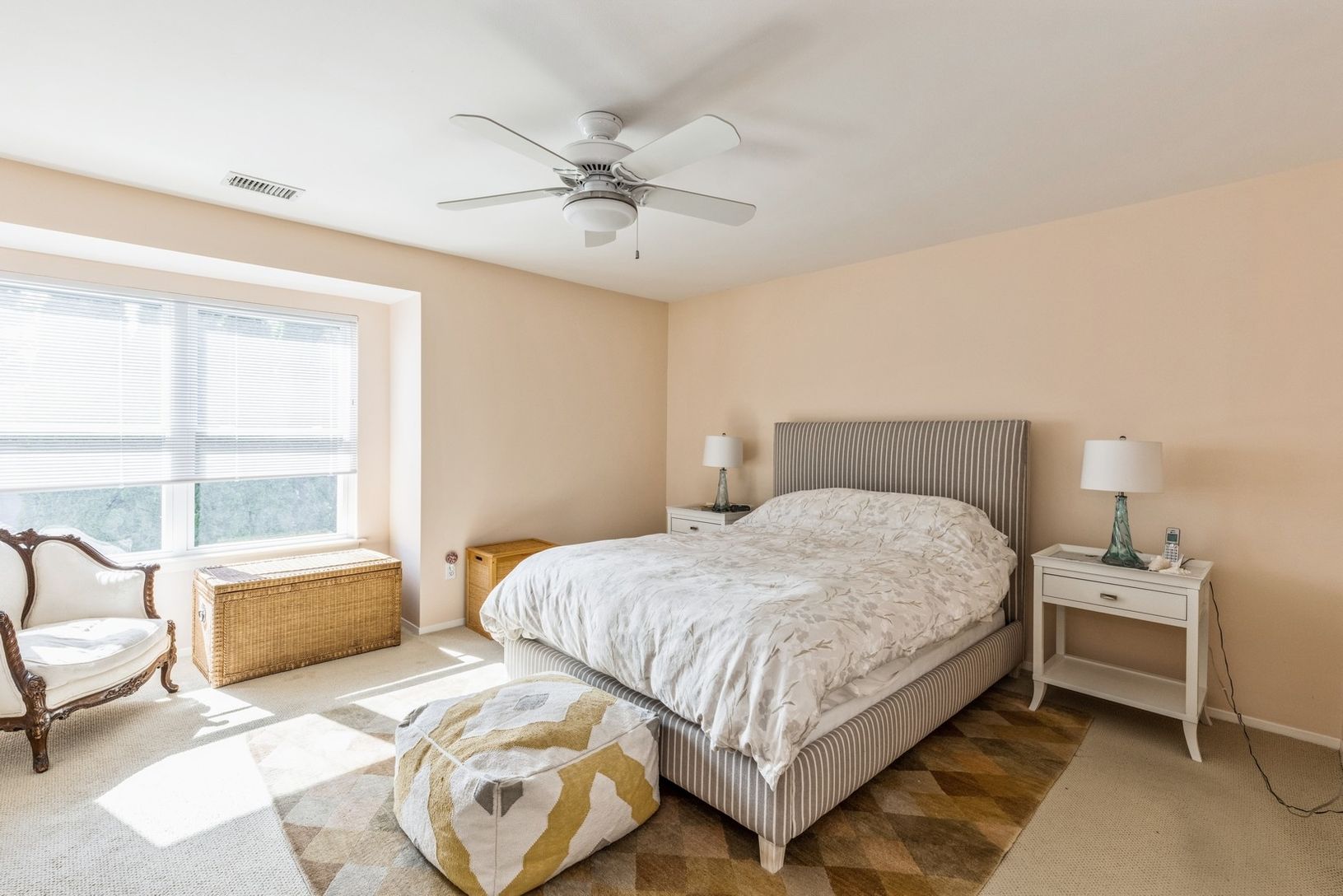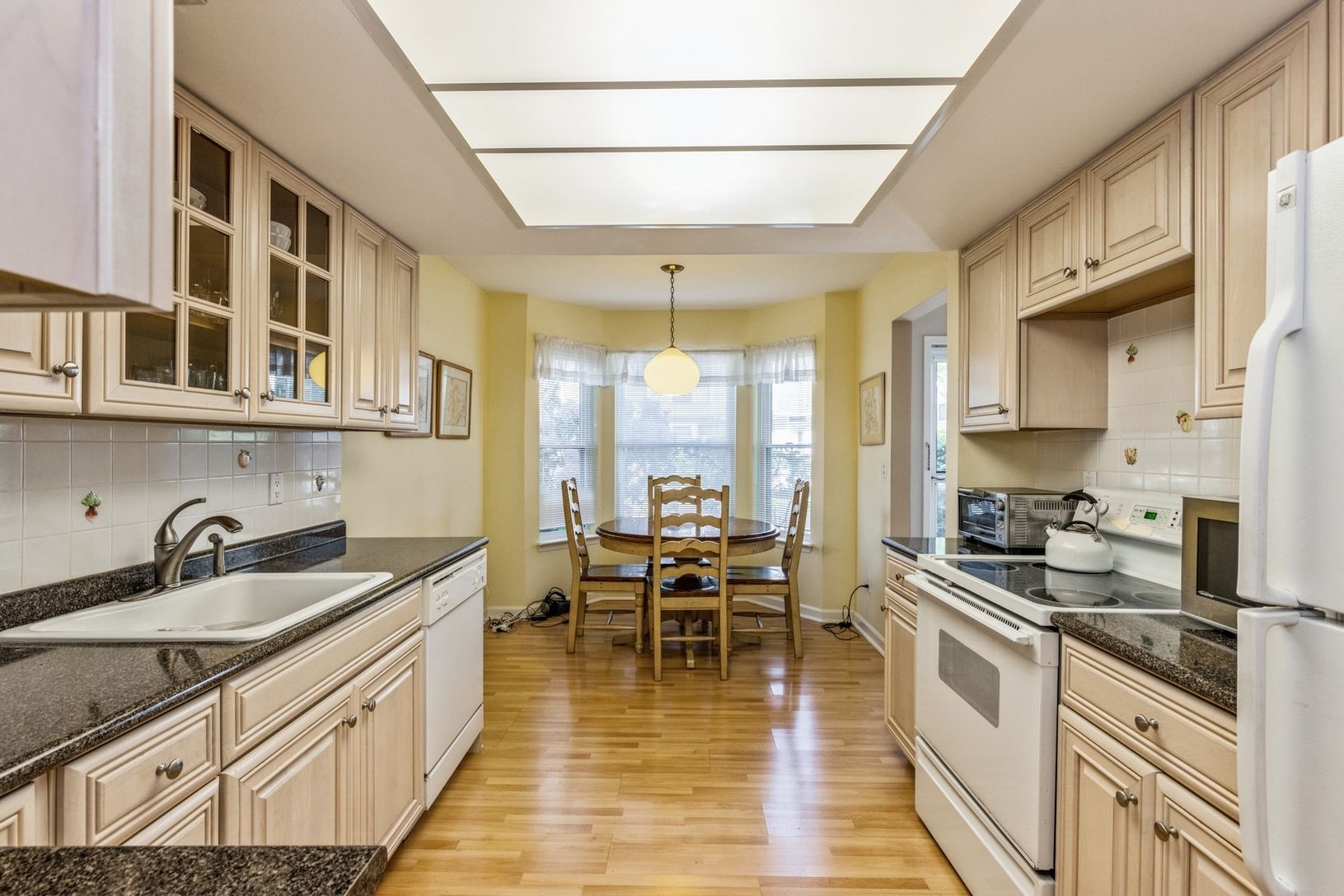 Pristine 3 bedrooms, 2.5 baths, centrally located in The Commons. First floor has a bright eat-in kitchen with light wood cabinets and granite countertops, powder room, utility area with washer and dryer, dining room, a lovely living area with fireplace and a large sunny patio for your personal use. Skylit upstairs has three bedrooms and two full baths, Community putting green, beautiful pool, gym, bocce court, tennis courts and pickle ball co