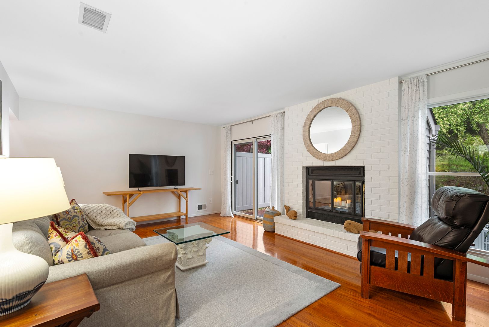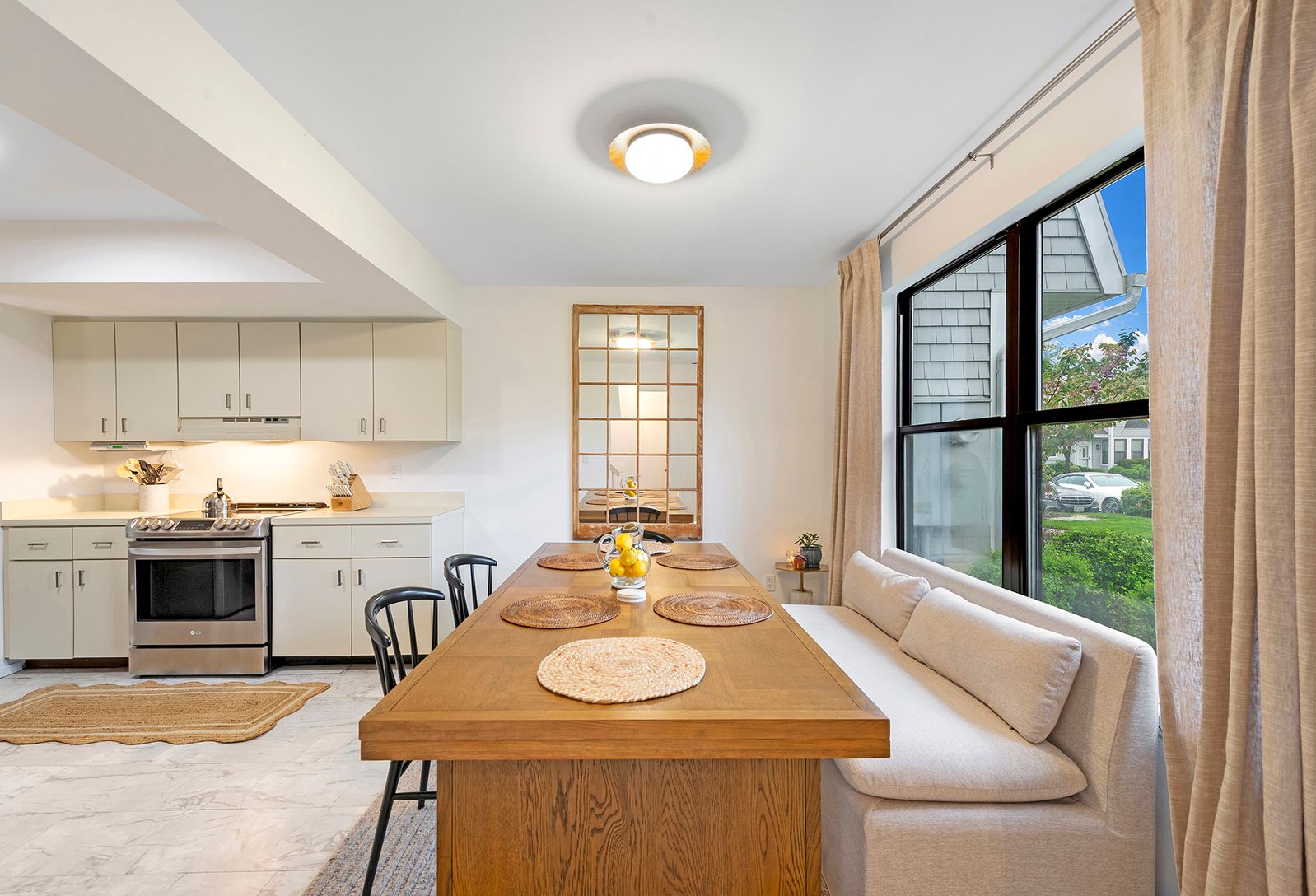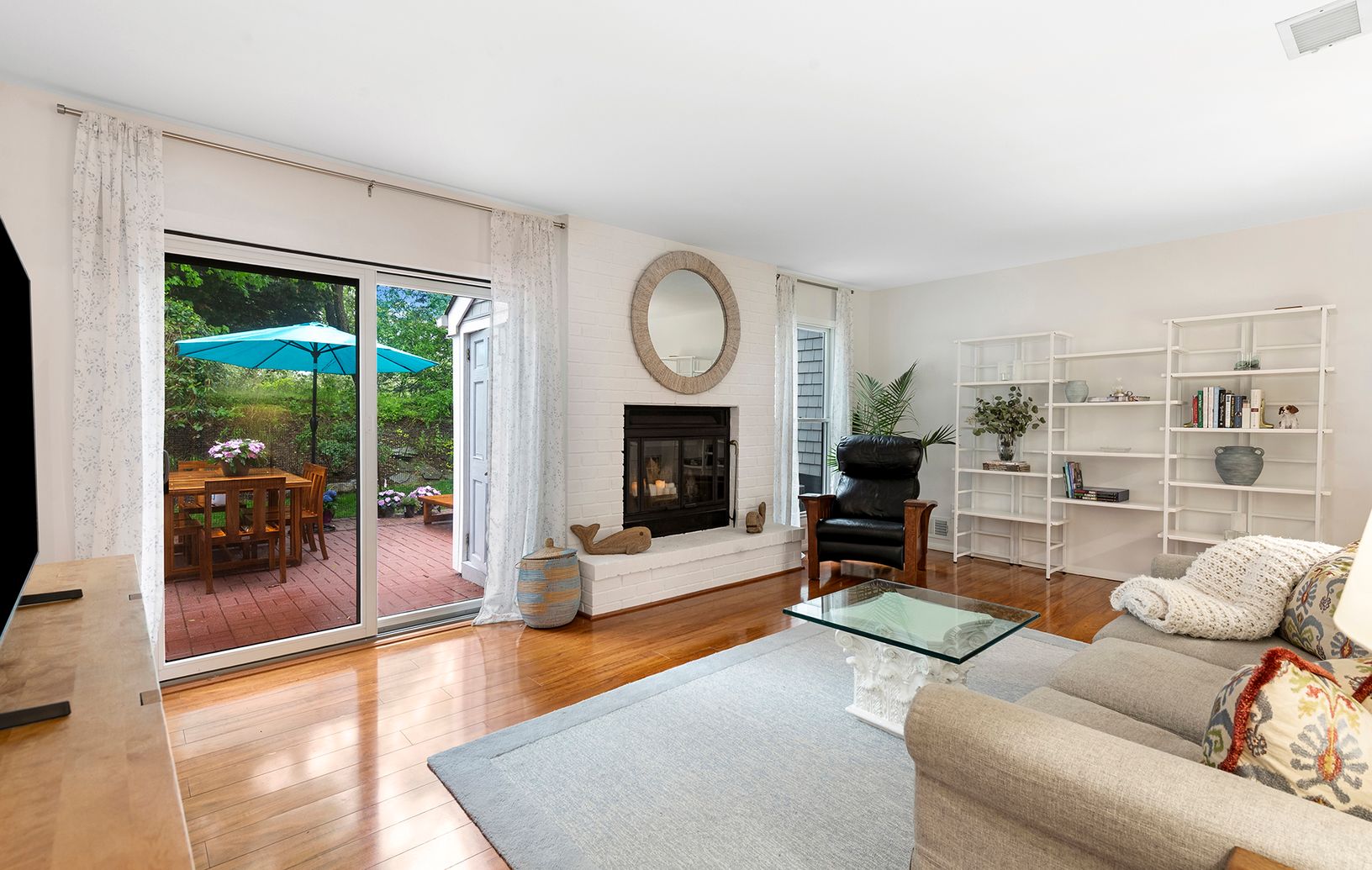 Experience the ultimate Hamptons getaway in this exquisitely maintained, south-facing townhome. Spanning two levels of light-filled living space, the home opens with a dramatic double-height entryway that flows into a spacious living room centered around a cozy wood-burning fireplace. Whether you're hosting a summer dinner in the airy eat-in kitchen or enjoying a quiet morning on your private, sun-soaked patio, the layout is designed for effor