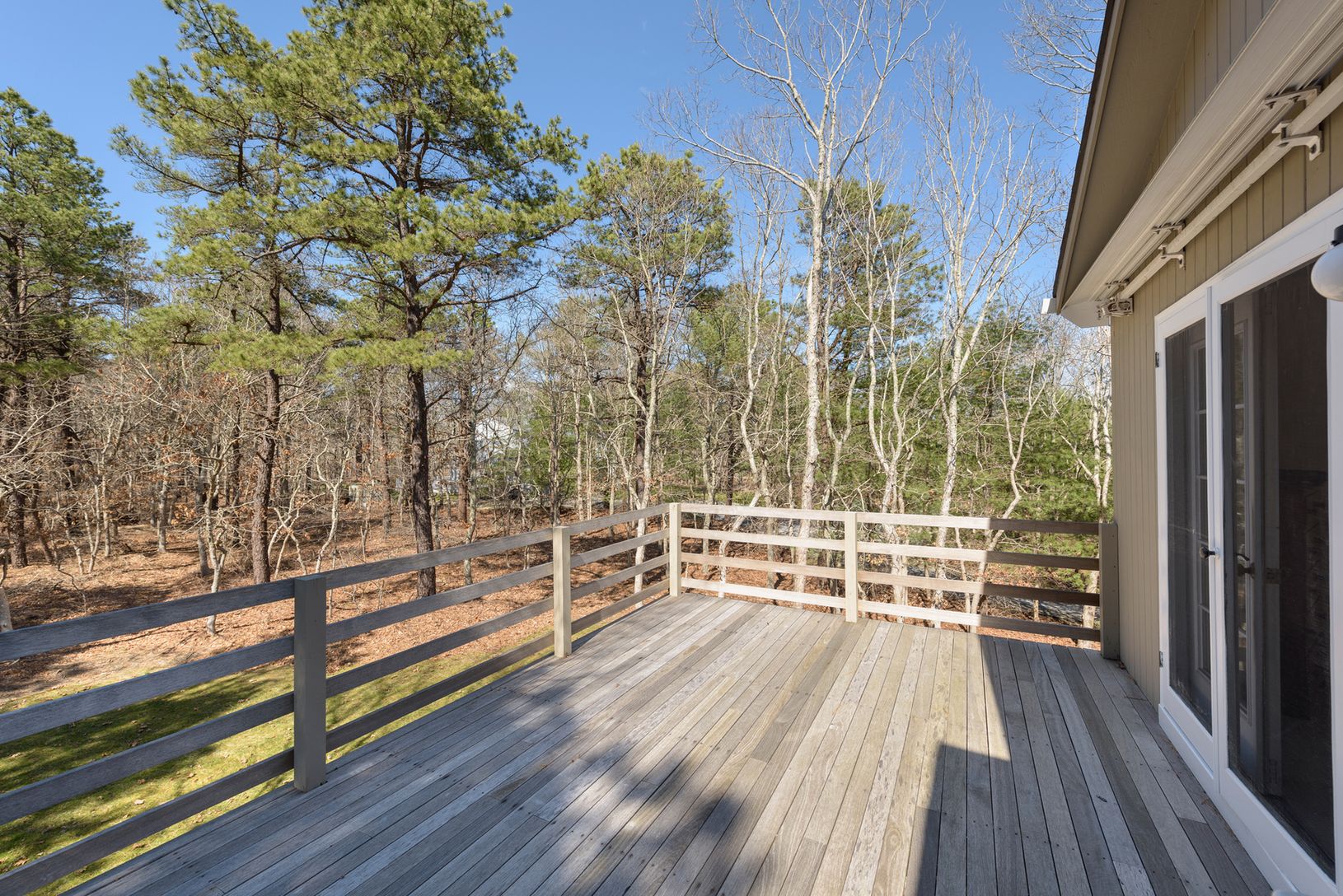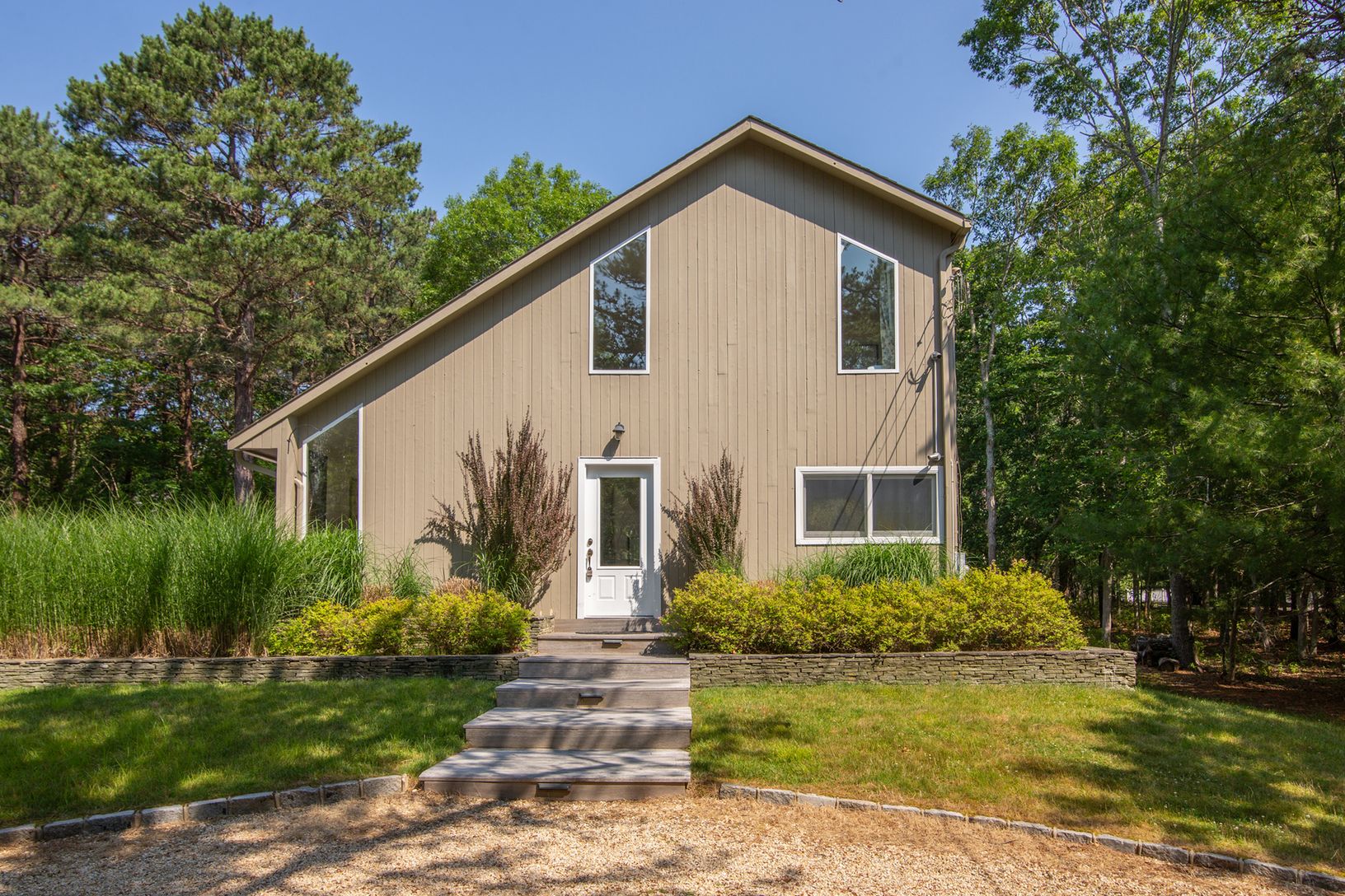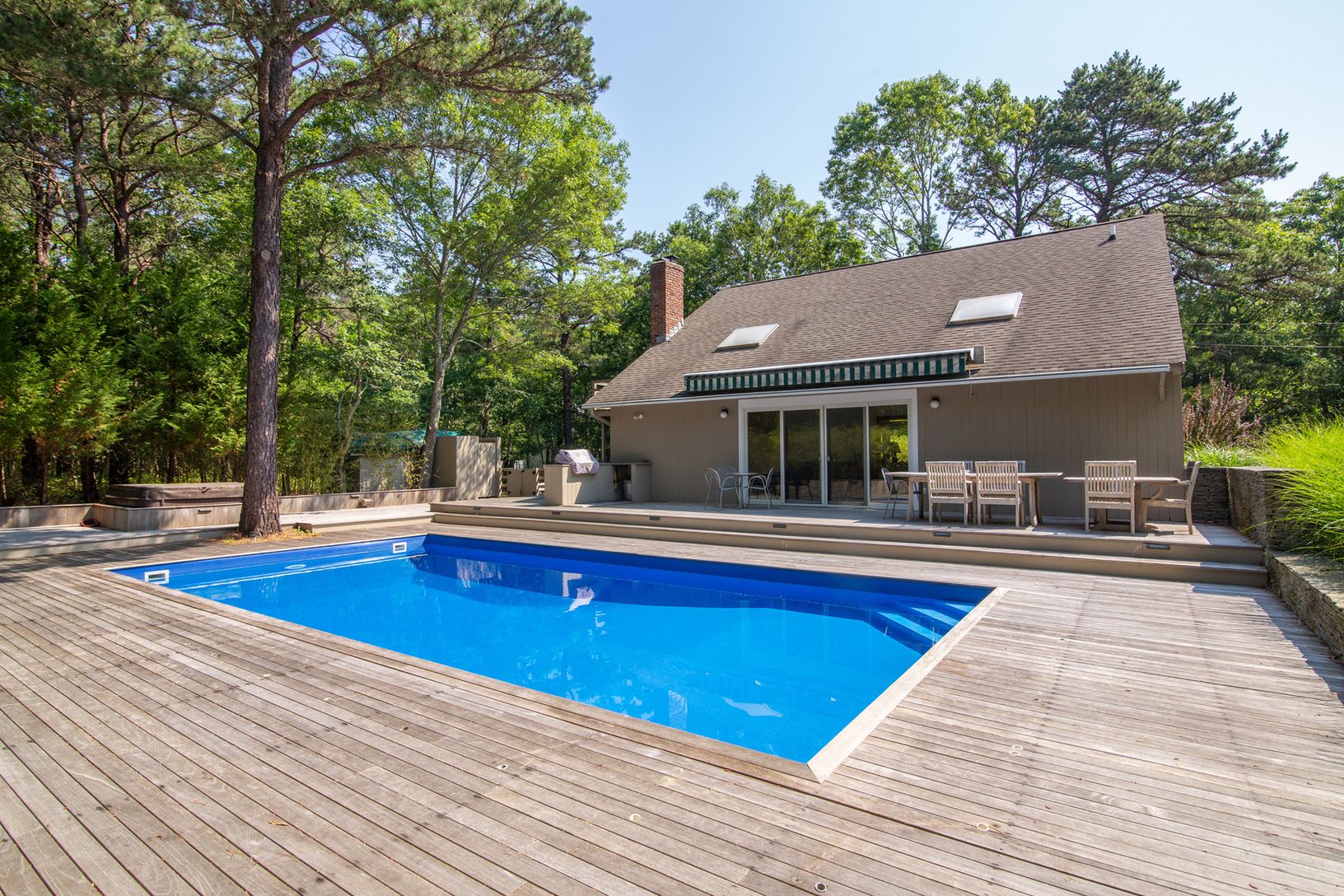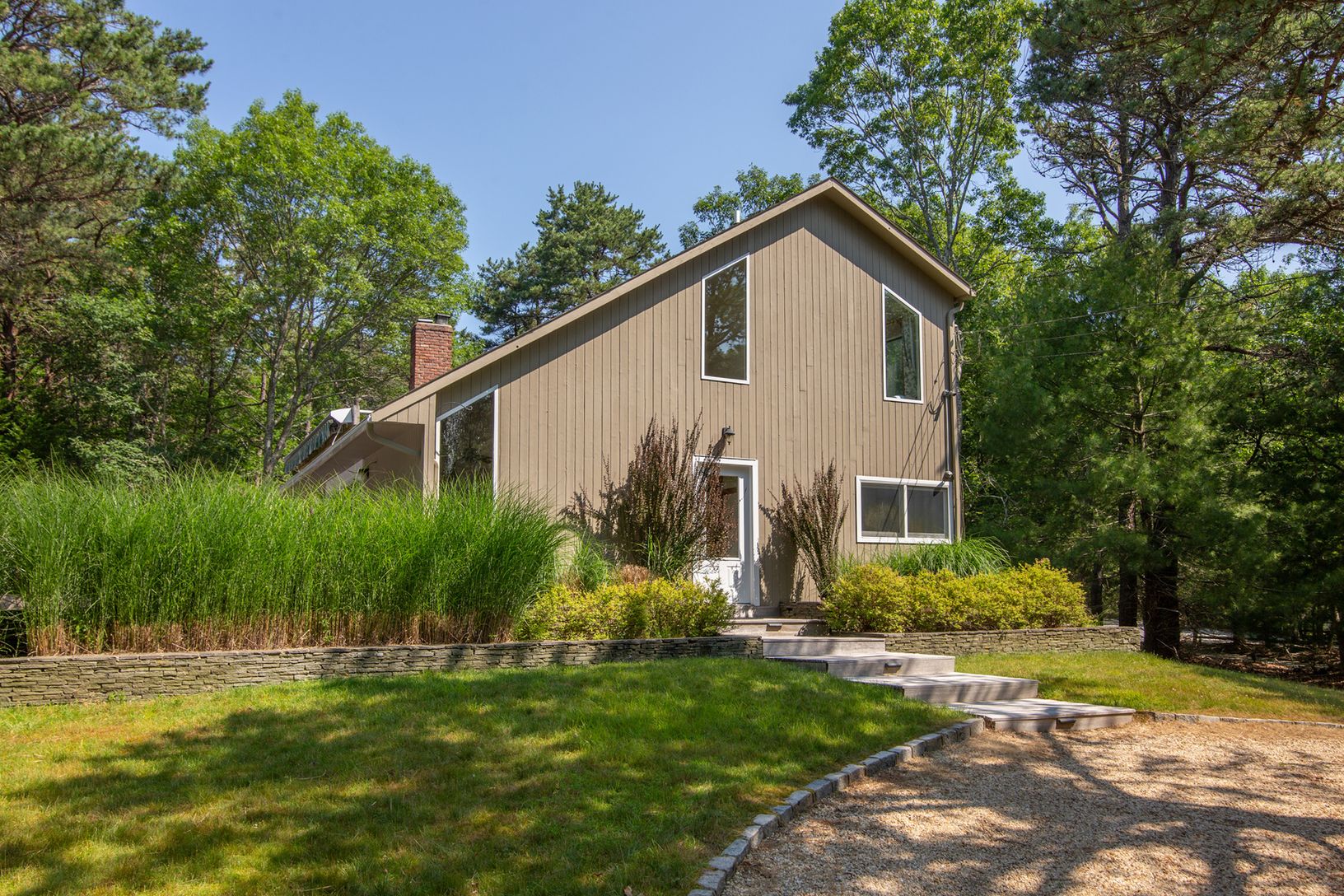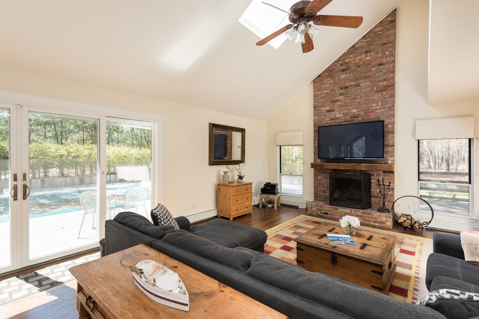 In the heart of the Hamptons, this spacious and serene contemporary home has all you need for summer fun or year-round living. Set on 1.29+/- acres the three bedroom, two bath home is beautifully maintained, with interiors that are bright and immaculate. On the open plan first floor the comfortable living area has a wood-burning fireplace set in a floor to ceiling brick wall, glass doors to extensive decking and flows to a sunny dining area. T