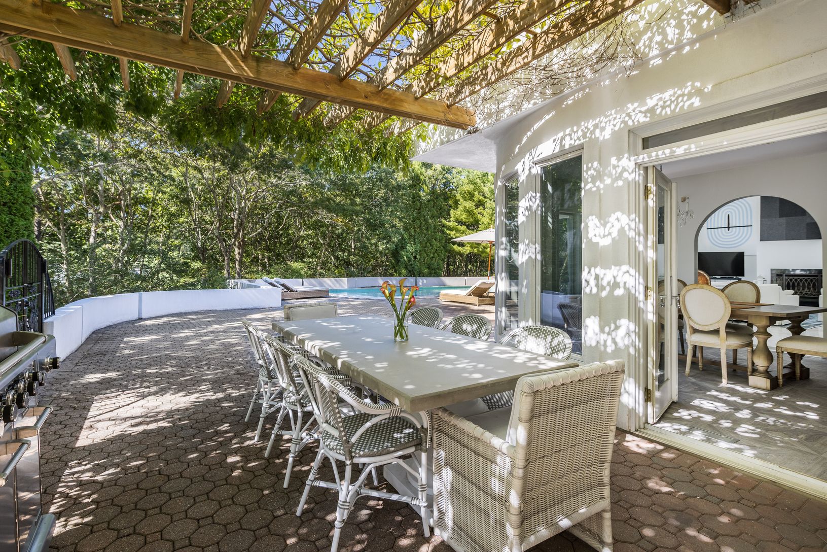 Enjoy this renovated 5 bedroom, 6 bath property set on 2+ acres with a heated gunite pool. The stucco exterior home with a Mediterranean flare features incredible artwork displayed throughout the house with a seamless flow as you are able to enjoy summer both inside and out. As you enter the front door you are welcomed into a double height ceiling great room with light pouring in. Enjoy two (2) large bedrooms on the ground floor and three (3)