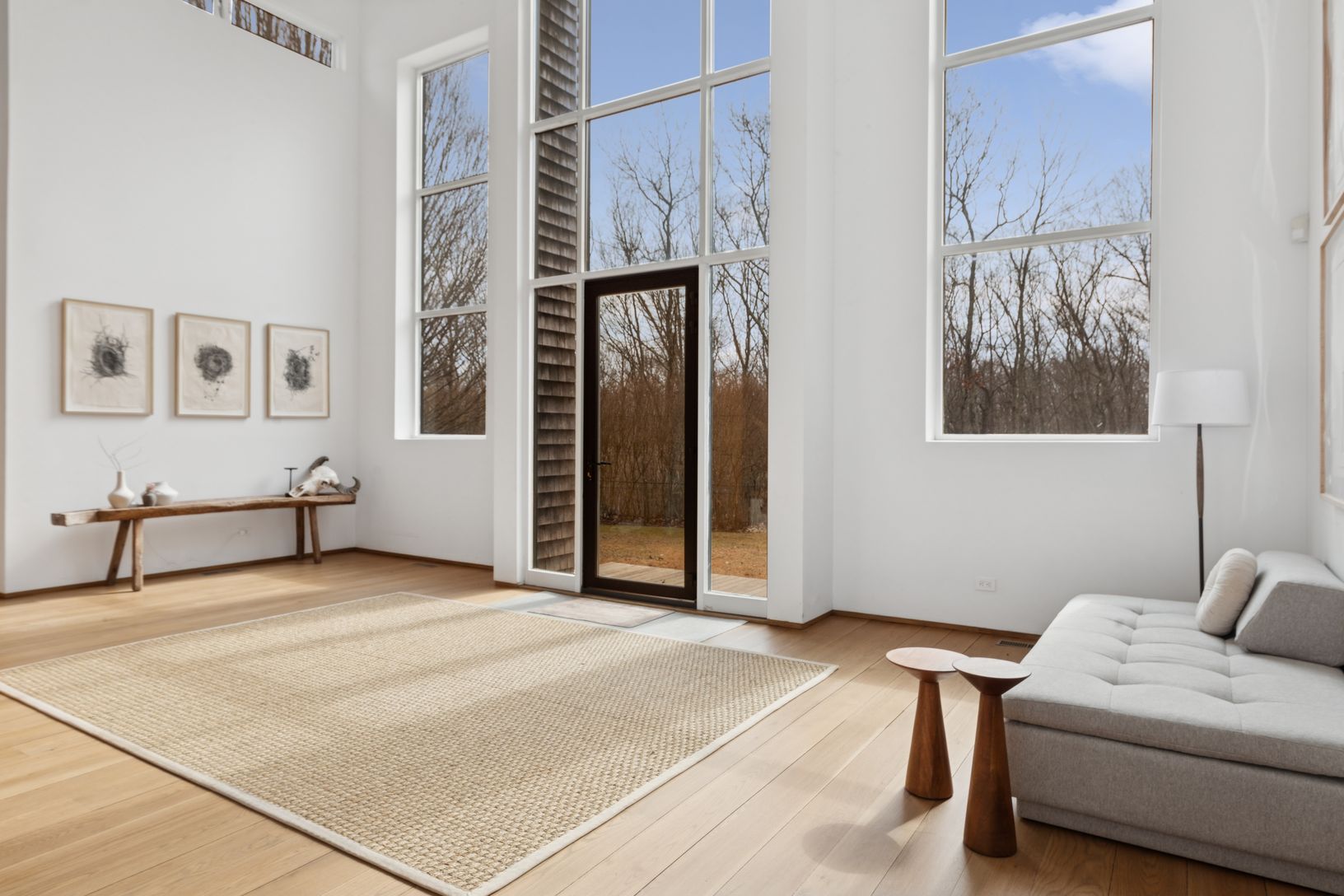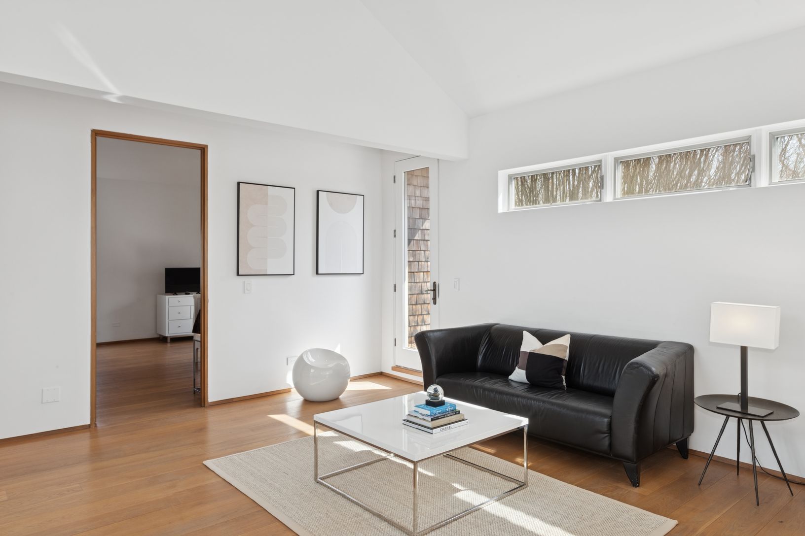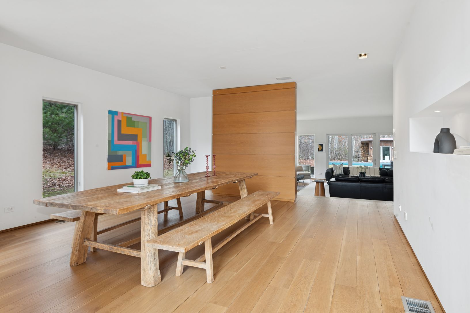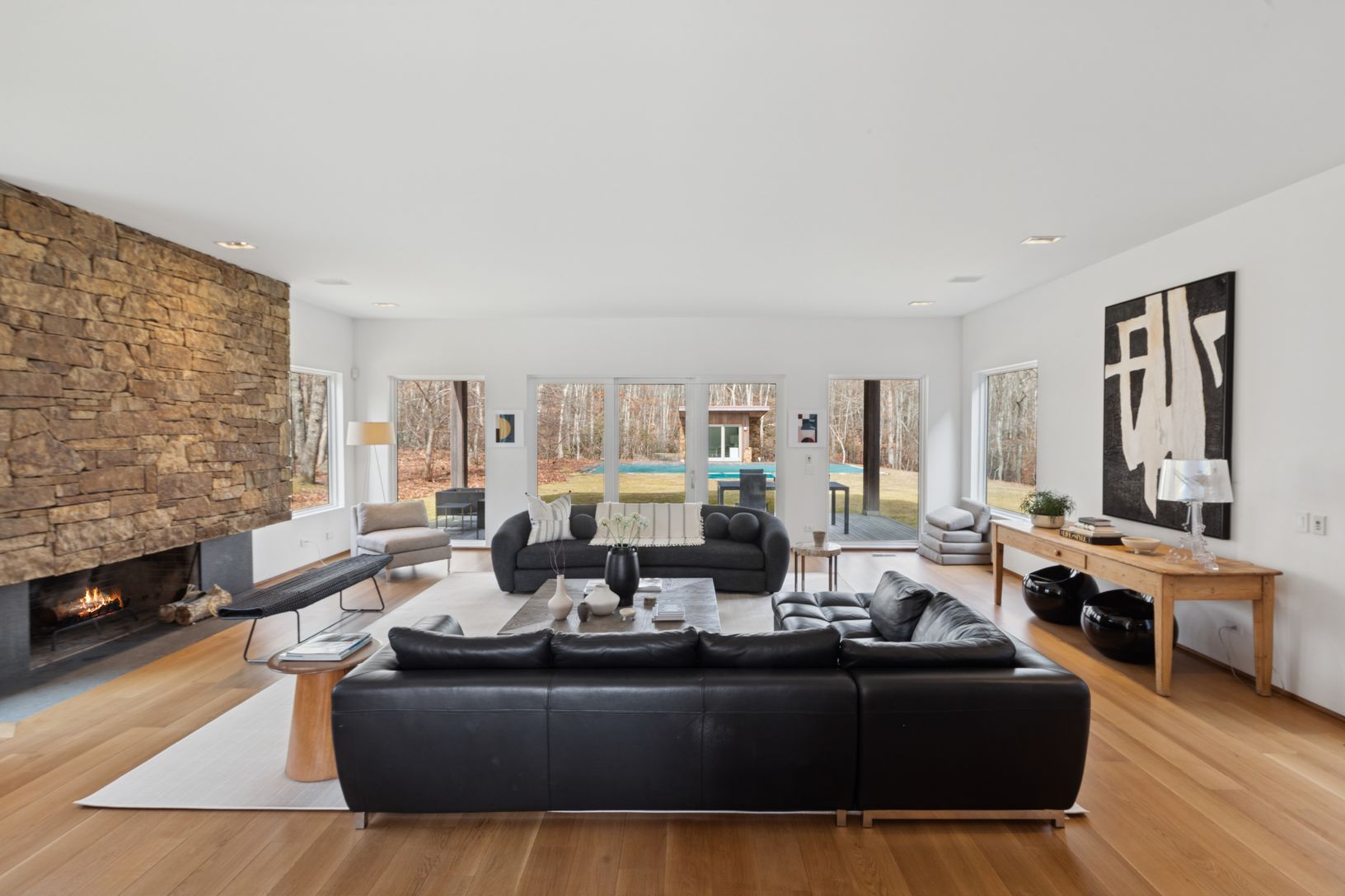 Summer in this exquisite 6,000+/- organic modern on 3.5+/- private acres. The light-filled home features 5 bedrooms and 5.5 baths, including the lower level, double-height ceiling heights, an open concept floorplan, and plenty of spaces to entertain throughout. The lush grounds feature a heated gunite pool and spa, and a spacious pool house with a full bath. Nestled on a quiet, tree-lined road, the home is just 3.2 +/- miles from Sag Harbor Vi