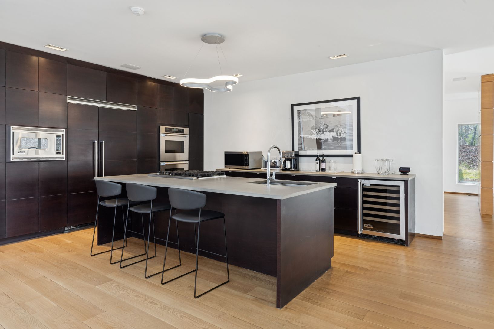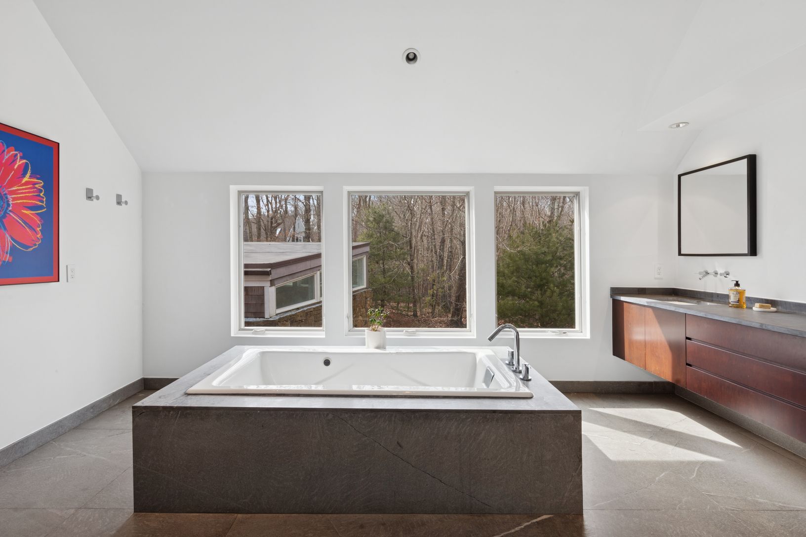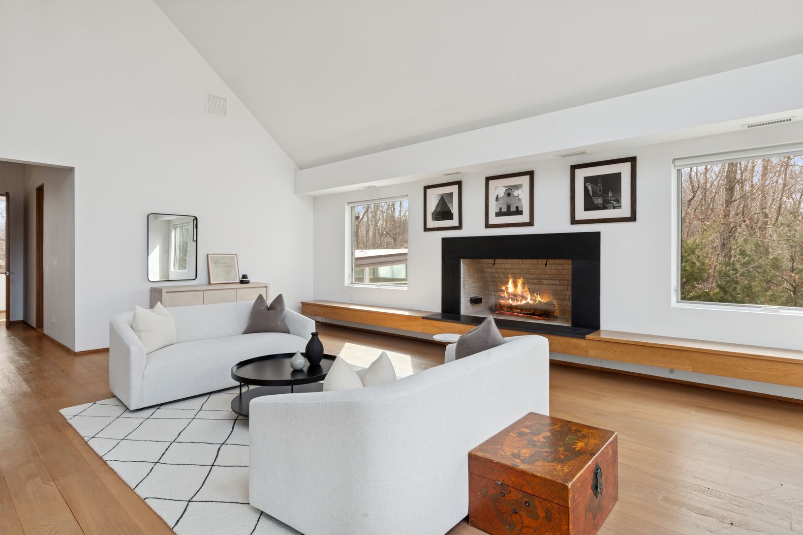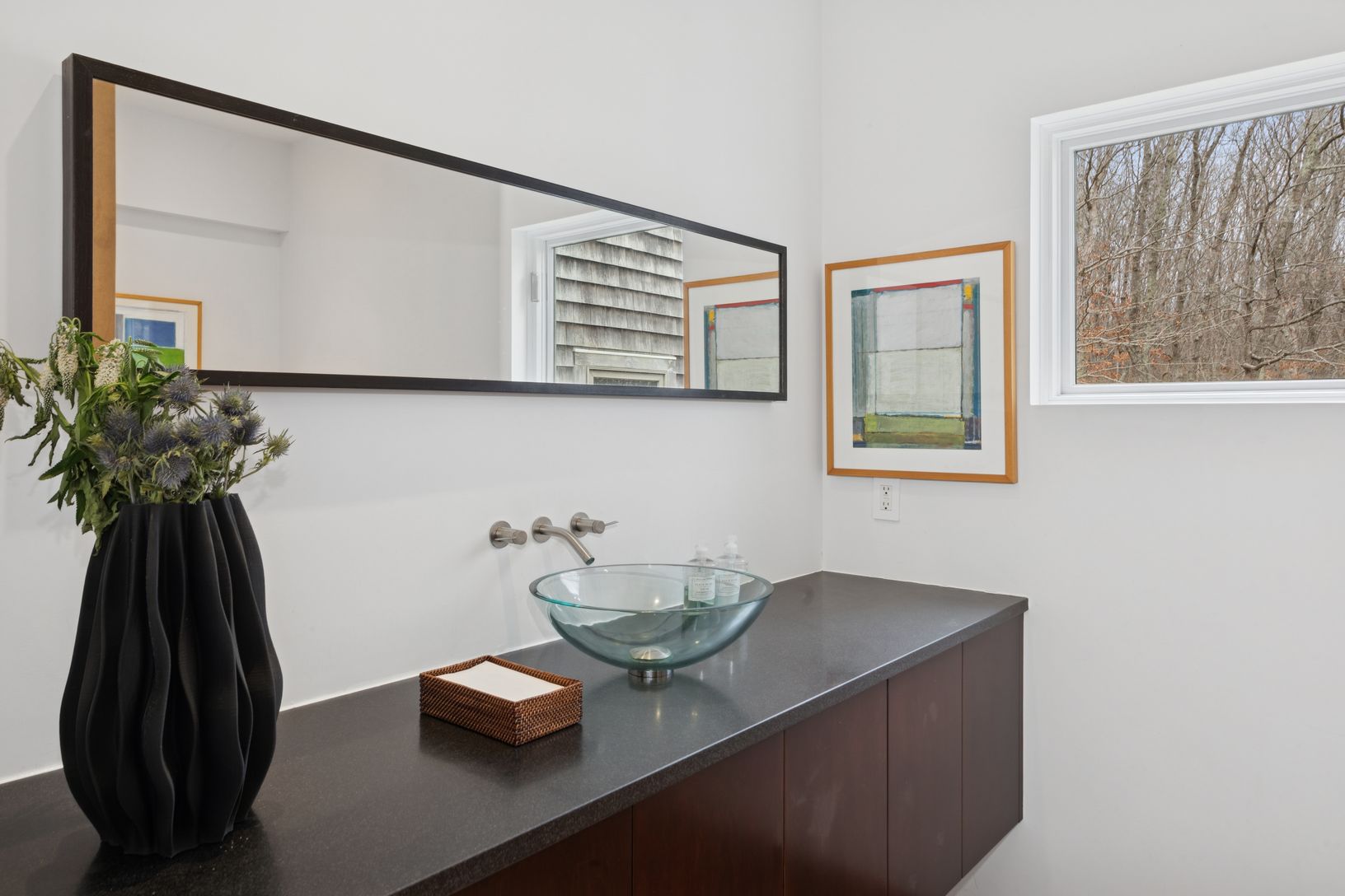 Summer in this exquisite 6,000+/- organic modern on 3.5+/- private acres. The light-filled home features 5 bedrooms and 5.5 baths, including the lower level, double-height ceiling heights, an open concept floorplan, and plenty of spaces to entertain throughout. The lush grounds feature a heated gunite pool and spa, and a spacious pool house with a full bath. Nestled on a quiet, tree-lined road, the home is just 3.2 +/- miles from Sag Harbor Vi