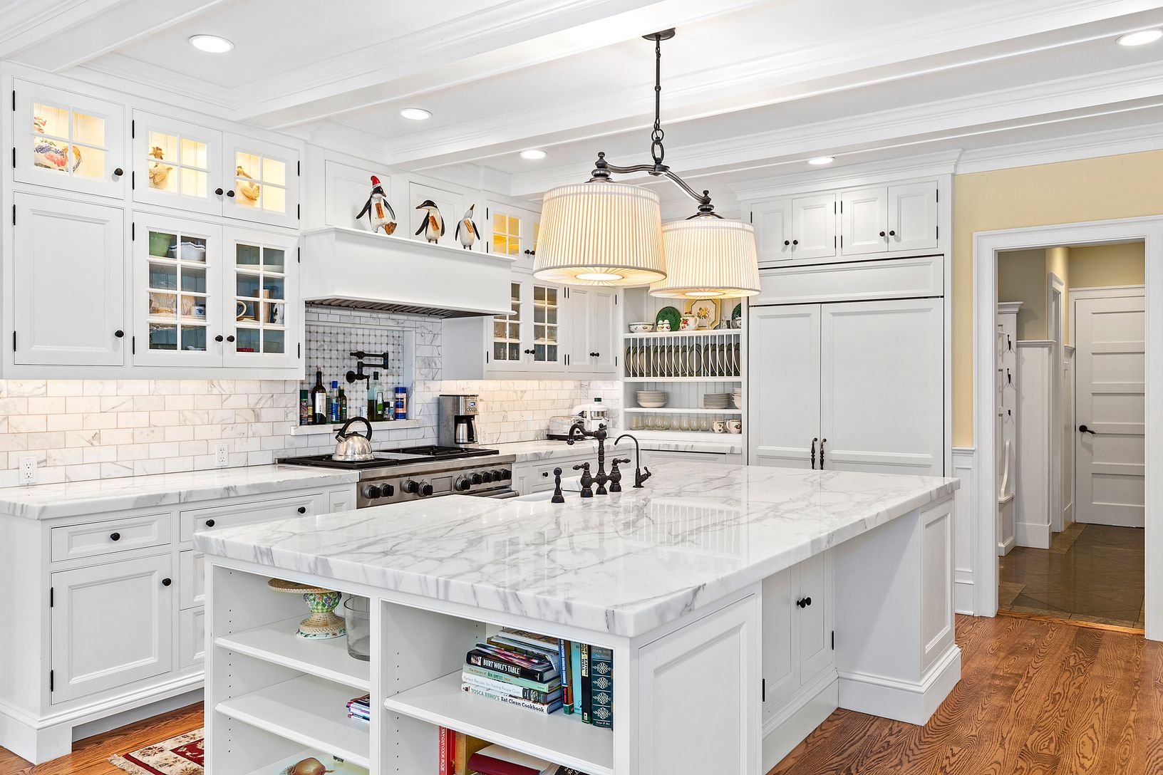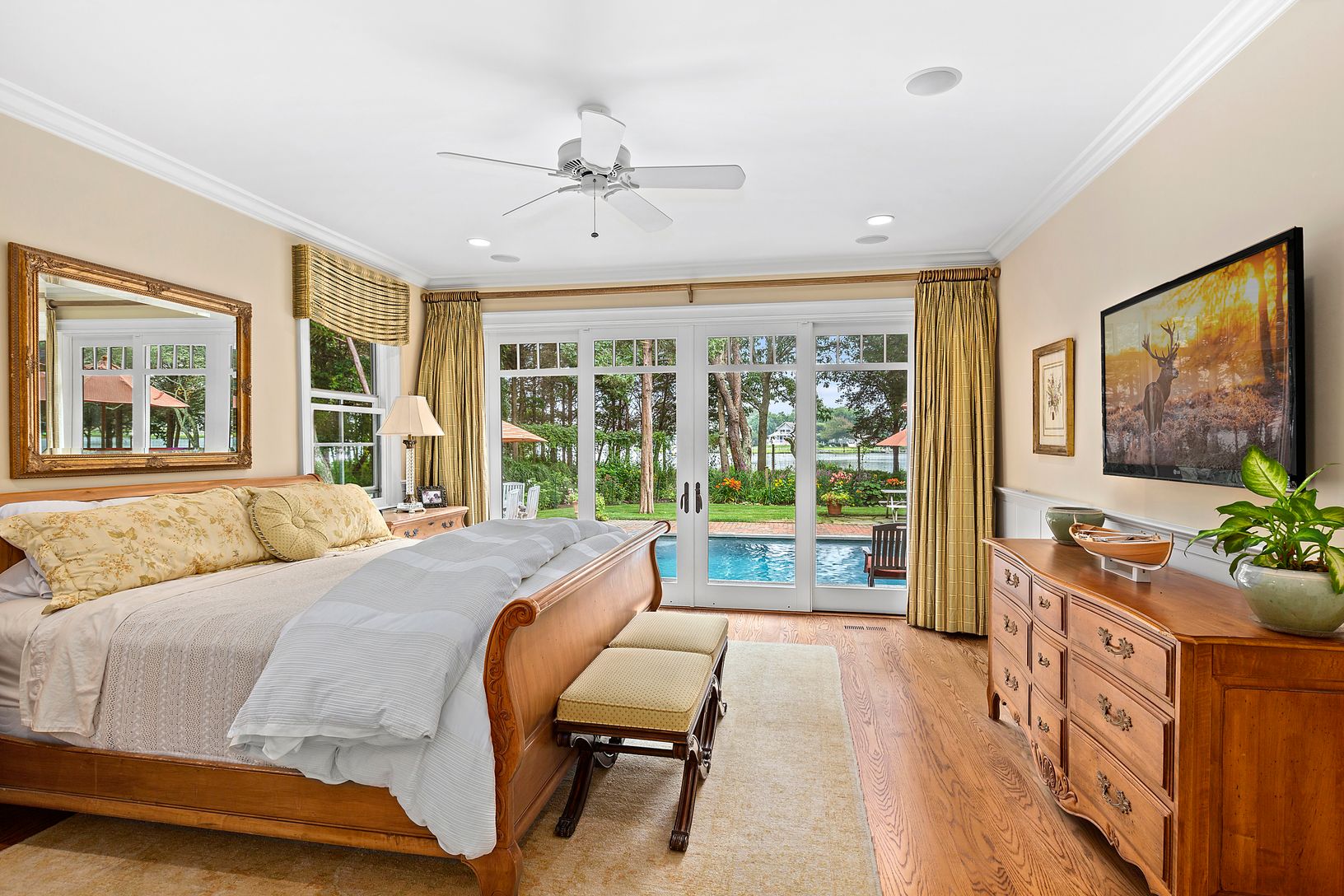 Bordering the 43 acre Maycroft Estate, this fabulous gated North Haven home is located in a quiet and private setting with beautiful open water views over Sag Harbor Cove. Undergoing a total renovation down to the studs in 2012, the 4500 square foot traditional set on a shy acre defines waterfront living in Sag Harbor. Exquisitely decorated with five bedrooms, including the first floor master suite opening to the pool area, four and one half