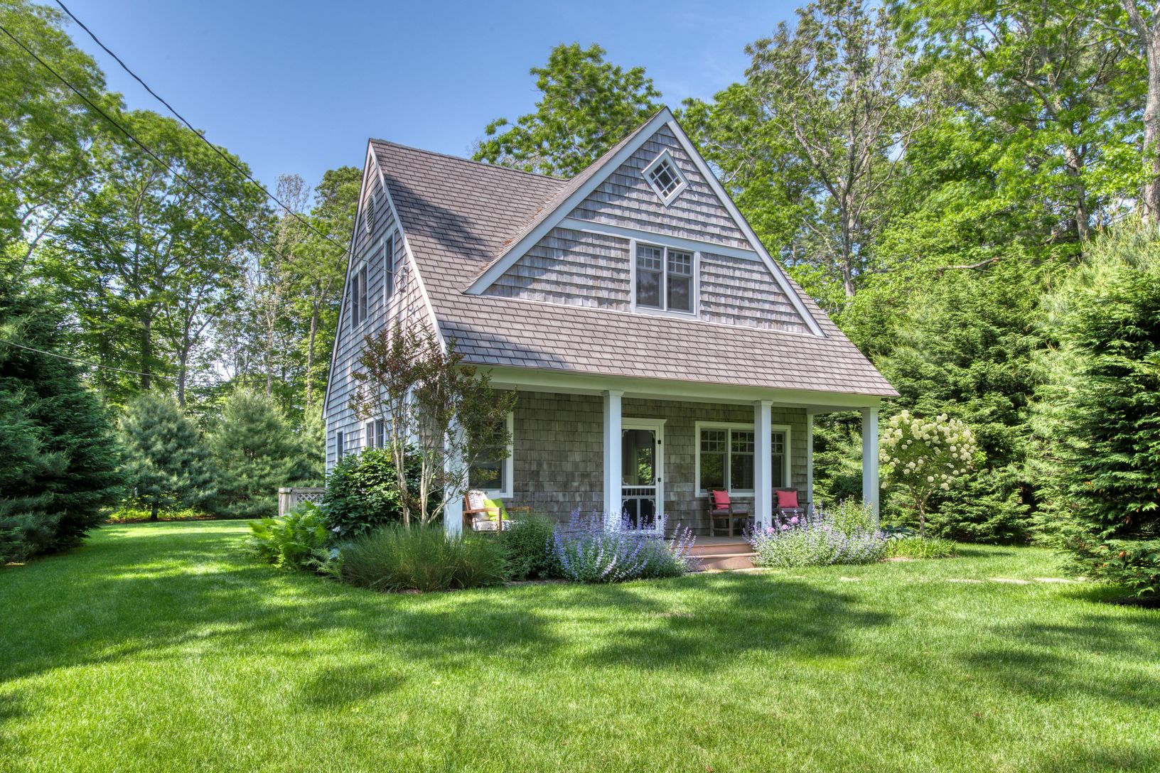 The perfect Hamptons Cottage lifestyle. Impeccably designed and detailed 2-bedroom, 2 1/2- bath home. The home has a covered front porch perfect for relaxing. The light filled living room and dining room are surrounded by wall to ceiling windows leading out to a large deck. The spacious galley kitchen features granite counter tops, shaker style cabinets and stainless steel appliances. The generous primary master suite has a walk- in closet a b