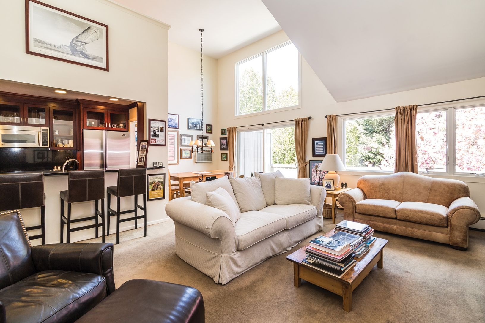 Enjoy year round carefree co-op living in this light and bright two bedroom, two bath home located south of the highway between East Hampton and Amagansett in the Hampton Mews community. This north facing, upper floor home has a terrific outdoor deck, wide enough for both a shady dining table and a sunny lounging area. Inside, cathedral ceilings soar above the fireplace in an open living room. Just across the seated counter is the kitchen with